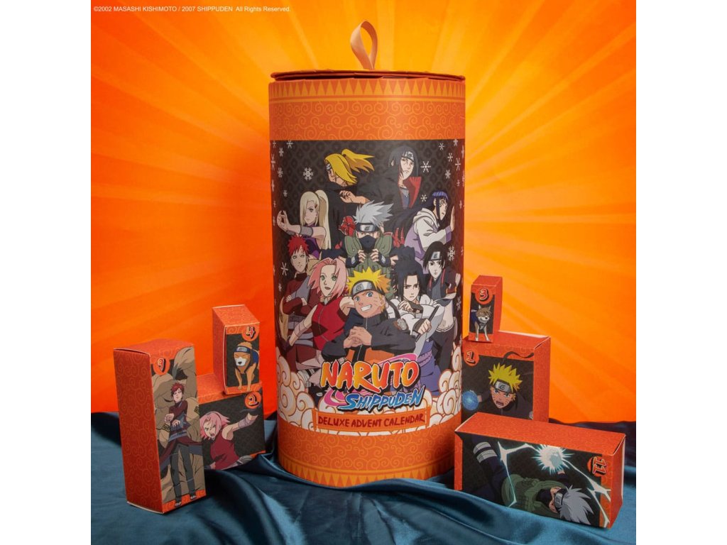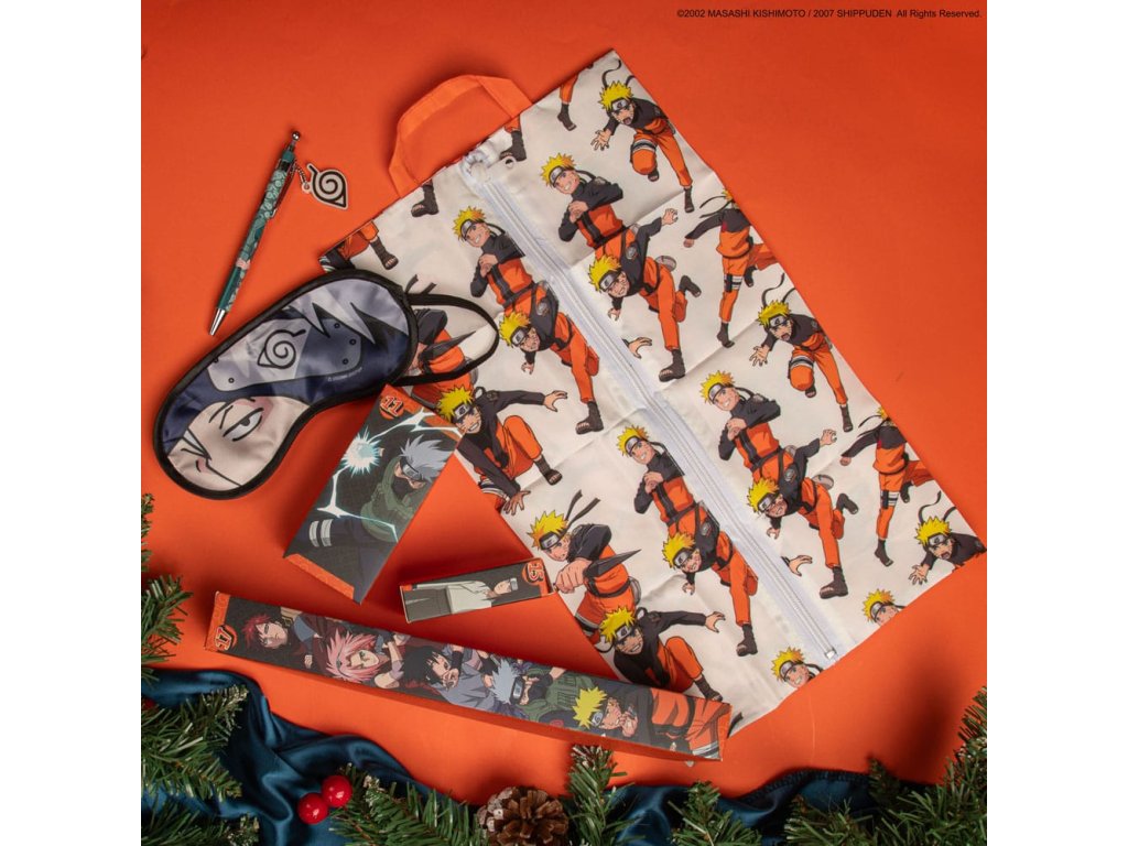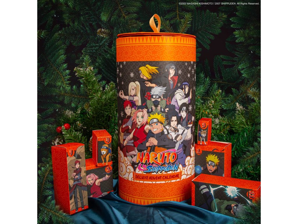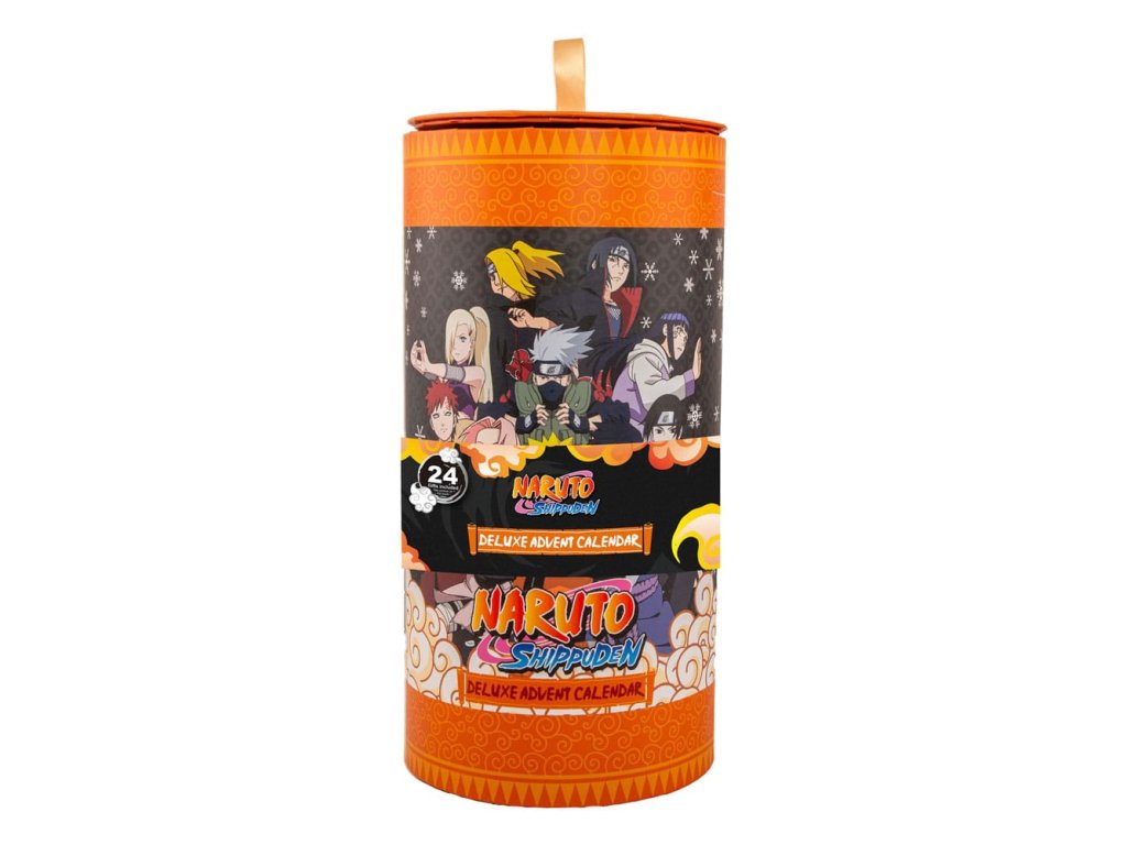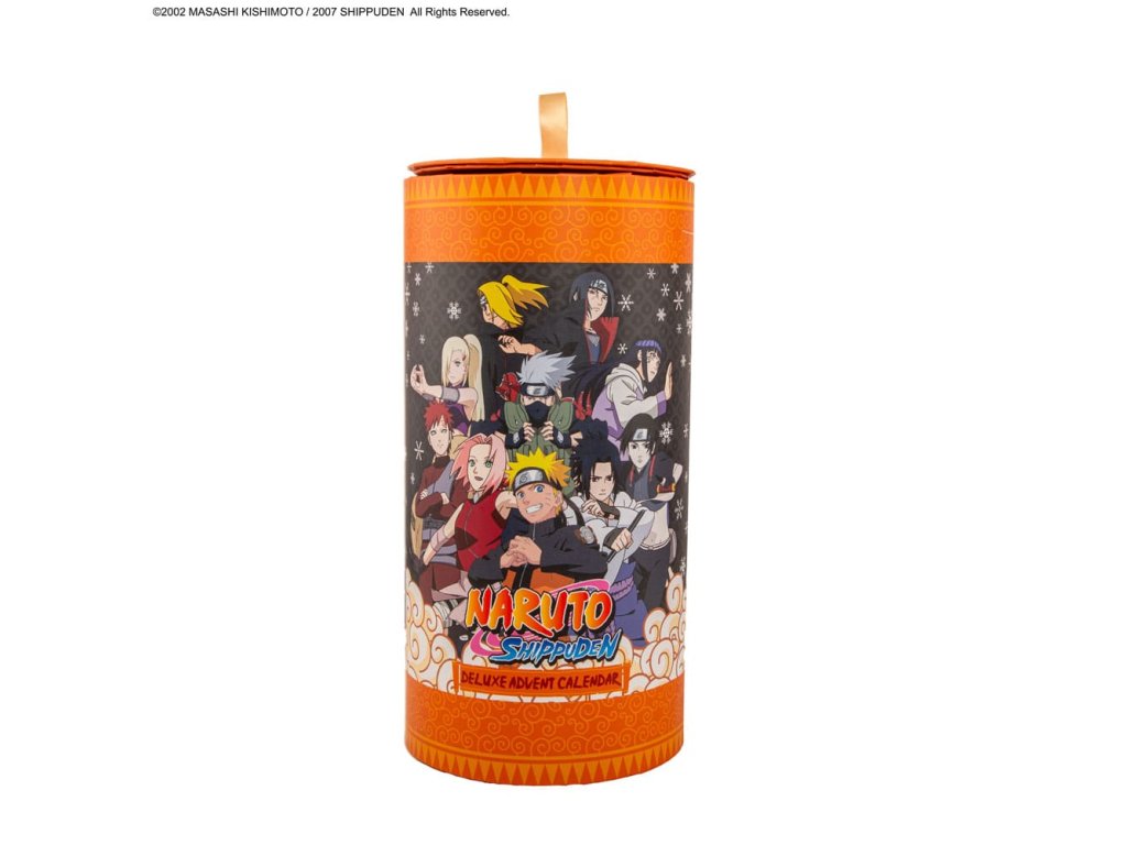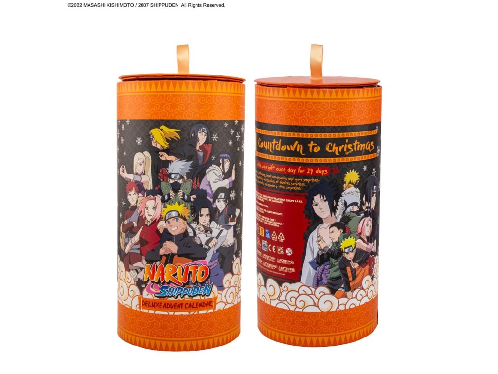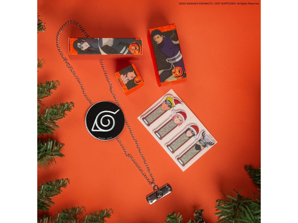 Oficiálne licencovaný adventný kalendár s 24 darčekmi s motívom Naruta (odznak, ponožky, vrecko na topánky, pero s odznakom, maska na spanie, kovová kľúčenka, čelenka, lentikulárny odznak, nálepka svietiaca v tme, akrylová ozdoba, náhrdelník, mäkký poznámkový blok, meter, nákupná taška, šnúrky do topánok, paličky na sushi, sada nálepiek, odznak na šnúrky, guma, lentikulárny magnet, záložka do knihy, pečiatka, prívesok na batožinu, zrkadlo)