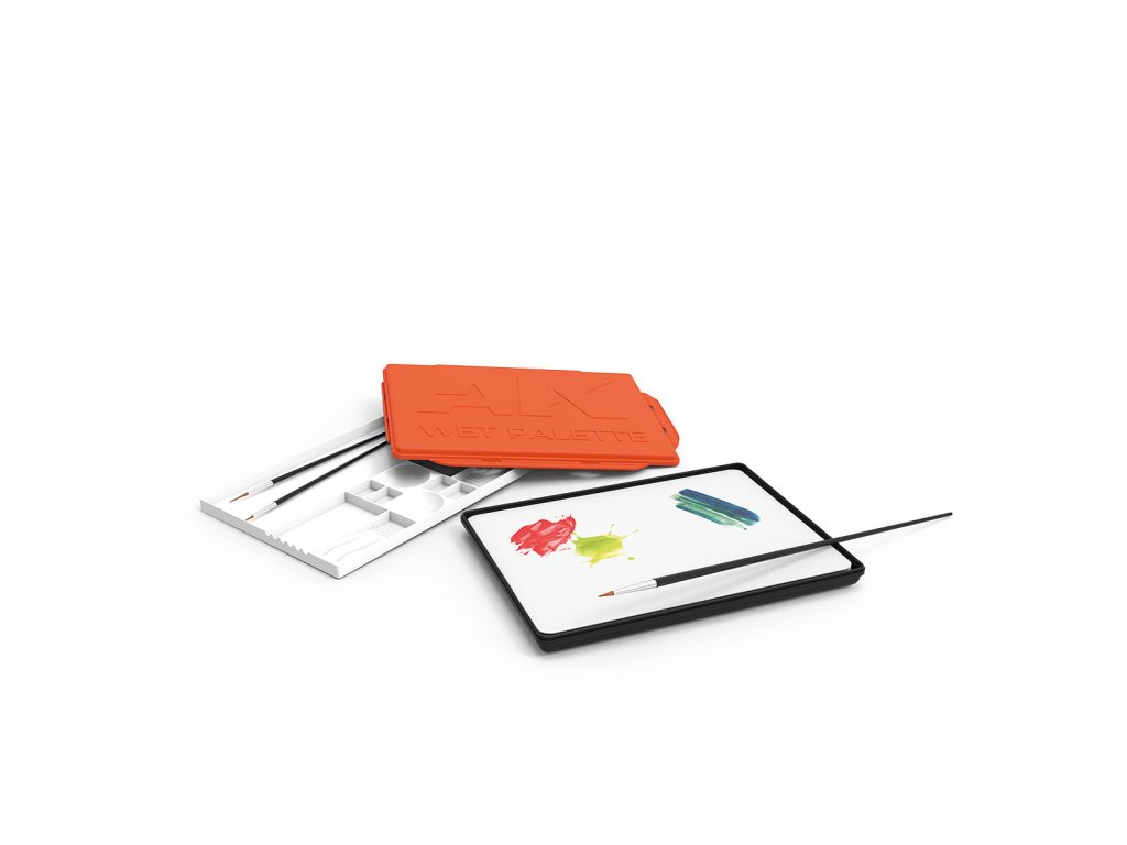 Paletka AK Interactive: Wet Palette má ideálnu veľkosť a vzduchotesné viečko, aby farby vydržali dlhšie. Je vybavená praktickým zásobníkom s priehradkami na miešanie farieb alebo odkladanie príslušenstva. Mokrá paleta sa používa najmä na maľovanie figúr, ale je čoraz obľúbenejšia u všetkých, ktorí pracujú s akrylovými farbami. Farby v nej vydržia čerstvé niekoľko hodín a možno ju skladovať v chladničke. Obsahuje 40 listov papiera a 2 špongie. Rozmery: 23,5 x 17,5 x 2,5 cm. Bavlnená tkanina na udržanie vlhkosti papiera palety. Má neutrálnu bielu farbu, ktorá neovplyvňuje viditeľnosť farieb a uľahčuje presné miešanie. Pre správnu funkciu sa musí udržiavať nasiaknutá vodou. Prírodný výrobok bez ošetrenia, aby sa zabránilo reakcii s farbami. Špeciálny vysokokvalitný vymeniteľný papier (40 g/m2) na udržiavanie vlhkosti akrylových farieb. Obsahuje tenkú silikónovú vrstvu, ktorá umožňuje prenos vlhkosti, ale zabraňuje prestupu vody a rozpúšťaniu farby. Praktický zásobník na odkladanie príslušenstva s tesným uzáverom.Dodatočné parametre