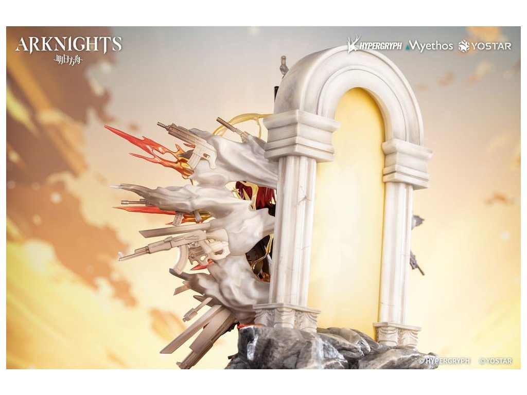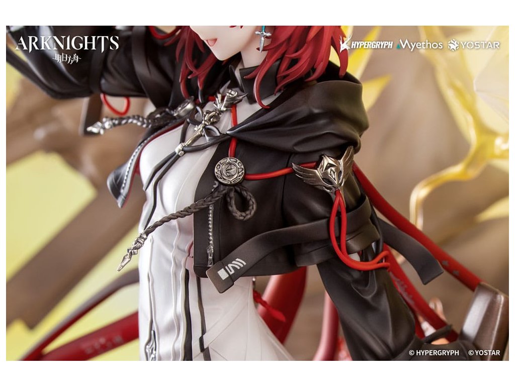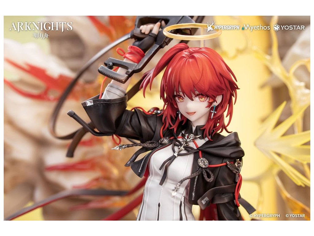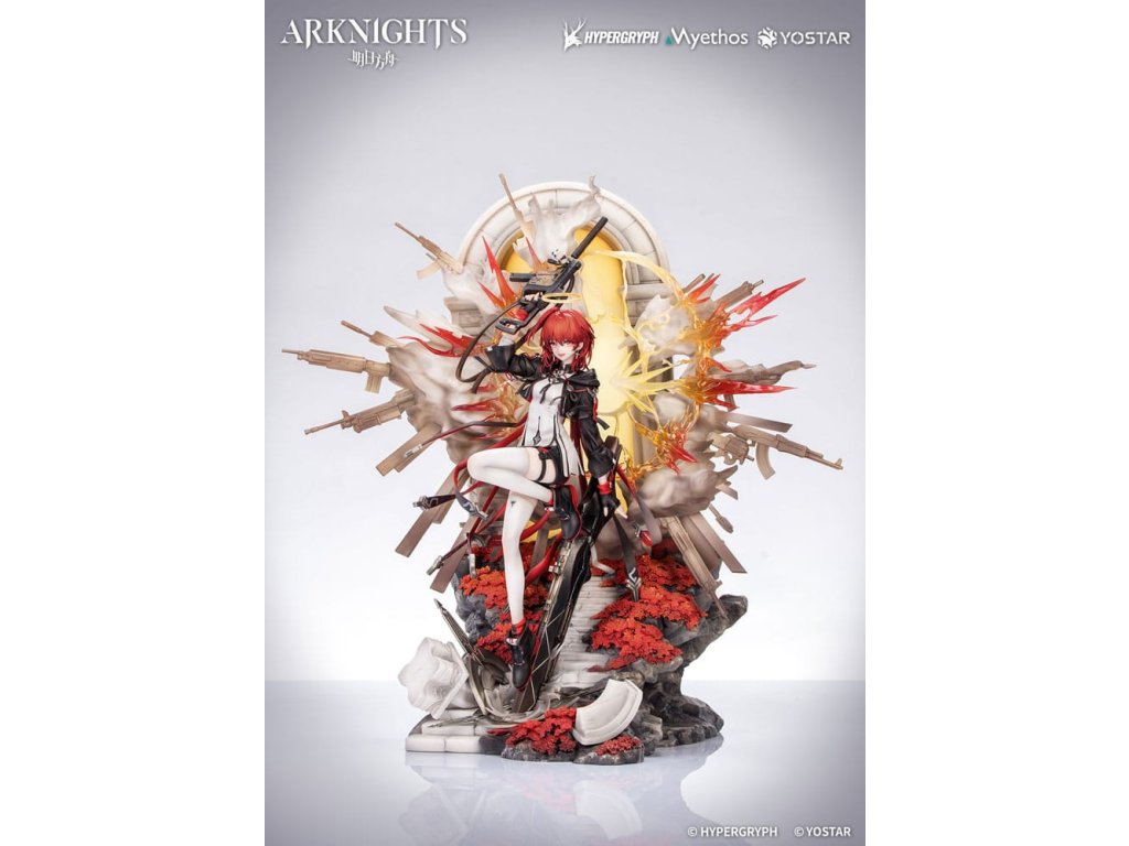 Z obľúbenej hry Arknights prichádza figúrka Exusiai New Covenant: Elite 2 VER. v mierke 1/7, ktorá bude čoskoro dostupná! Exusiai s červenými vlasmi tancuje vo vetre, ohýba jednu nohu a šliape na svoju strážnu zbraň. Ranné slnko na ňu vrhá jemné svetlo a ona vyžaruje radostný a bezstarostný úsmev. Figúrka má viacvrstvový povrch so svetlejšími tónmi na vrchu a tmavšími tieňmi pod ním, čo verne znázorňuje svetlo a atmosféru z ilustrácie. Zbraň strážcu je vymodelovaná s exkluzívnymi detailmi a dokončená metalickou farbou. Svietiace krídla, obrovské koleso a pušný prach sú vytvorené z priehľadných efektných dielov: krídla a aureola sa spájajú a vybuchujú do svetla ako plamene zapaľujúce oblohu. Viacúčelové zbrane sa rozvíjajú v dyme a ohlasujú príchod posvätného dažďa striel. Zvetrané kamenné schody vedú nahor s červenými kvetmi ukrytými medzi sutinami. Na konci schodov sa polopriehľadný oblúk leskne mäkkým božským svetlom. Doktor, postav sa po jej boku a raduj sa z tohto evanjelia víťazstva!Dodatočné parametre