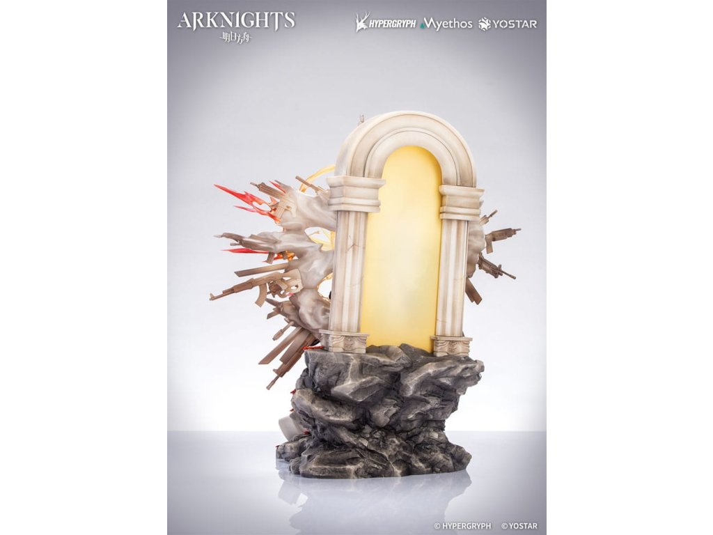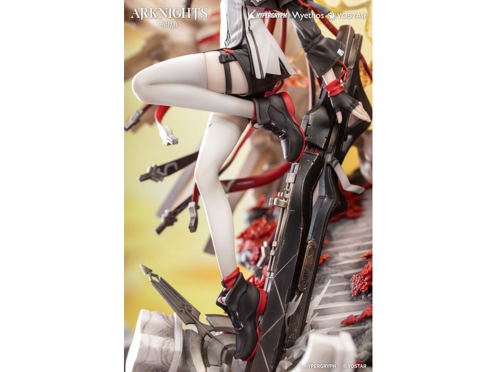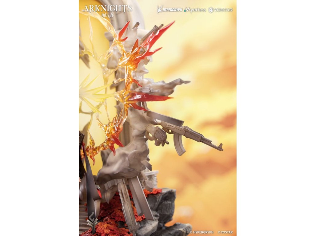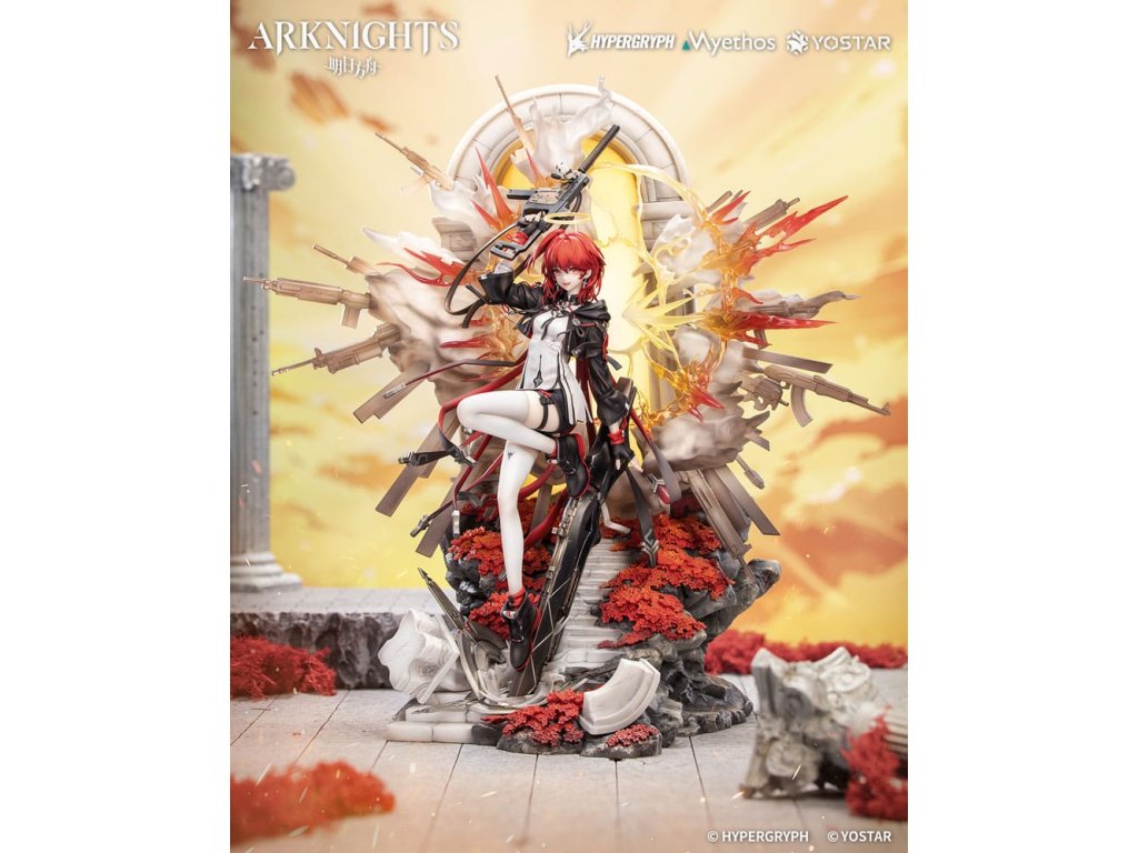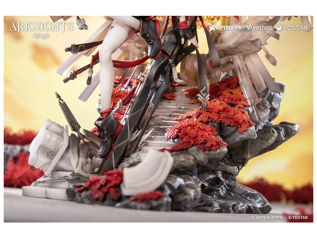 Z obľúbenej hry Arknights prichádza figúrka Exusiai New Covenant: Elite 2 VER. v mierke 1/7, ktorá bude čoskoro dostupná! Exusiai s červenými vlasmi tancuje vo vetre, ohýba jednu nohu a šliape na svoju strážnu zbraň. Ranné slnko na ňu vrhá jemné svetlo a ona vyžaruje radostný a bezstarostný úsmev. Figúrka má viacvrstvový povrch so svetlejšími tónmi na vrchu a tmavšími tieňmi pod ním, čo verne znázorňuje svetlo a atmosféru z ilustrácie. Zbraň strážcu je vymodelovaná s exkluzívnymi detailmi a dokončená metalickou farbou. Svietiace krídla, obrovské koleso a pušný prach sú vytvorené z priehľadných efektných dielov: krídla a aureola sa spájajú a vybuchujú do svetla ako plamene zapaľujúce oblohu. Viacúčelové zbrane sa rozvíjajú v dyme a ohlasujú príchod posvätného dažďa striel. Zvetrané kamenné schody vedú nahor s červenými kvetmi ukrytými medzi sutinami. Na konci schodov sa polopriehľadný oblúk leskne mäkkým božským svetlom. Doktor, postav sa po jej boku a raduj sa z tohto evanjelia víťazstva!Dodatočné parametre