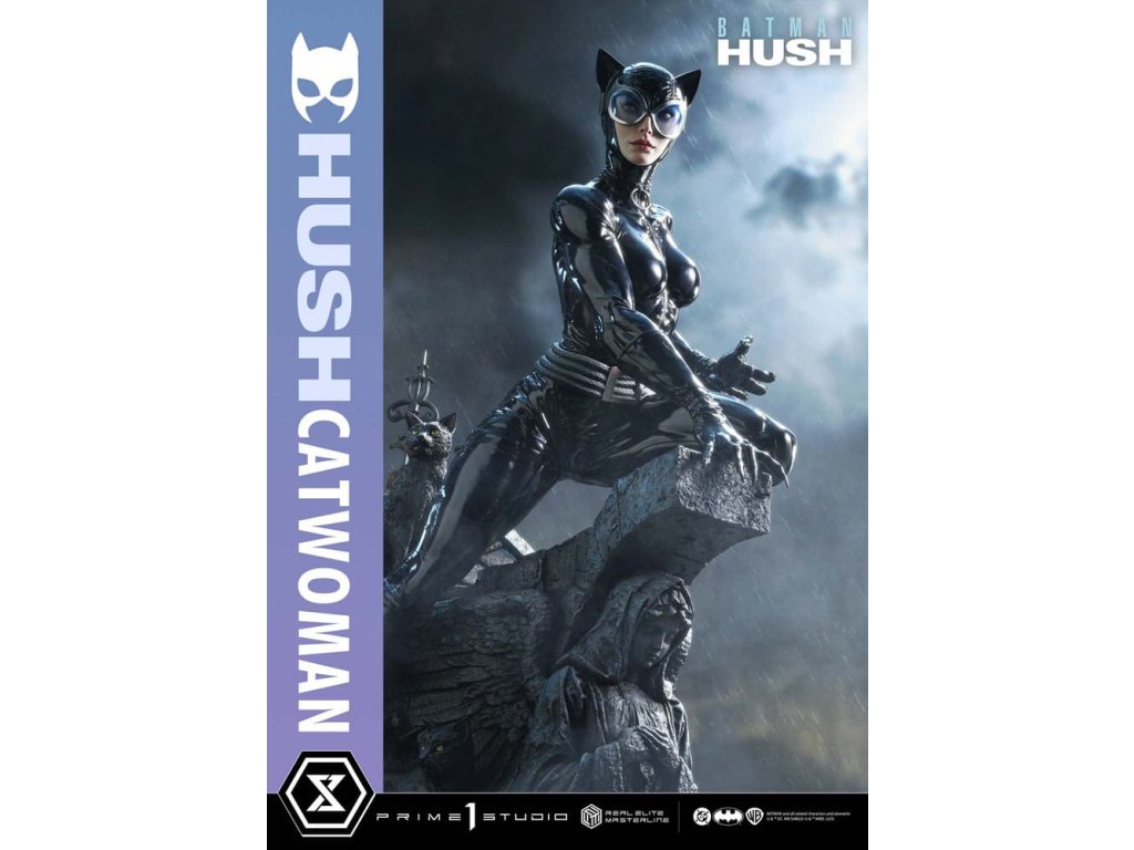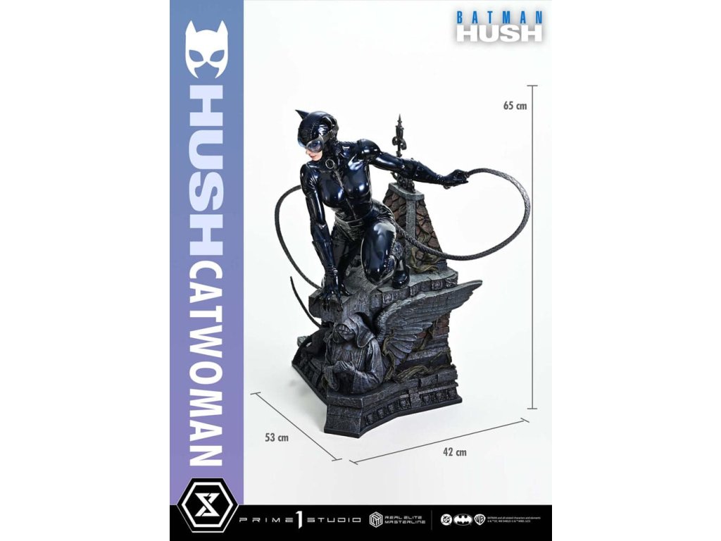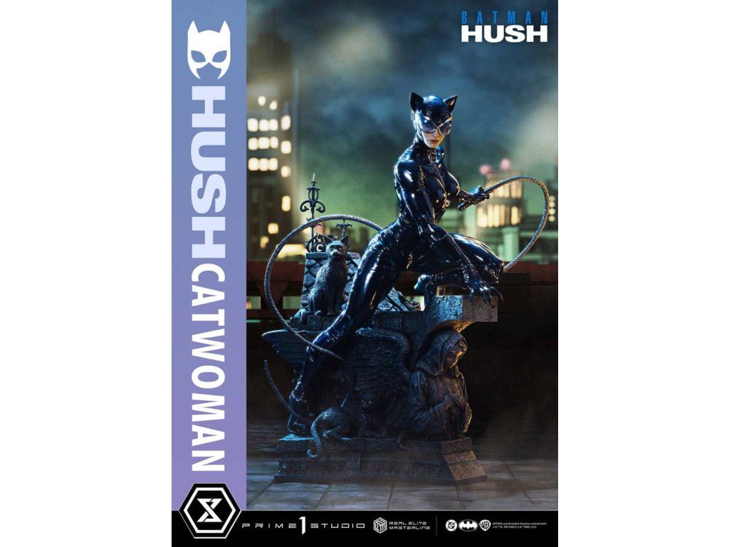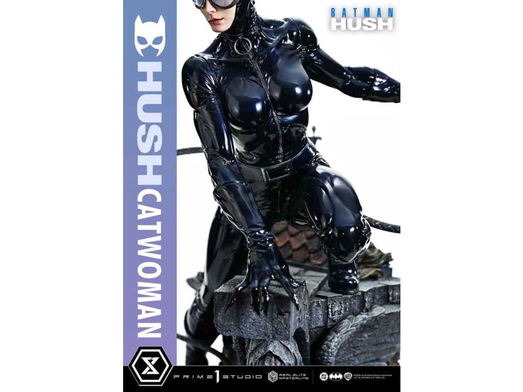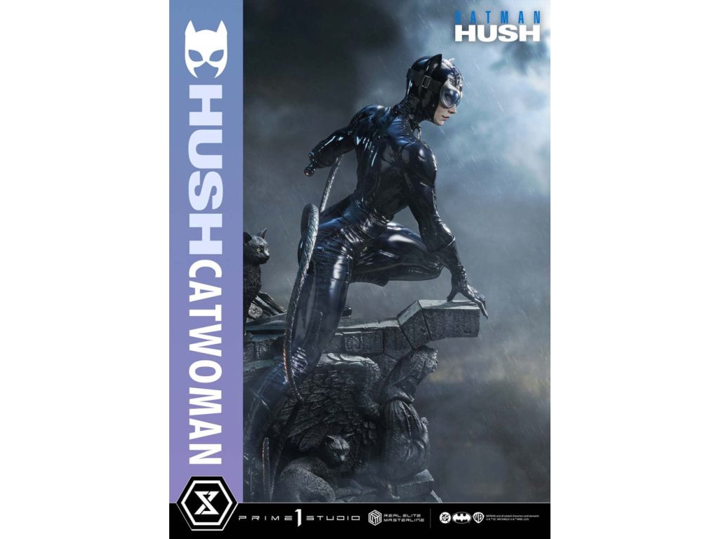 Oblek, ktorý sa v noci roztopí. Pohľad, ktorý pozná význam lásky. Zrelo osudová žena sa objavuje v skutočných farbách a podobe. Z legendárneho príbehového oblúka "Batman: Hush" - prelomového príbehu, ktorý zobrazil veľkú skupinu hrdinov a zloduchov, ktorí predbehli svoju dobu. Z tohto míľnika v histórii DC Comics sa Catwoman pripája k sérii Real Elite Masterline. Prostredníctvom série záhadných udalostí táto femme fatale učí Batmana významu lásky a dôvery. Jej zrelý pôvab je prenesený do 1/3 mierky. Táto socha vychádza z vycibreného vizuálneho štýlu Jima Leeho a snaží sa o realistickú interpretáciu komiksového sveta. Jej stojaca postava na streche zachytáva úchvatný pocit prítomnosti - tak živej, že cítite jej dych. Hlboké dúhovky viditeľné cez jej okuliare. Karmínové pery, ktoré vyžarujú elegantnú zmyselnosť. Plynulý prechod, ktorý definuje tón jej pleti. Jej elegantná tvár je vytvorená pomocou špičkových techník sochárstva a maľby štúdia Prime 1. Priliehavý kostým má lakovaný lesk, dokončený v tóne, ktorý akoby sa rozplýval v noci. Špeciálne navrhnutý podstavec je sám o sebe umeleckým dielom. Socha okrídleného anjela, dvojica mačiek po jej boku a poklady ukryté pod tehlami sú motívy, ktoré odrážajú jej charakter v architektúre Gothamu. Vrcholom sochárskeho a maliarskeho majstrovstva štúdia Prime 1 je Catwoman z filmu "Batman: Hush", ktorá do vašej zbierky prinesie nádych skutočnej romantiky a sofistikovanosti. Špecifikácie.Dodatočné parametre