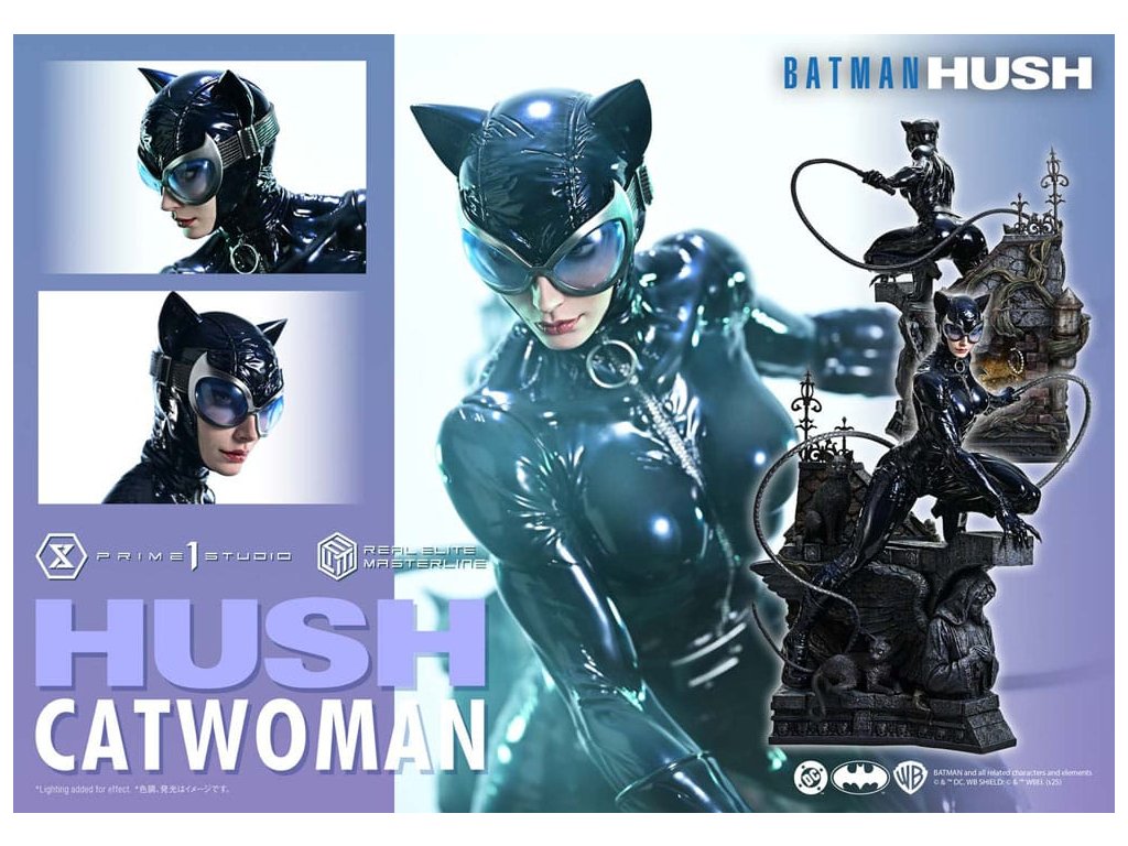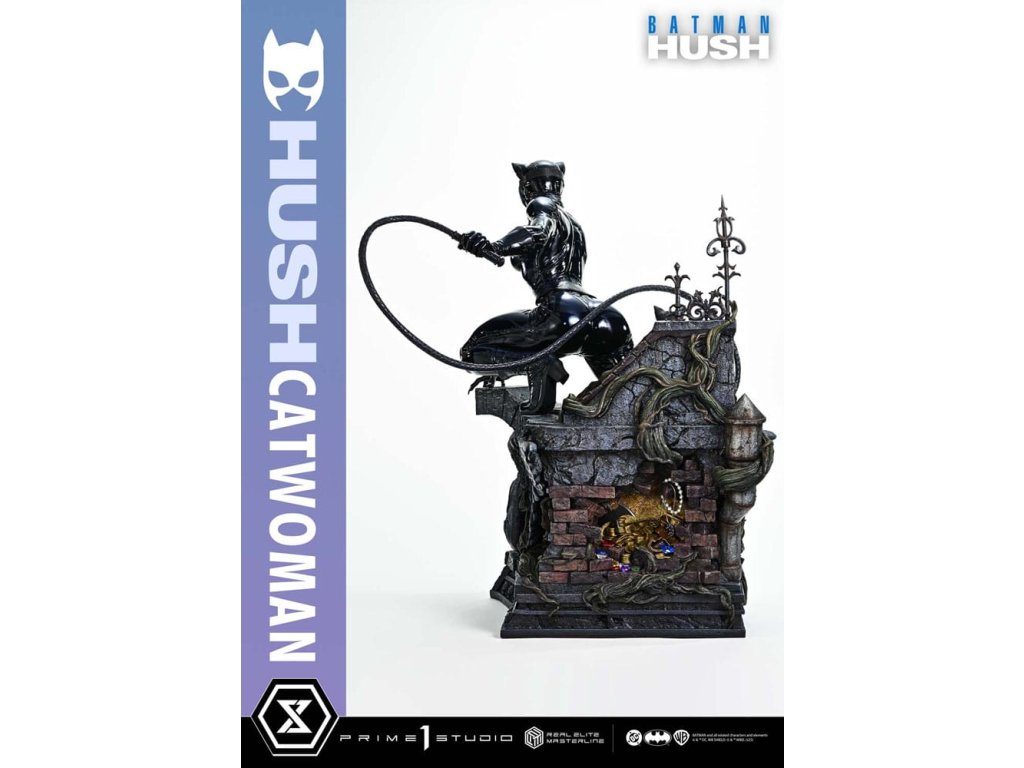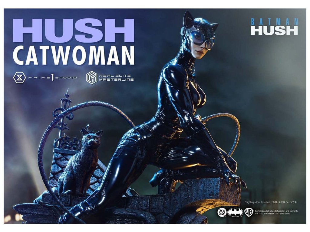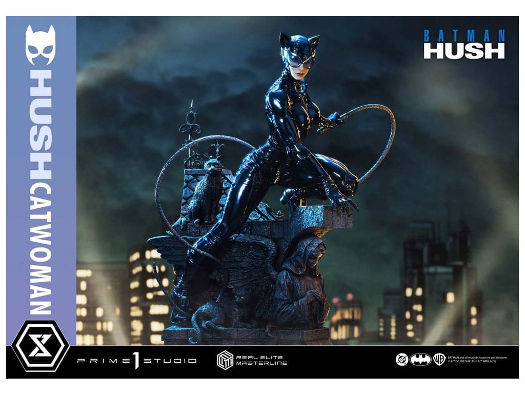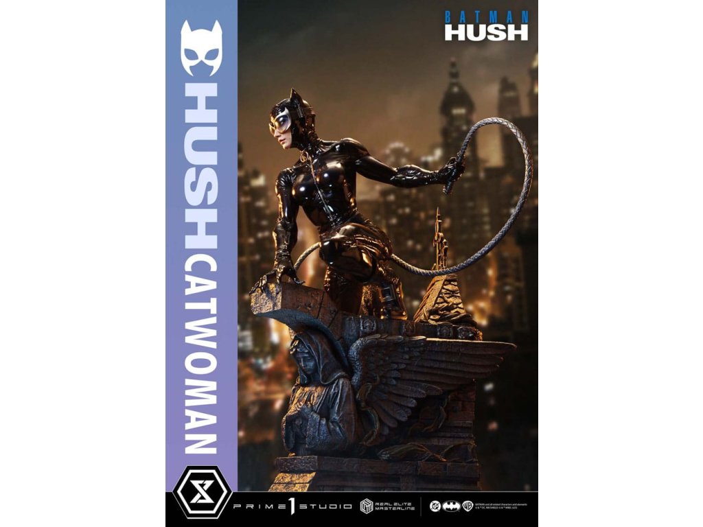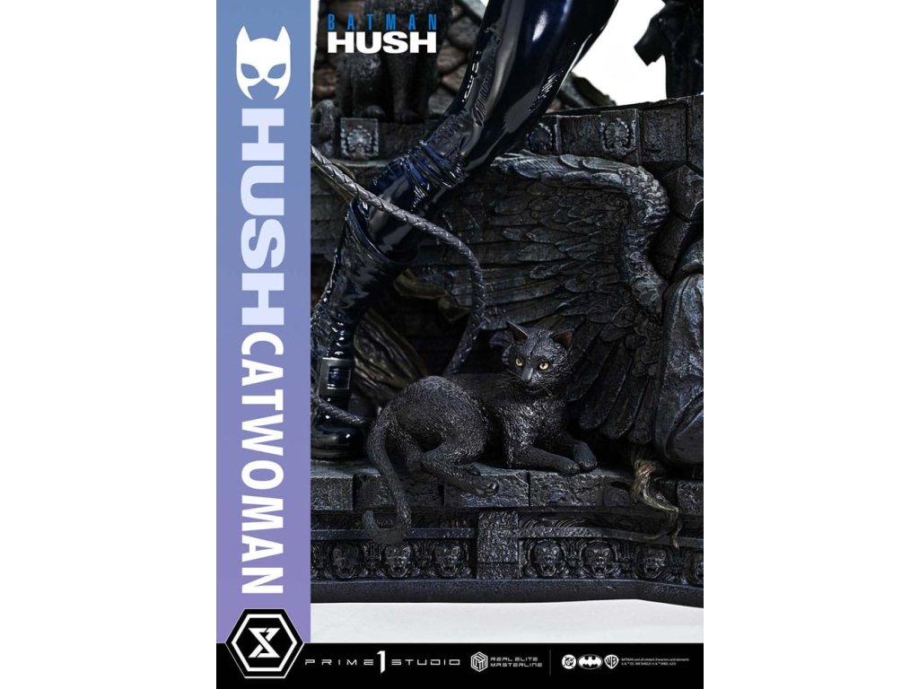 Oblek, ktorý sa v noci roztopí. Pohľad, ktorý pozná význam lásky. Zrelo osudová žena sa objavuje v skutočných farbách a podobe. Z legendárneho príbehového oblúka "Batman: Hush" - prelomového príbehu, ktorý zobrazil veľkú skupinu hrdinov a zloduchov, ktorí predbehli svoju dobu. Z tohto míľnika v histórii DC Comics sa Catwoman pripája k sérii Real Elite Masterline. Prostredníctvom série záhadných udalostí táto femme fatale učí Batmana významu lásky a dôvery. Jej zrelý pôvab je prenesený do 1/3 mierky. Táto socha vychádza z vycibreného vizuálneho štýlu Jima Leeho a snaží sa o realistickú interpretáciu komiksového sveta. Jej stojaca postava na streche zachytáva úchvatný pocit prítomnosti - tak živej, že cítite jej dych. Hlboké dúhovky viditeľné cez jej okuliare. Karmínové pery, ktoré vyžarujú elegantnú zmyselnosť. Plynulý prechod, ktorý definuje tón jej pleti. Jej elegantná tvár je vytvorená pomocou špičkových techník sochárstva a maľby štúdia Prime 1. Priliehavý kostým má lakovaný lesk, dokončený v tóne, ktorý akoby sa rozplýval v noci. Špeciálne navrhnutý podstavec je sám o sebe umeleckým dielom. Socha okrídleného anjela, dvojica mačiek po jej boku a poklady ukryté pod tehlami sú motívy, ktoré odrážajú jej charakter v architektúre Gothamu. Vrcholom sochárskeho a maliarskeho majstrovstva štúdia Prime 1 je Catwoman z filmu "Batman: Hush", ktorá do vašej zbierky prinesie nádych skutočnej romantiky a sofistikovanosti. Špecifikácie.Dodatočné parametre