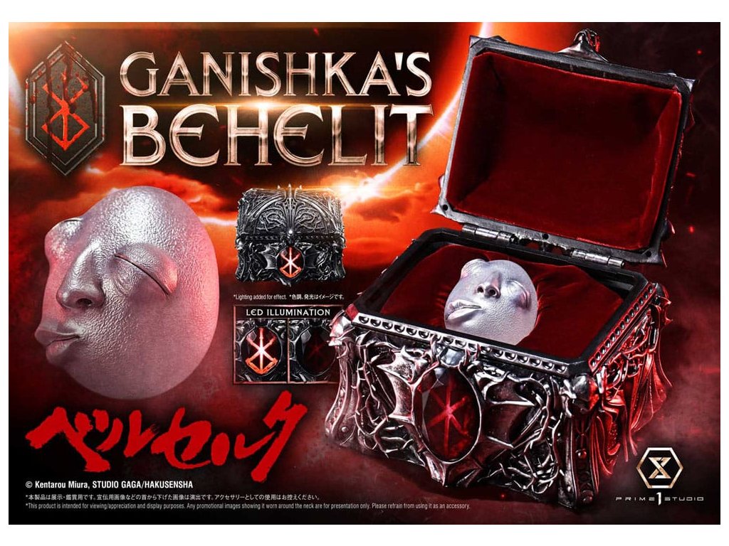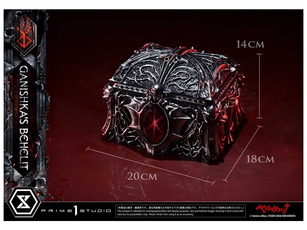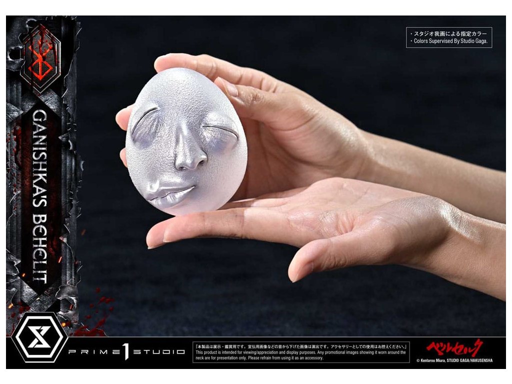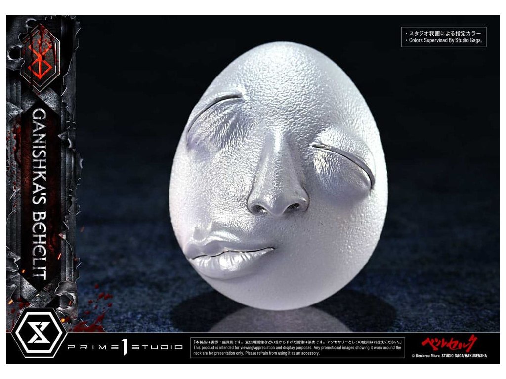 Symbol zákona príčiny a následku, ktorý splnomocnil cisára teroru. Ulita v skrinke v tvare lebky, realizovaná v životnej veľkosti. Zákon príčiny a následku - sila, ktorá ovláda tých, čo chodia po svete smrteľníkov, a dokonca aj tých, čo prebývajú v astrálnom svete. Ganishkov Behelit, symbol tohto jadra "Berserka", sa teraz pripája k sérii Masterline v životnej veľkosti. Tajomný predmet, ktorý udelil Cisárovi hrôzy moc bleskov, bol realizovaný ako zberateľský predmet v životnej veľkosti. Jeho farba - zatiaľ oficiálne nedefinovaná - dostala pod dohľadom štúdia Gaga mystickú striebornú povrchovú úpravu. Jemné deformácie a nepravidelné textúry, ako sú zobrazené v mange, sú v soche plne zachytené a zdá sa, že jej prízračná podoba v sebe slabo obsahuje prítomnosť života. Škatuľa v tvare lebky, ktorá obsahuje tento kus, je originálnym dizajnom štúdia Prime 1, inšpirovaným motívmi úzko spojenými s rytierom lebky - lebkami, mečmi a rastúcimi ružovými liánami. Vnútorný priestor je vybavený tkaninou pripomínajúcou zamat, zatiaľ čo znak obete s LED osvetlením ponúka pohľad do priepasti. Socha v nadživotnej veľkosti na počesť Behelity Ganišovej. Vyrobená s precíznosťou, aby uspokojila najhlbšie túžby vašej zbierky - Špeciálna krabička s LED osvetlením - Ganishka's BehelitLED spôsob napájania: TBD* V závislosti od konečného spôsobu napájania si pripravte batérie, USB káble alebo iné potrebné predmety. Rozmery výrobku: 8 x 7 x 8 cmŠpeciálna krabička: 14 x 20 x 18 cmPribližný dátum vydania: august 2027Dodatočné parametre