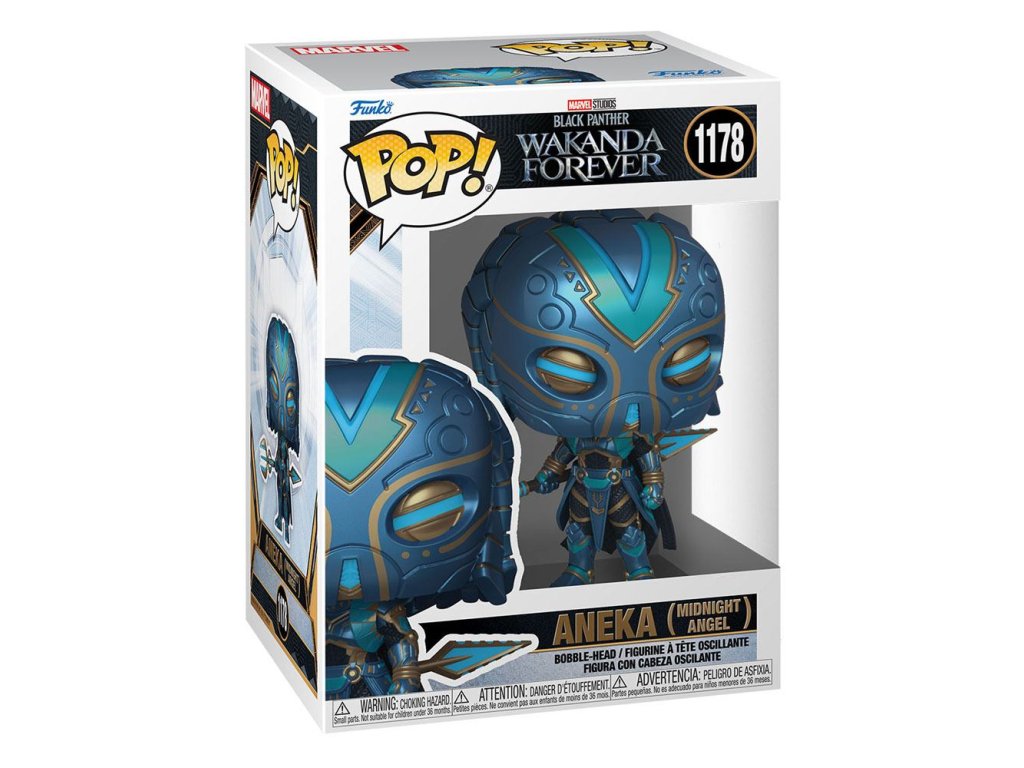 Aneka je vo svojom brnení Polnočného anjela a vyzerá pripravená postaviť sa nepriateľom. V jednej ruke drží zdobenú kopiju, hrdinsky stojí a hľadí do diaľky s vidinou Wakandy. Vinylová figúrka "bobblehead" je vysoká približne 9,5 cm.
