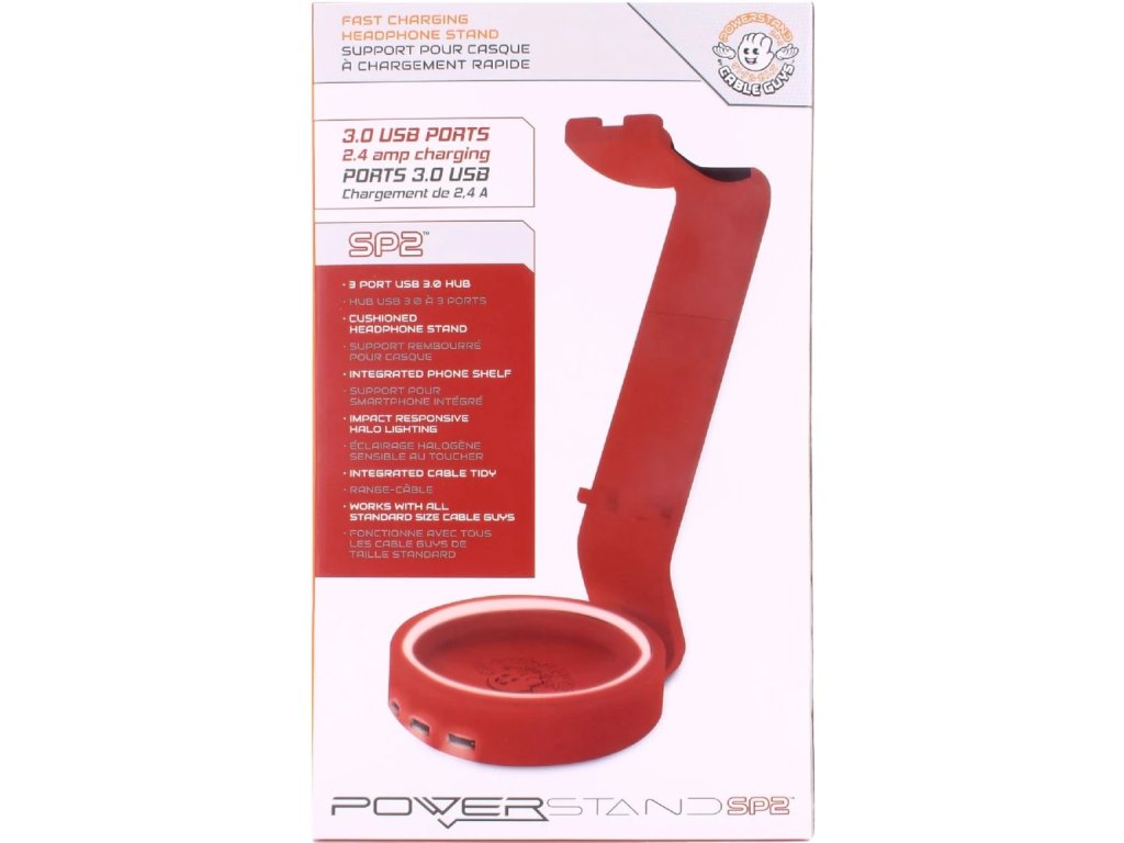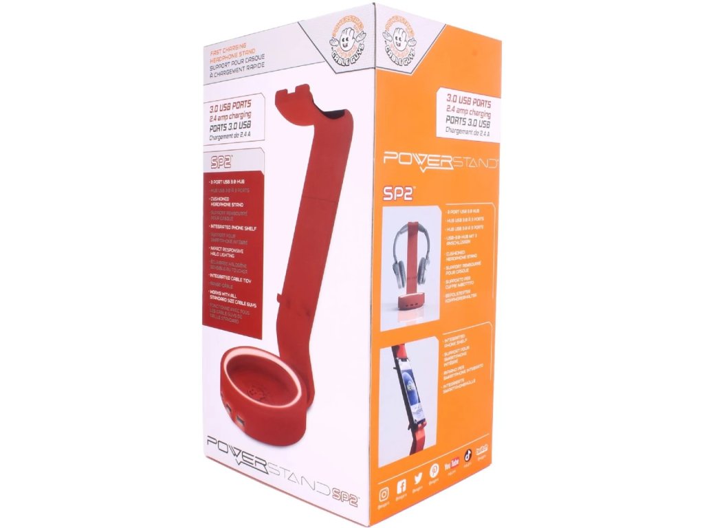 Nová generácia nabíjacích stojanov je vďaka tejto špeciálnej edícii ešte lepšia! Stojan Powerstand SP2 je silnejší a výkonnejší ako jeho predchodca. Centrálna nabíjacia základňa teraz obsahuje 3 x 3.0 USB A porty s 2,4ampérovým nabíjaním, čo vám umožní napájať všetky vaše elektronické potreby súčasne. Halo osvetlenie sa aktivuje, keď sa do kruhovej základne vloží akýkoľvek Cable Guy. A pevné rameno, teraz širšie a hrubšie pre bezpečnejšiu oporu, sa v hornej časti rozširuje na silikónom vystlanú opierku na slúchadlá. Pre ďalšiu funkčnosť bola pridaná polička na smartfón, na zadnej strane zostali háčiky na uloženie prebytočných káblov a nový ovládací blok na základni zabezpečuje postupný tok energie cez výrobok z dodávaného 1,2 m dlhého oranžového nabíjacieho kábla. Powerstand SP2 je najnovšou evolúciou príslušenstva vytvoreného pre fanúšikov, navrhnutého pre profesionálov a zaručene vylepšujúceho každú hernú zostavu.