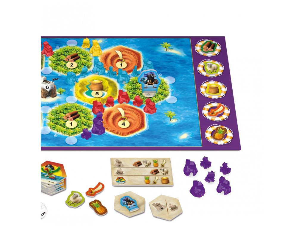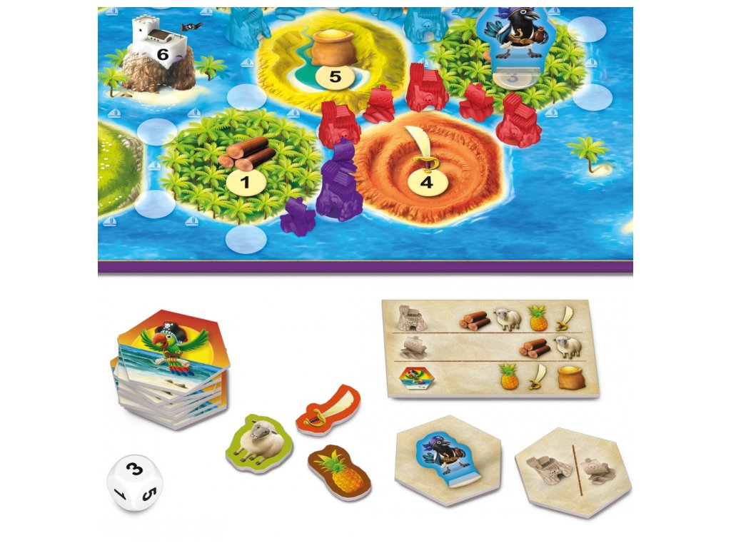 Hra obsahuje: herný plán, 28 lodí, 28 brlohov, 90 žetónov zásob, 16 papagájových kariet, 4 prehľadové karty, hraciu kocku a pravidlá. Klaus Teuber