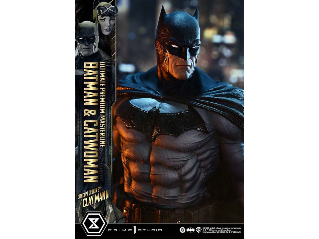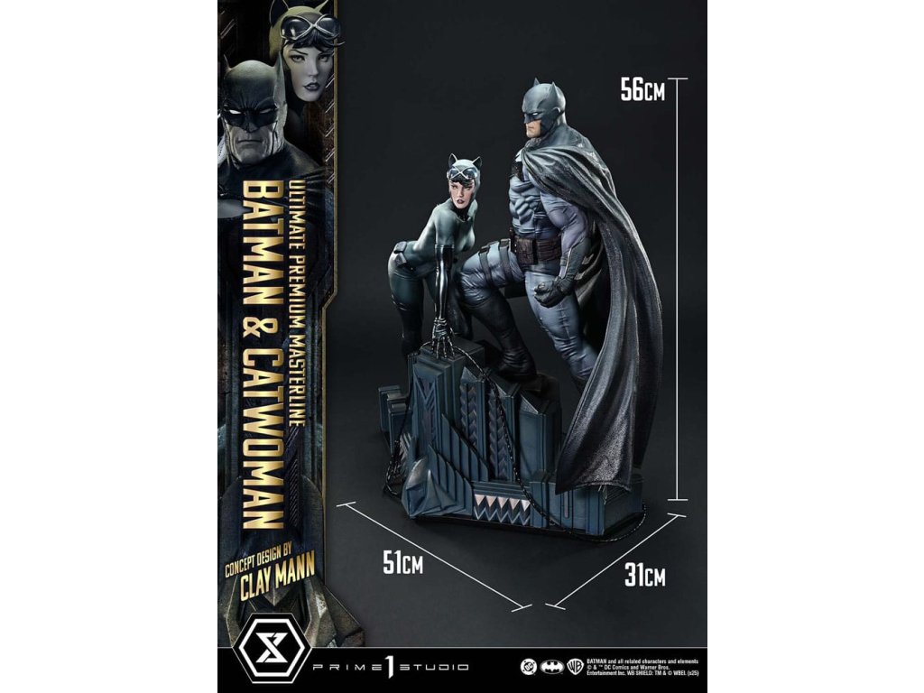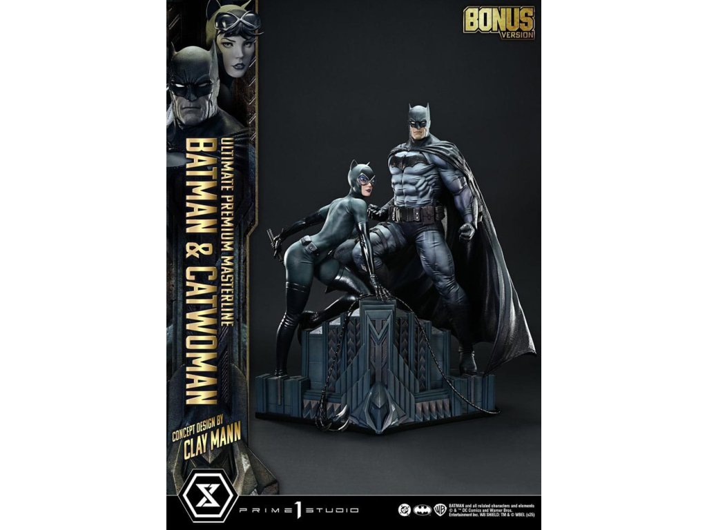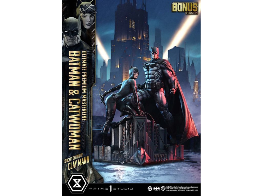 Portrét dvoch duší osvietených v nočnom Gothame. Lyrický koncept Claya Manna pretavený do trojrozmernej podoby. V príbehu, v ktorom sa prelína minulosť, prítomnosť a budúcnosť, "Batman/Catwoman" zobrazuje prah osudu. Z tejto poetickej a vizuálne prepracovanej komiksovej formy sa do série Ultimate Premium Masterline dostávajú dve hlavné postavy - Batman a Catwoman. Obrnení hrozivým svetlom a tieňom stoja Temný rytier a osudová žena spoločne na streche Gothamu. Táto socha v mierke 1/4 je inšpirovaná obálkou Kapitoly 2 a obsahuje koncept, ktorý pre štúdio Prime 1 navrhol sám Clay Mann. Clay starostlivo spolupracoval s našimi umelcami a prispel k jej vytvoreniu mnohými nápadmi, aby vznikla definitívna interpretácia dvojice. Ich starostlivo nastavené pohľady a jemné zmeny smeru tela zachytávajú zložitý vzťah, ktorý ich spája. Batmanovo svalnaté telo evokuje anatomickú presnosť, zatiaľ čo voliteľné časti mu umožňujú držať laná. Postava Catwoman, definovaná starostlivo preštudovanou štruktúrou kostí a svalovou rovnováhou, zachytáva elegantnú siluetu. Jej bič bol starostlivo vytvorený pre ostrý, ale plynulý pocit. Kostýmy oboch postáv sú tmavé a tlmené, zdôrazňujú lesk a tieň a podstavec so zlovestnými motívmi dodáva vznešený nádych. Bonusová verzia obsahuje dodatočnú hlavu Catwoman s okuliarmi, ktorá zberateľom umožňuje vytvoriť nový príbeh prostredníctvom jej vyobrazenia. Kúsok, ktorý pretavuje lyrický koncept Claya Manna do sochárskej podoby. Vystavená spolu so súčasne vydanou "Phantasm" ponúka ešte hlbší pohľad do sveta "Batman/Catwoman". Nevyhnutný doplnok každej zbierky DC Comics. Rozmery: približne 56 x 51 x 31 cm. Špecifikácie produktu: - základňa Batmana - 2 vymeniteľné ľavé ruky Batmana (holá ruka, lano) - 1 vymeniteľná hlava Catwoman (vážny výraz) - 1 vymeniteľná hlava Catwoman (s okuliarmi) [BONUSOVÁ ČASŤ] - 1 stojan na hlavu Catwoman [BONUSOVÁ ČASŤ] - limitovaný počet 400 kusov.Dodatočné parametre