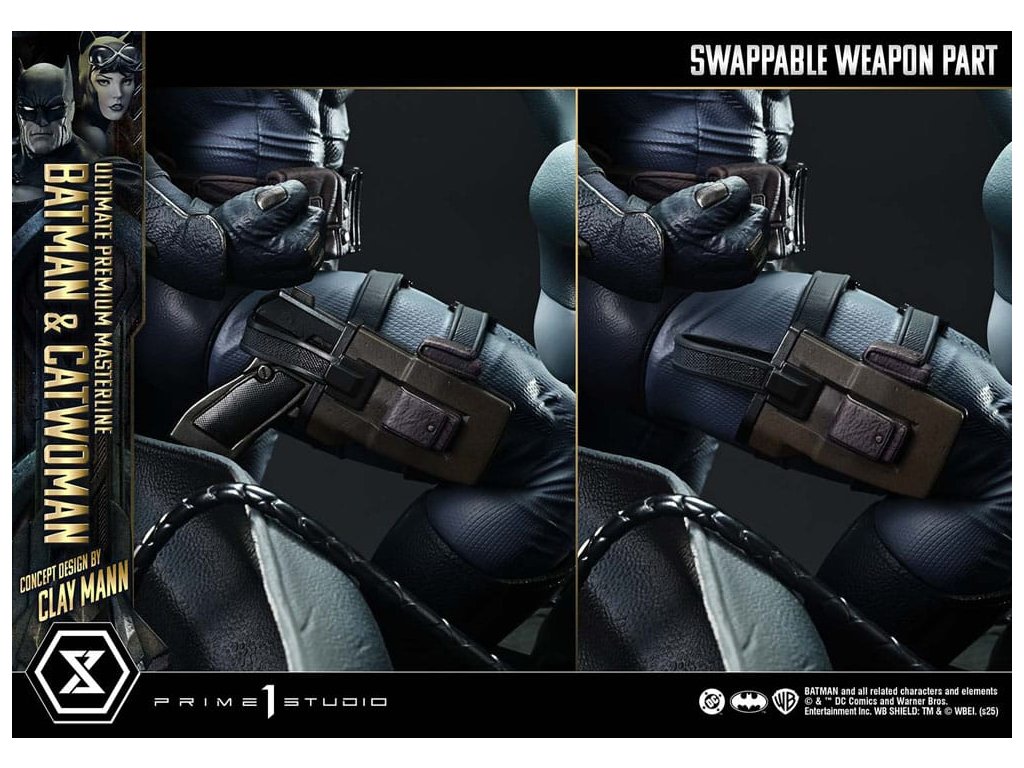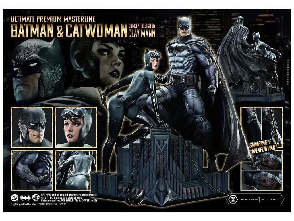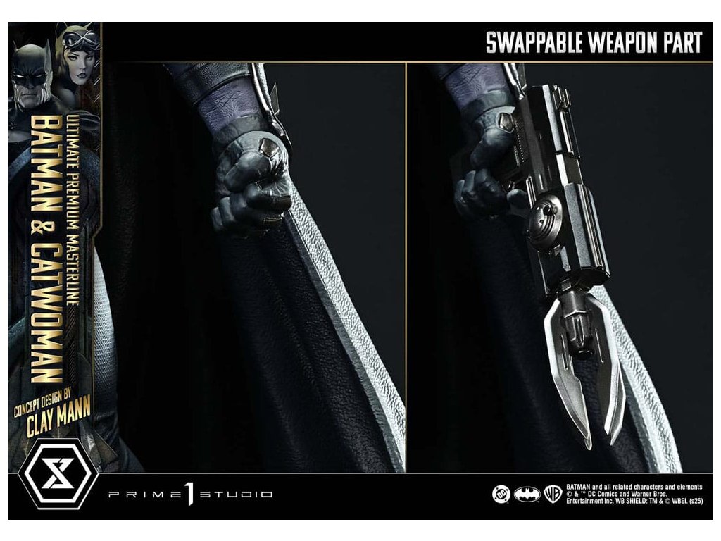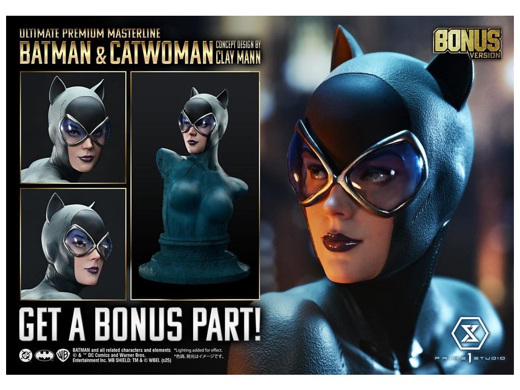 Portrét dvoch duší osvietených v nočnom Gothame. Lyrický koncept Claya Manna pretavený do trojrozmernej podoby. V príbehu, v ktorom sa prelína minulosť, prítomnosť a budúcnosť, "Batman/Catwoman" zobrazuje prah osudu. Z tejto poetickej a vizuálne prepracovanej komiksovej formy sa do série Ultimate Premium Masterline dostávajú dve hlavné postavy - Batman a Catwoman. Obrnení hrozivým svetlom a tieňom stoja Temný rytier a osudová žena spoločne na streche Gothamu. Táto socha v mierke 1/4 je inšpirovaná obálkou Kapitoly 2 a obsahuje koncept, ktorý pre štúdio Prime 1 navrhol sám Clay Mann. Clay starostlivo spolupracoval s našimi umelcami a prispel k jej vytvoreniu mnohými nápadmi, aby vznikla definitívna interpretácia dvojice. Ich starostlivo nastavené pohľady a jemné zmeny smeru tela zachytávajú zložitý vzťah, ktorý ich spája. Batmanovo svalnaté telo evokuje anatomickú presnosť, zatiaľ čo voliteľné časti mu umožňujú držať laná. Postava Catwoman, definovaná starostlivo preštudovanou štruktúrou kostí a svalovou rovnováhou, zachytáva elegantnú siluetu. Jej bič bol starostlivo vytvorený pre ostrý, ale plynulý pocit. Kostýmy oboch postáv sú tmavé a tlmené, zdôrazňujú lesk a tieň a podstavec so zlovestnými motívmi dodáva vznešený nádych. Bonusová verzia obsahuje dodatočnú hlavu Catwoman s okuliarmi, ktorá zberateľom umožňuje vytvoriť nový príbeh prostredníctvom jej vyobrazenia. Kúsok, ktorý pretavuje lyrický koncept Claya Manna do sochárskej podoby. Vystavená spolu so súčasne vydanou "Phantasm" ponúka ešte hlbší pohľad do sveta "Batman/Catwoman". Nevyhnutný doplnok každej zbierky DC Comics. Rozmery: približne 56 x 51 x 31 cm. Špecifikácie produktu: - základňa Batmana - 2 vymeniteľné ľavé ruky Batmana (holá ruka, lano) - 1 vymeniteľná hlava Catwoman (vážny výraz) - 1 vymeniteľná hlava Catwoman (s okuliarmi) [BONUSOVÁ ČASŤ] - 1 stojan na hlavu Catwoman [BONUSOVÁ ČASŤ] - limitovaný počet 400 kusov.Dodatočné parametre