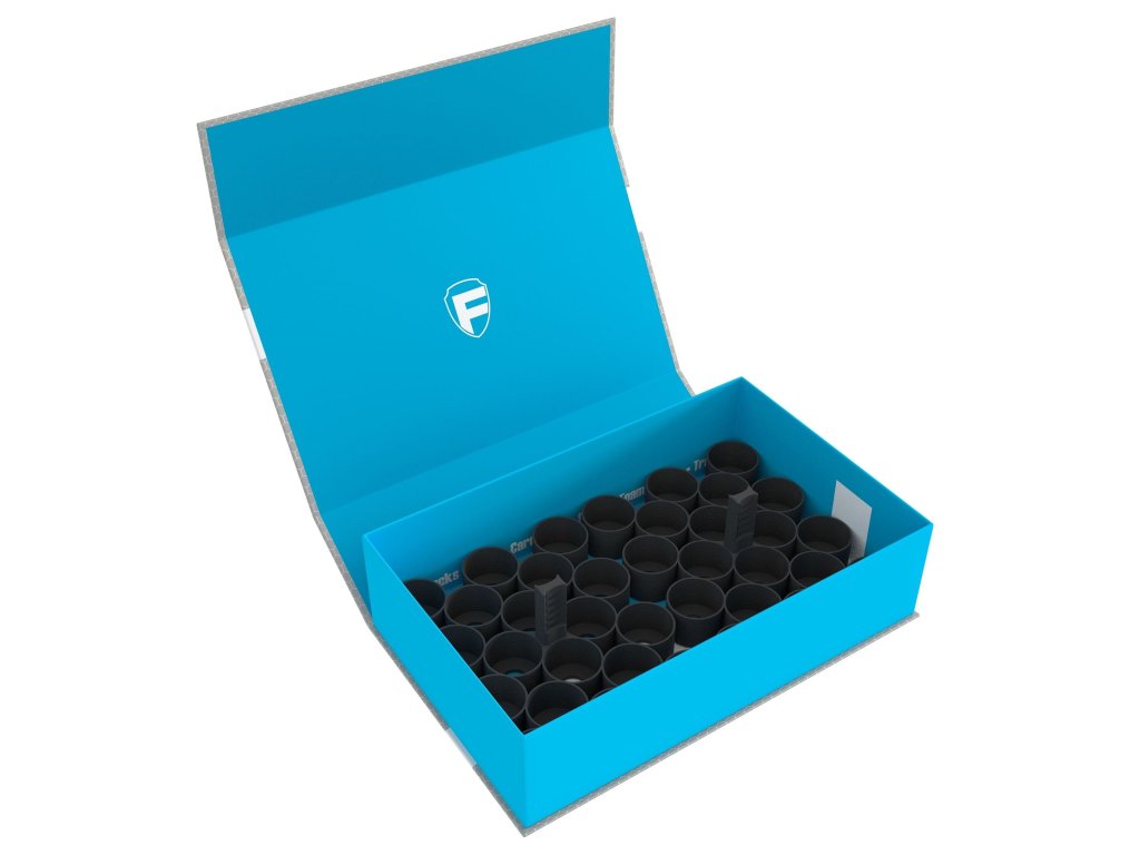 Praktická krabička od spoločnosti Feldherr pojme až 36 fľaštičiek farieb Citadel (18 ml alebo 24 ml). Modrá škatuľka má magnetický uzáver. Obsah balenia: 1x magnetická krabička Feldherr (modrá) 2x stojan na farby Feldherr (18 otvorov, každý pre 18 alebo 24 ml fľaštičky) 1x penové dno Feldherr Rozmery krabičky sú 290 x 180 x 80 mm. Farby nie sú súčasťou balenia.
