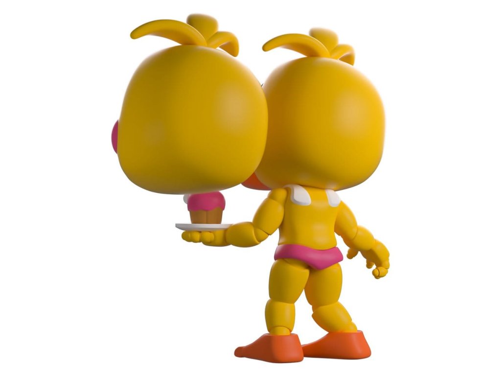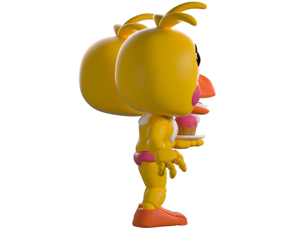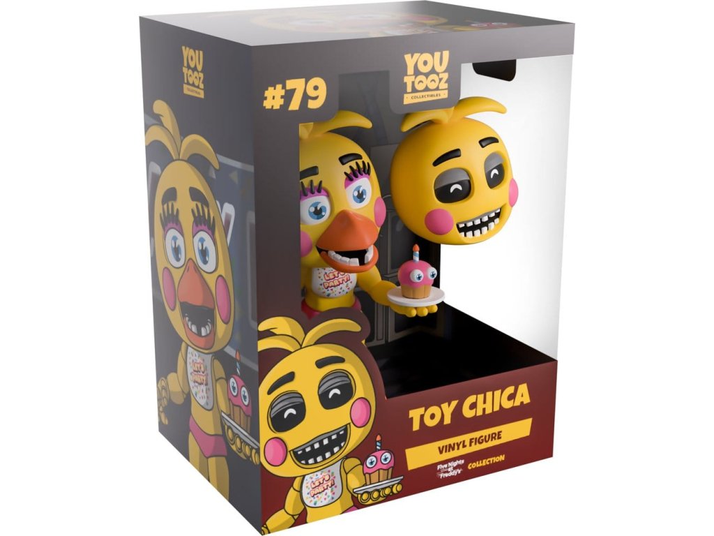 "Počkajte... Kde je môj zobák?" Chica je taká nadšená zo svojho návratu na Youtooz, že stratila zobák! Áno, môžete sa presne rozhodnúť, ako chcete Chicu stvárniť, pretože k nej dostanete dve vymeniteľné hlavy! Jedna so žiarivo modrými očami nad oranžovým zobákom a okrúhlymi ružovými lícami, pričom z vrchnej časti hlavy sa dvíha trojica pierok, zatiaľ čo na druhej sú jej oči a zobák, pričom z vnútornej strany sú vidieť belavé zreničky vykúkajúce zo zužujúcich sa očných otvorov a desivý zubatý úsmev. Bez ohľadu na to, ktorú hlavu si vyberiete, bude stáť 11,6 cm vysoká s pokrčenými kolenami a segmentovou rukou vychádzajúcou zo žltého tela, pričom v ľavej ruke drží ružový zdobený muffin a na hlave má nápis "Let's Party!". Na vonkajšom obale balenia je zobrazená Chica, ako sa pripravuje na párty so svojím muffinom, zatiaľ čo vo vnútri je pohľad do tmavej miestnosti s podlahou z kociek, kde sú na pozadí naukladané staré monitory. Ochranný obal je potom pokrytý zvislými modrými a čiernymi pásmi, z ktorých visia hrubé drôty, a ich postavu je vidieť cez veľké priehľadné okno v prednej časti balenia. Tento zberateľský predmet sa dodáva v matnom, reliéfnom, ochrannom vonkajšom obale a v plastovom chrániči vlastnej veľkosti pre maximálnu ochranu počas prepravy. o hre Five Nights at Freddy's: Five Nights at Freddy's je hororová hra o prežití, ktorú vytvoril Scott Cawthon. Hra sa odohráva v čase, keď hráč pracuje ako nočný strážnik v rodinnej pizzerii Freddy Fazbear's, kde sa rýchlo dostane do konfliktu s radom vnímajúcich animatronikov. Krátko po vydaní hry v roku 2014 si získala kultovú popularitu a rýchlo sa vyvinula do komplexného fiktívneho univerza s vlastnými príbehmi a rôznymi spin-offmi. Predbežný dátum vydania: jún 2026Dodatočné parametre