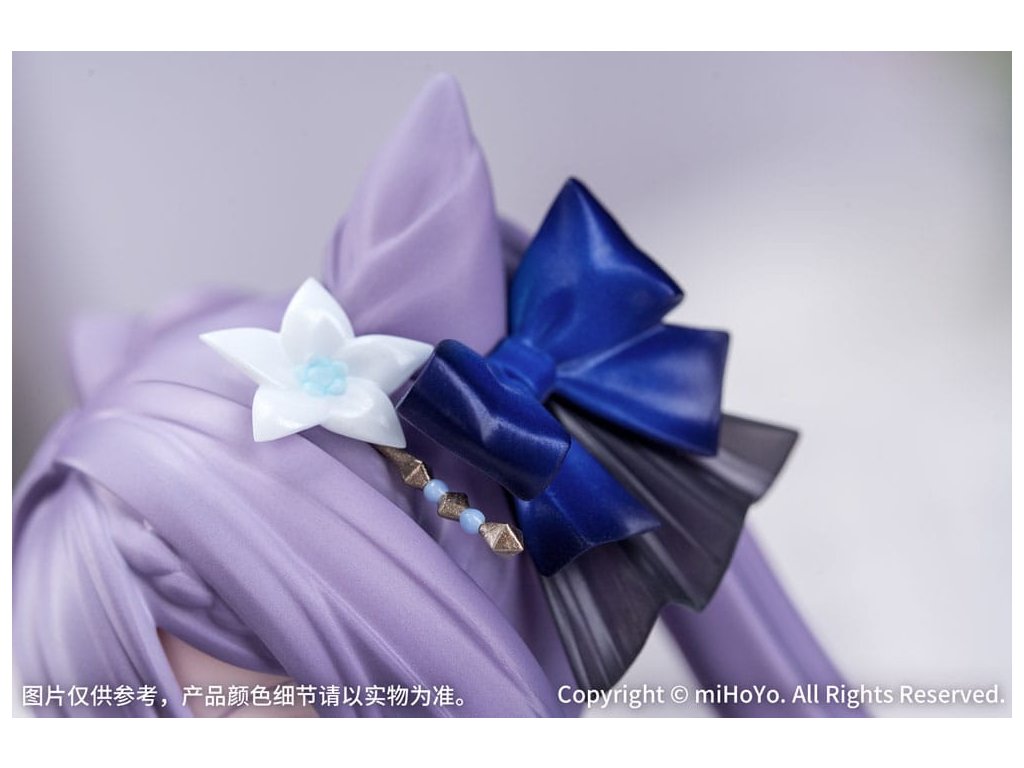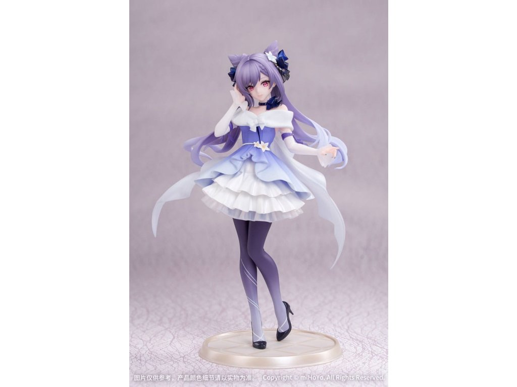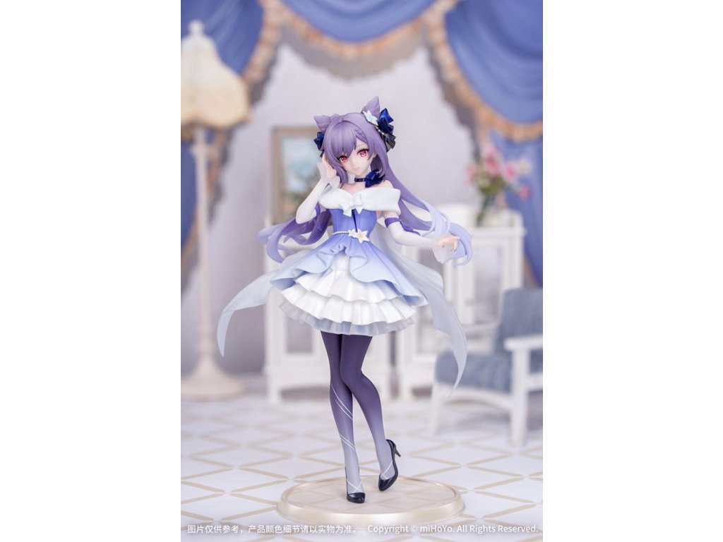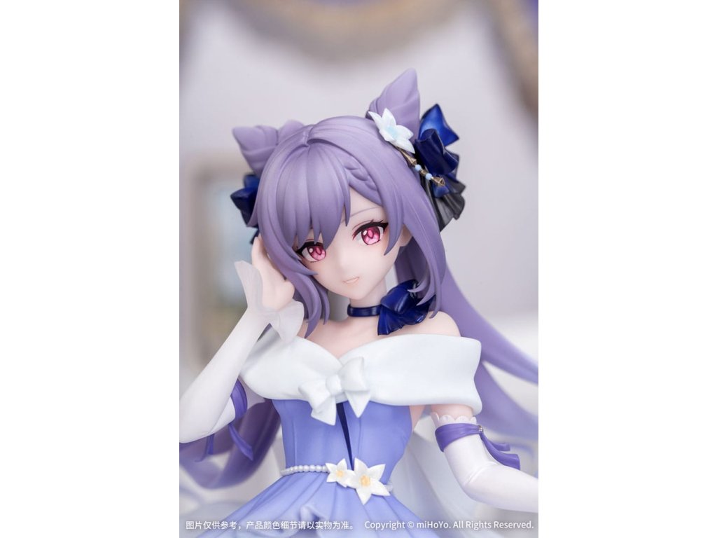 Už čoskoro od spoločnosti Genshin Impact vychádza Keqing Ver. 1/8 Resplendent Feast! Keqing zdobí jemná šatka s lila gradientom, jej splývavá stuha tancuje s vetrom. Jej sukňa vrstvená vzdušnými volánmi a čistým bielym šifónom sa pod mesačným svitom drobí ako obláčiky. Jej splývavé vlasy a fialová sukňa sú posiate trblietkami pripomínajúcimi hviezdny prach, zatiaľ čo tmavomodrý golier dopĺňa rovnaká stuha vo vlasoch. Perlová retiazka na páse Glaze Lily sa jemne pohupuje pri každom kroku a zachytáva elegantný pôvab lady Yuheng. Cestovatelia, dovolíte, aby sa táto jedinečná žiara Liyue stala večnou hviezdou na vašich prstoch?Dodatočné parametre