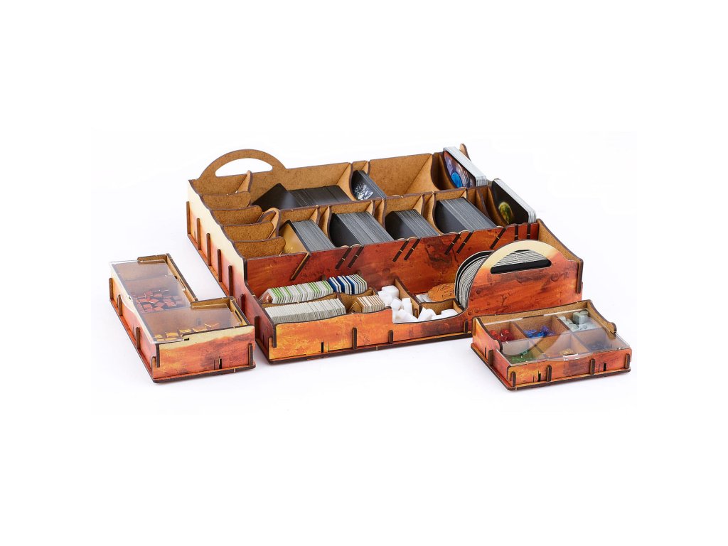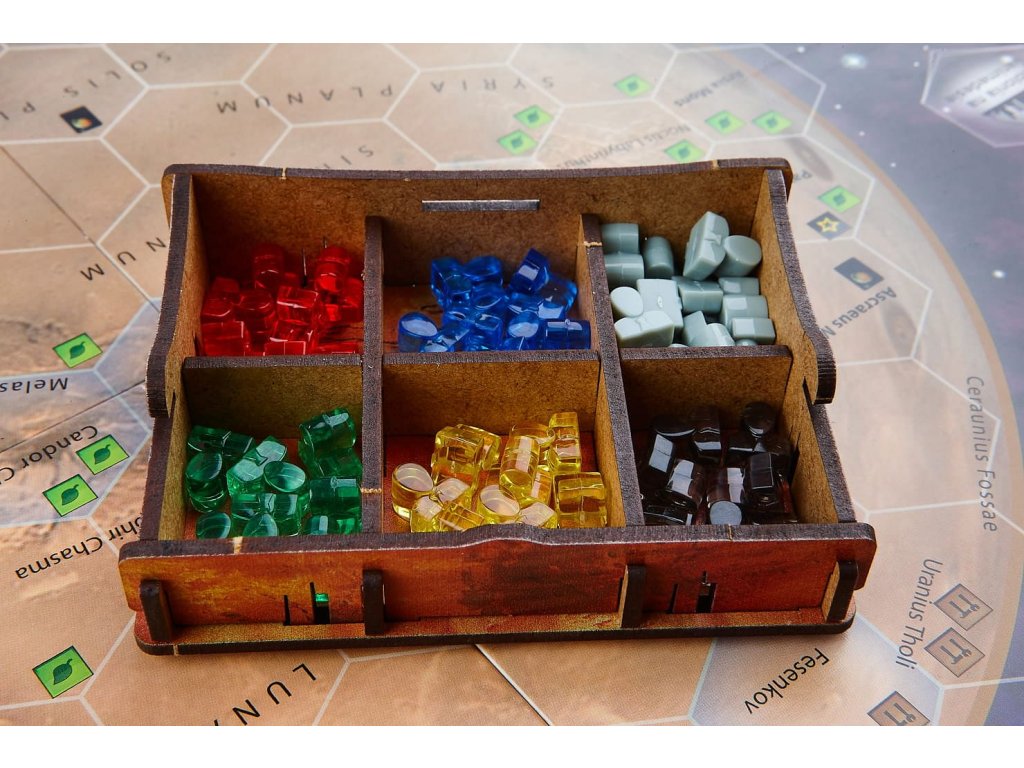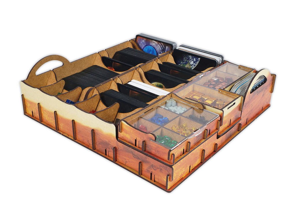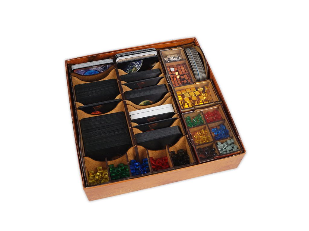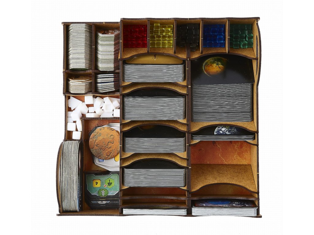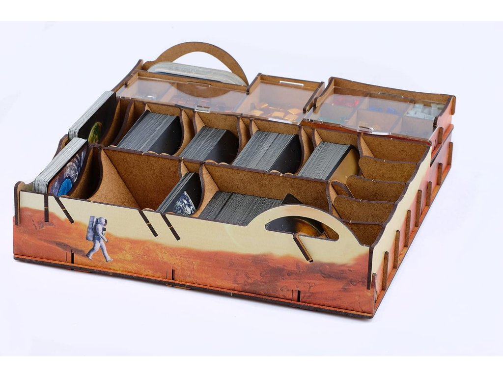 S krásnym grafickým insertom pre stolovú hru Mars: Terraformation a rozšírenia Overture, Colony, Unrest a Venus budete mať svoje karty a herné komponenty prehľadne usporiadané a roztriedené. Vložka počíta so zabalenými kartami. Vysokokvalitná UV tlač odoláva vonkajším vplyvom. V balení nájdete návod na zostavenie, na ktoré nie je potrebné žiadne lepidlo. Insert sa zmestí do krabičky s rozmermi 29,7 x 29,7 x 7,1 cm. Originálne komponenty sú len ilustračné a nie sú súčasťou balenia.Dodatočné parametre