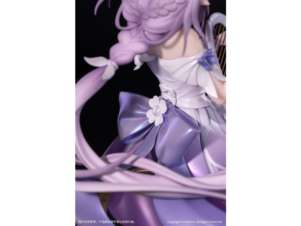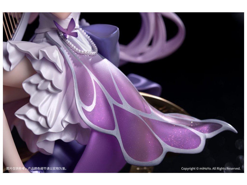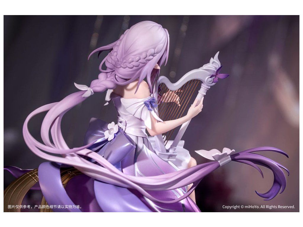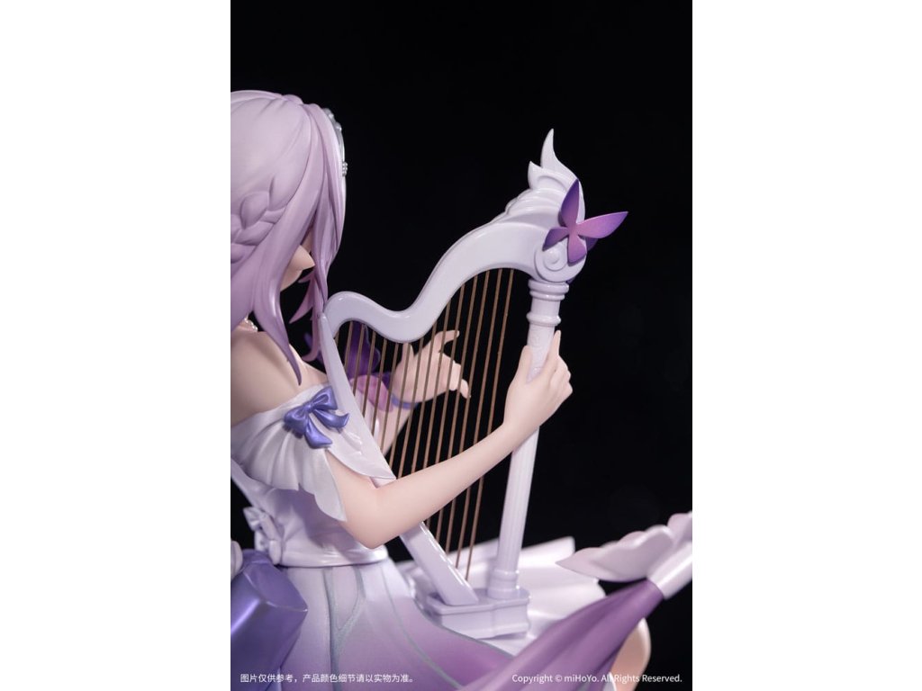 Z populárnej hry Honkai: Star Rail prichádza nová figúrka zo série Gift+ v mierke 1/8, Castorice Star Rail LIVE Ver! Castorice pokojne sedí v elegantnej póze a svojimi štíhlymi prstami jemne hladí harfu. Jej šaty sú vyrobené perleťovou technikou a každý záhyb pulzuje životom. Sukňa v gradientnom odtieni sa rozvíja ako okvetné lístky, zatiaľ čo strieborné kovové línie obkresľujú vzory motýlích krídel, doplnené jemnými iskrami. Jej ružovofialové vlasy poletujú vo vetre spolu so šnúrkami a vytvárajú vo vzduchu elegantný oblúk. Podstavec pokrytý metalickou farbou a vyrazený plynúcimi hudobnými tónmi ju jemne podopiera a celkový tvar figúrky je ľahký a pôvabný ako motýľ v lete. V tomto momente sa jemne ozýva éterický zvuk harfy - Trailblazer, bol by si ochotný počúvať túto pieseň hranú po celý život?Dodatočné parametre