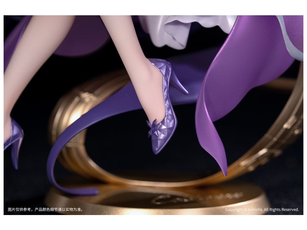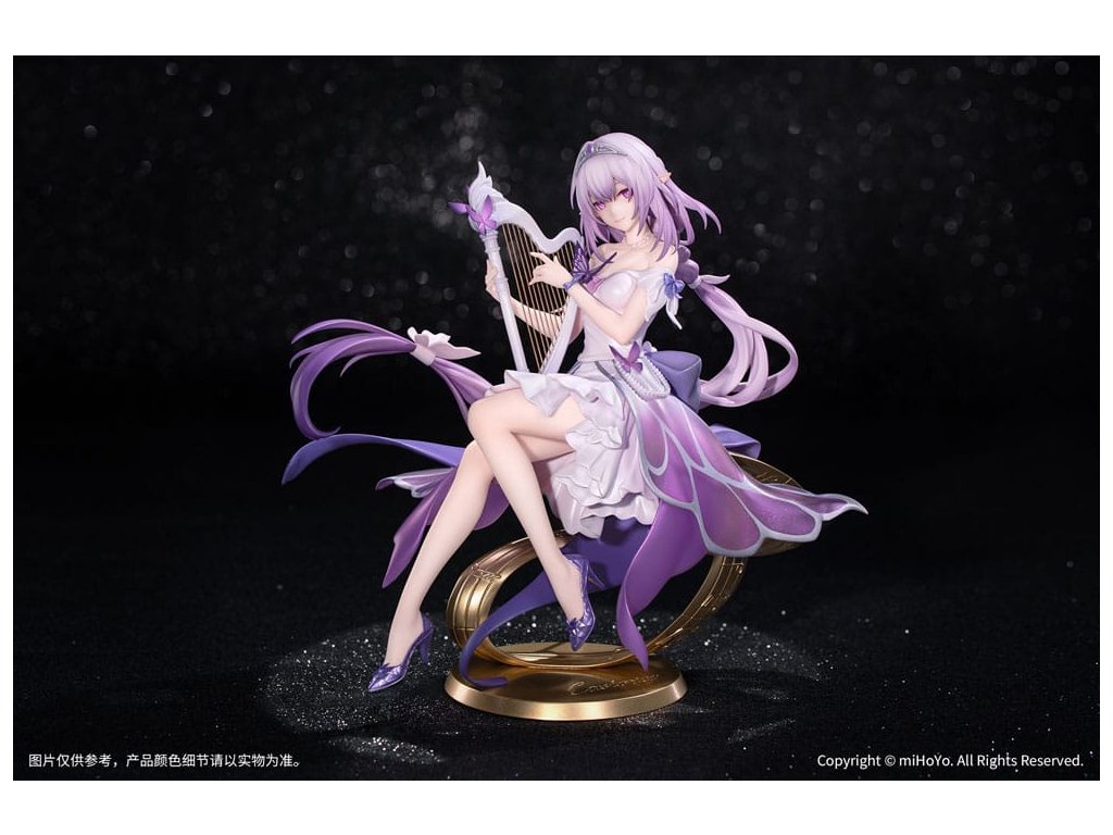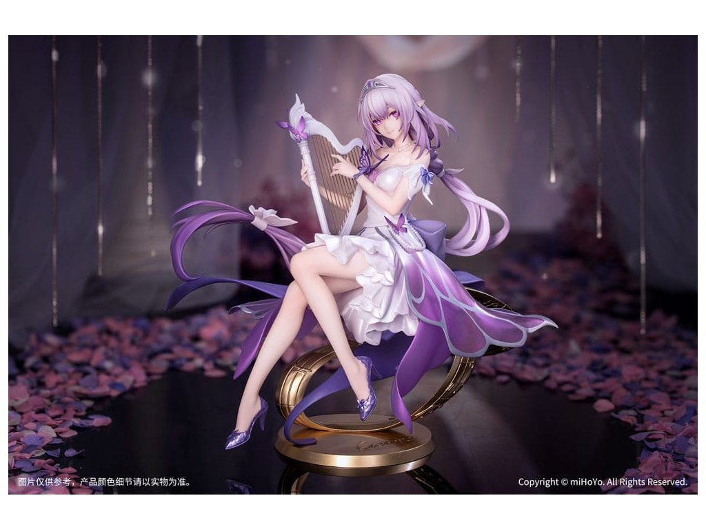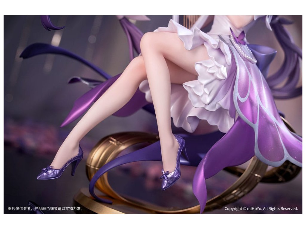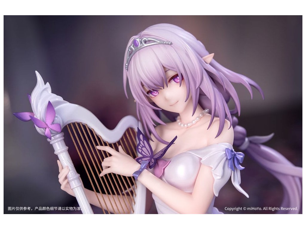 Z populárnej hry Honkai: Star Rail prichádza nová figúrka zo série Gift+ v mierke 1/8, Castorice Star Rail LIVE Ver! Castorice pokojne sedí v elegantnej póze a svojimi štíhlymi prstami jemne hladí harfu. Jej šaty sú vyrobené perleťovou technikou a každý záhyb pulzuje životom. Sukňa v gradientnom odtieni sa rozvíja ako okvetné lístky, zatiaľ čo strieborné kovové línie obkresľujú vzory motýlích krídel, doplnené jemnými iskrami. Jej ružovofialové vlasy poletujú vo vetre spolu so šnúrkami a vytvárajú vo vzduchu elegantný oblúk. Podstavec pokrytý metalickou farbou a vyrazený plynúcimi hudobnými tónmi ju jemne podopiera a celkový tvar figúrky je ľahký a pôvabný ako motýľ v lete. V tomto momente sa jemne ozýva éterický zvuk harfy - Trailblazer, bol by si ochotný počúvať túto pieseň hranú po celý život?Dodatočné parametre