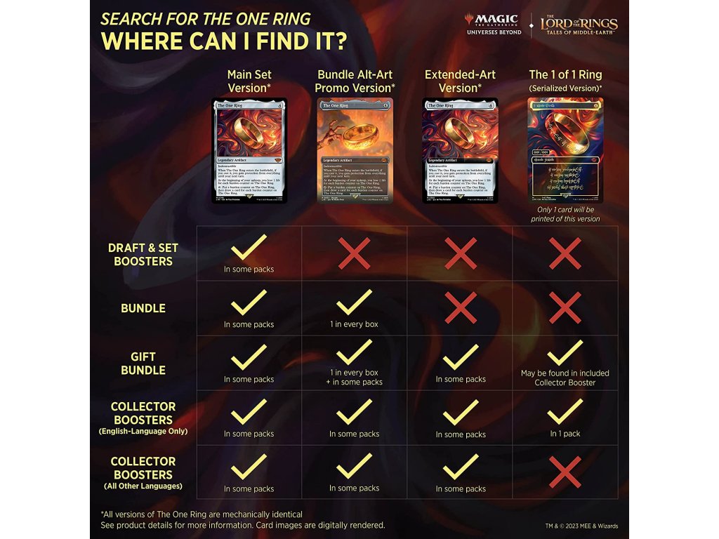 Tento produkt neobsahuje sériové karty prsteňov vrátane sériových kariet elfských, trpasličích alebo ľudských Sol Ringov a 1 z 1 prsteňa (sériová karta 001 z 001). Sériové karty elfských, trpasličích a ľudských Sol Ringov sa nachádzajú len v niektorých zberateľských boosteroch The Lord of the Rings: Tales of Middle-earth. Bola vytlačená iba jedna karta The One Ring (Serialized 1 of 1) a túto kartu nájdete iba v jednom anglickom zberateľskom boosteri. Neserializované karty Prsteňa sú technicky totožné so svojimi serializovanými verziami.
