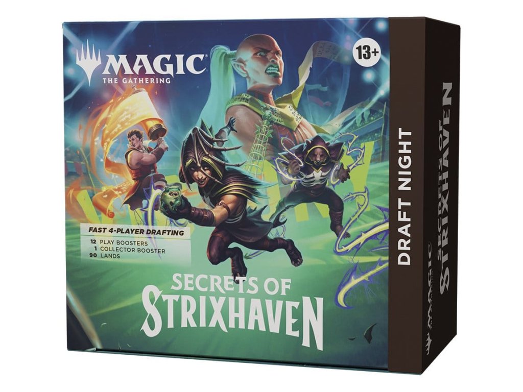 Je to párty v krabici! Draft Night je samostatná sada na organizovanie draftu pre štyroch hráčov. Korunujte víťaza pomocou priloženého zberateľského boosteru Secrets of Strixhaven (alebo si ho môžete nechať pre seba, nebudeme to posudzovať). Obsahuje 12 herných boostrov, 1 zberateľský booster, 90 základných kariet pozemkov a 10 obojstranných kariet žetónov