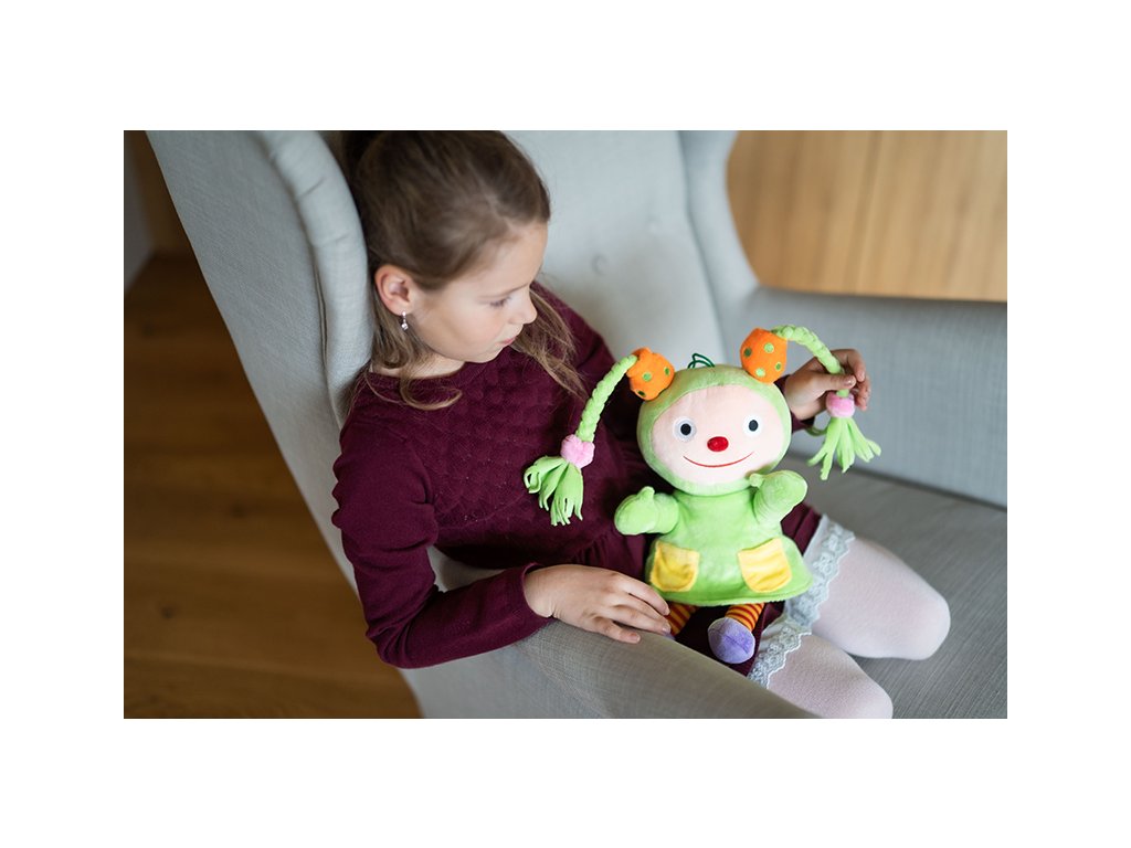 Malé zelené škriatkovské dievčatko z krajiny Fanfárov. Vyrobené z kvalitného a mäkkého plyšu.