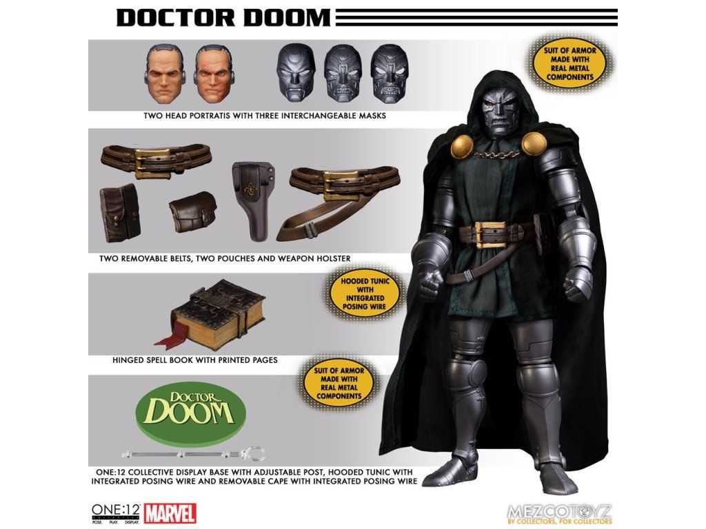 "Osud nie je pre nikoho druhou voľbou." Latverský monarcha Doctor Doom sa pripája k línii One:12 Collective! Doktor Doom nosí tuniku s kapucňou a brnenie vyrobené zo skutočných kovových častí. Jeho odnímateľný plášť má zapínanie na patentky, reťaz zo skutočného kovu a integrované drôty na tvarovanie pózy. Súčasťou sú 2 vymeniteľné hlavy bez masky a 3 vymeniteľné tvárové dosky, ktoré umožňujú rôzne charakteristické vzhľady. Doctor Doom nosí postroj Cosmic Power Siphon s funkciou podsvietenia. Postroj sa pevne pripája k jeho obrnenému obleku a umožňuje mu vysávať kozmickú energiu z bytostí s veľkou silou. Majster vedy a čarodejníctva je vybavený svojím charakteristickým elektrošokovým zariadením, ktoré sa pohodlne zmestí do vrecka na opasku, otváracou knihou kúziel s vytlačenými stránkami, vymeniteľnými raketovými pohonmi, ktoré sa pripájajú na zadnú stranu jeho obrneného obleku, a mnohými ďalšími doplnkami. Po prekonaní svojho problémového detstva sa Victor von Doom stal jedným z najgeniálnejších vedcov na svete. Kombinácia jeho obrovského ega, vedeckého génia a neuhasiteľnej túžby po moci z neho urobila jedného z najväčších zloduchov vo vesmíre Marvelu. Každá figúrka Doctora Dooma z radu One:12 Collective je zabalená v zberateľskej škatuľke navrhnutej s ohľadom na zberateľa.Dodatočné parametre