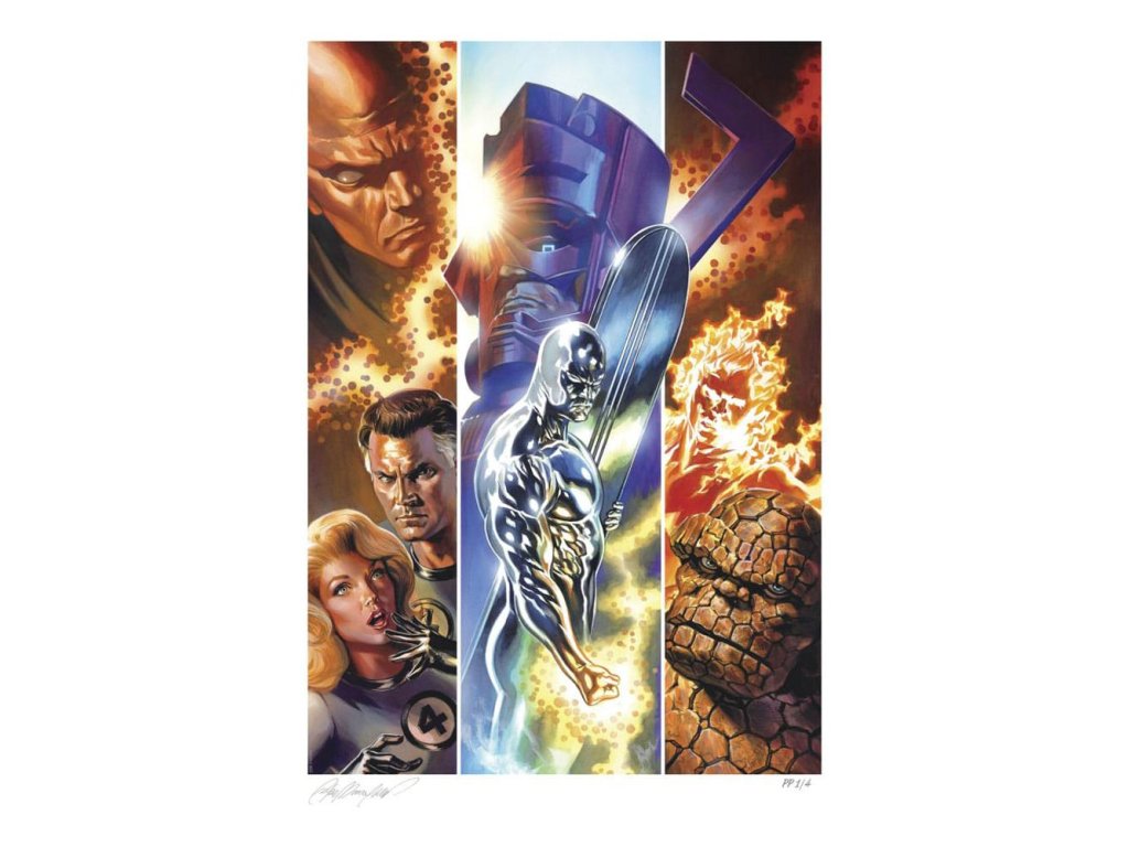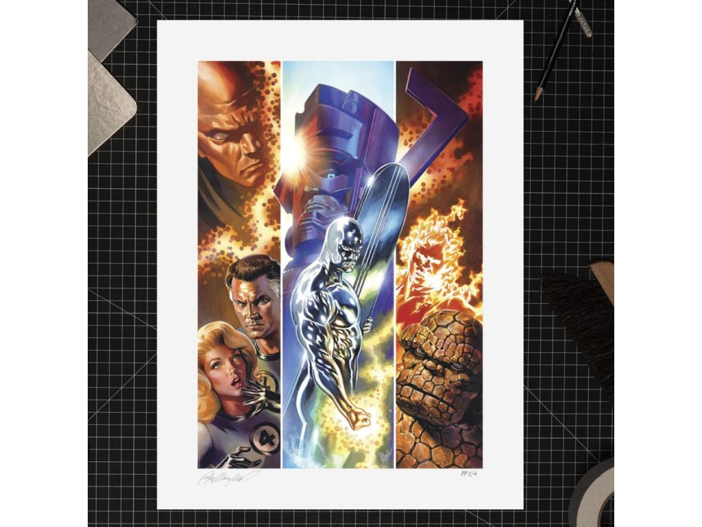 "Po všetkých tých rokoch, po všetkých našich dobrodružstvách... sme stále spolu. Stále sme tím!" Sideshow predstavuje Fine Art Print Fantastická štvorka od výtvarníka Felipeho Massafera, vzrušujúcu umeleckú tlač Marvelu, ktorá vzdáva hold klasickým, farebným komiksovým vzorom. reed Richards, Ben Grimm, Susan Storm a Johnny Storm sa vydali na nebezpečnú misiu medzi hviezdy a vrátili sa nenávratne zmenení. Pán Fantastic, Vec, Neviditeľná žena a Ľudská pochodeň, obdarení nadľudskými schopnosťami, sa vydali chrániť Zem pred vesmírnymi hrozbami. Na tejto epickej ilustrácii sa prvá rodina Marvelu stretáva s Galactusom a jeho heroldom Silver Surferom, zatiaľ čo Uatu the Watcher sleduje tieto legendárne momenty v priestore, čase - a v ikonickom Kirbyho škreku." Pôvodne vytvorená ako variant obálky Fantastickej štvorky #48 (2022), ktorú pre Marvel Comics napísal David Pepos, je teraz fanúšikom k dispozícii ako nezarámovaná giclee tlač alebo v prezentácii na mieru. Každý Fine Art Print umenia Fantastická štvorka obsahuje autorizovaný, automatizovaný podpis umelca a vyrazenú pečať pravosti Sideshow v rámci limitovanej edície 200 kusov. sú prvou rodinou Marvel Universe! Pripomeňte si ich históriu, keď si dnes domov prinesiete Fine Art Print The Fantastic Four od Felipeho Massafera.- Oficiálne licencované spoločnosťou Marvel- Limitovaná edícia 200 kusov- Výtvarný giclée výtlačok s rozmermi 18 x 24" (61 x 46 cm)- Ťažký 100 % bavlnený, bezkyslíkatý, certifikovaný archívny papier Fine Art Paper- Archívne atramenty Epson- Reliéfna pečať pravosti- Výtlačok je zabalený a ručne zvinutý na bezkyslíkatom papieri a dodáva sa v tubuse s priemerom 5".Dodatočné parametre