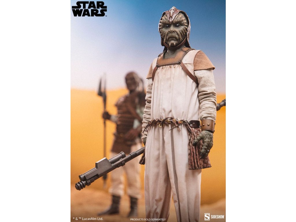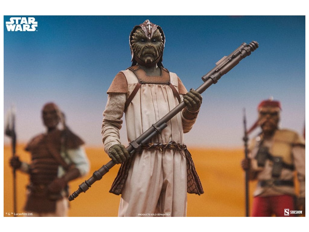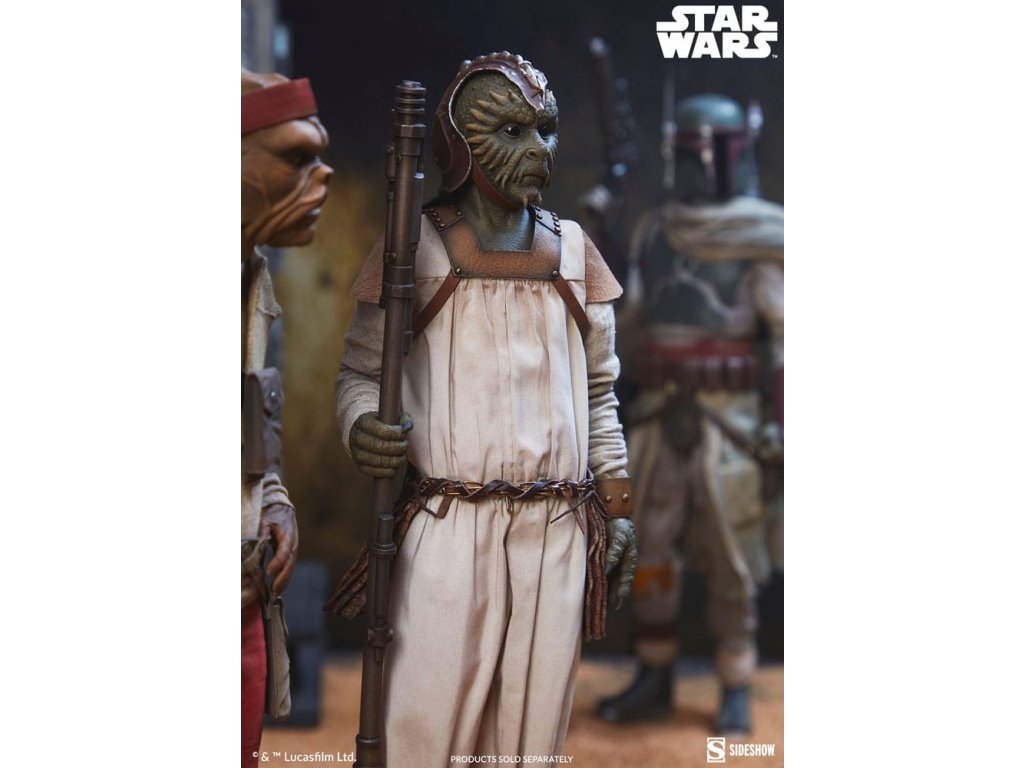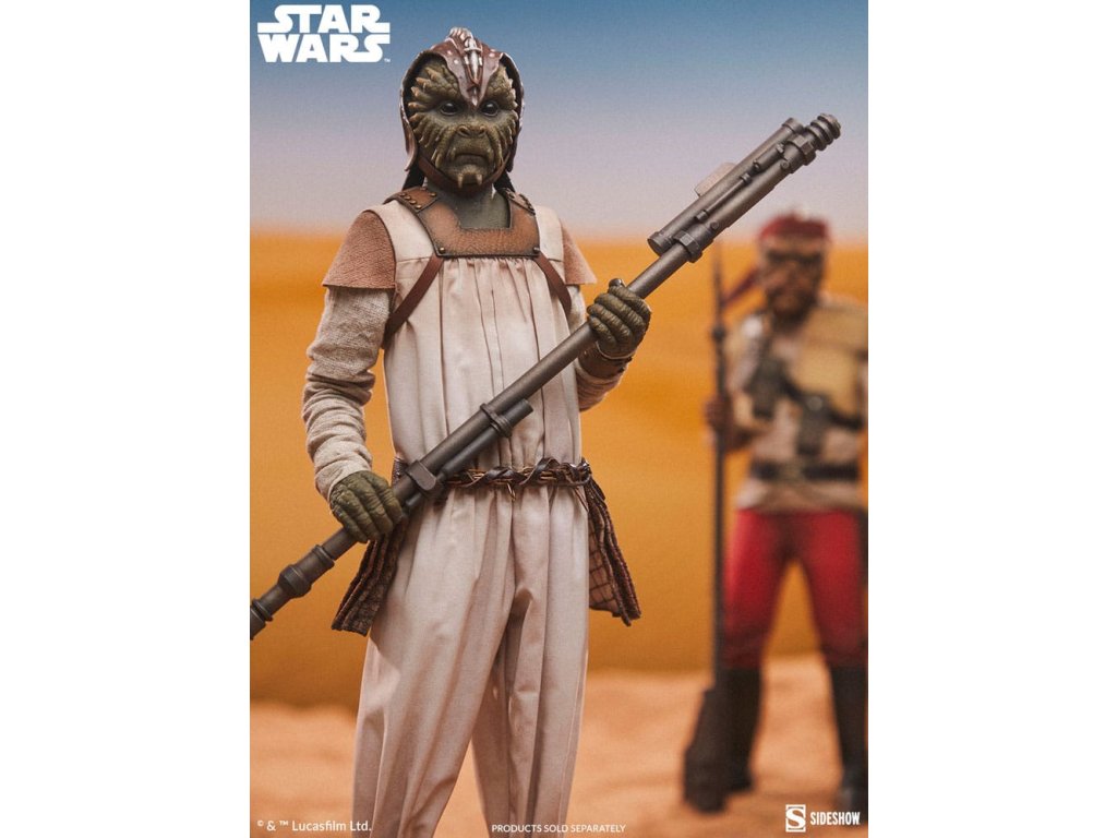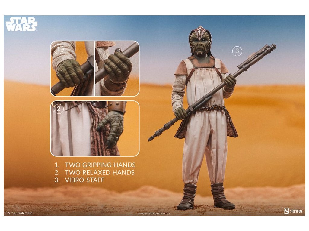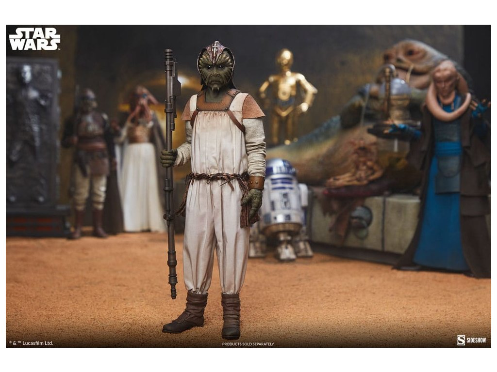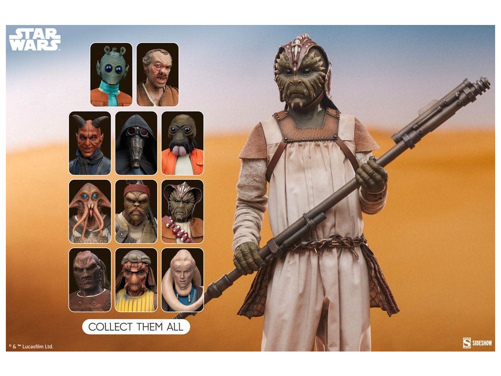 Spoločnosť Sideshow predstavuje vysokokvalitnú zberateľskú figúrku Klaatu™ v šiestom meradle, ktorá je oficiálne licencovaným zberateľským predmetom Star Wars™ a je pripravená stráviť svoje dni vo vašom paláci. Klaatu je zelenokožec Nikto alebo Kadas'sa'Nikto, druh charakteristický šupinatou kožou a symetrickými rohmi na tvári. Ako hráč a opravár bárok je fanúšikom známy ako nepriateľ Luka Skywalkera a bol odzbrojený Jediom vo Veľkej jame Carkoon. Keď sa zničená bárka zrútila do piesočných dún Tatooinu, tento zocelený bojovník preukázal vernosť svojmu hostiteľovi tým, že zostal na palube. Táto plne kĺbová, vysoko pohyblivá figúrka z filmu Star Wars, inšpirovaná postavou z filmu Návrat Jediho™, je oblečená do presne padnúceho látkového oblečenia jeho filmového obleku. Jeho oblečenie sa skladá z béžovej vesty, nohavíc a kapucne, ako aj z brnenia, ktoré zodpovedá veliteľovi oddielu Jabba Hutt. Vysokokvalitná zberateľská figúrka Klaatu™ v šiestom meradle má na hrudi pripnutý opasok s tepelnými rozbuškami a obsahuje pár uvoľnených ramien a pár rúk, ktoré uchopujú príslušenstvo vo forme vibro tyče. Vysokokvalitná zberateľská figúrka Klaatu™ Sixth Scale je najnovším prírastkom do radu vysokokvalitných zberateľských predmetov Scum & Villainy od spoločnosti Sideshow, ktorý prináša vašich obľúbených obyvateľov podsvetia z ďalekej, ďalekej galaxie priamo k vám domov. Buďte na pozore pred ďalšími legendárnymi postavami v tejto rozkošne nebezpečnej sérii limitovanej edície vysokokvalitných figúrok. Vydaj sa na plavbu s vysokokvalitnou zberateľskou figúrkou Klaatu™ od spoločnosti Sideshow v šiestej mierke!Dodatočné parametre