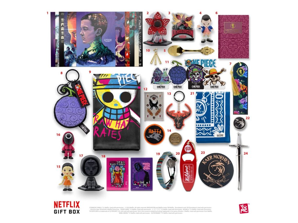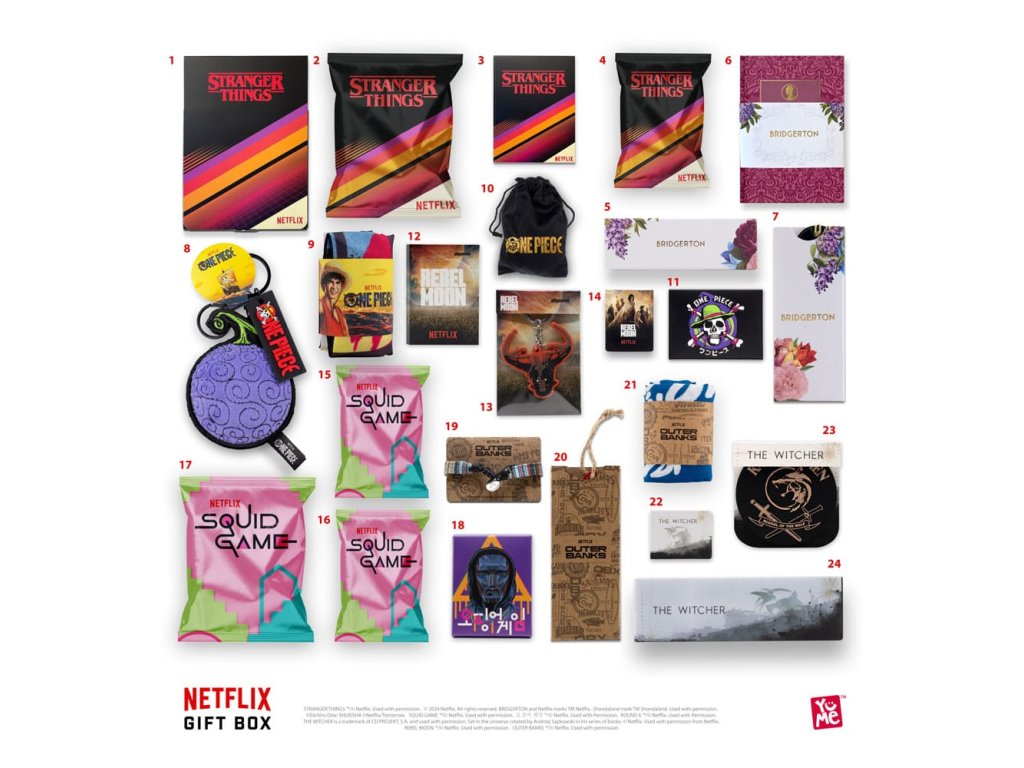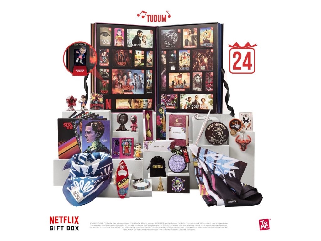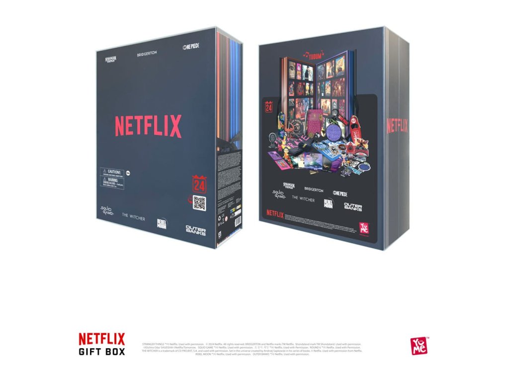 Pripravte sa na to, že vaše obľúbené seriály a filmy z Netflixu doslova vyletia z obrazovky a pristanú vo vašej obývačke. S 24 exkluzívnymi zberateľskými predmetmi z titulov ako Stranger Things, Bridgerton, One Piece, Game of Chaps, The Outer Banks, Rebel Moon a The Witcher sa fanúšikovia môžu rozhodnúť, či sa o svoje darčeky podelia s priateľmi a rodinou, alebo si ich nechajú pre seba!" Ponorte sa do očarujúceho sveta Netflixu s prémiovým darčekom, ktorý jedinečným spôsobom kladie na srdce najpopulárnejšie tituly Netflixu. Od praktických potrieb až po vzácne zberateľské predmety, každý suvenír je prezentovaný v balení šitom na mieru pre nezabudnuteľný zážitok zo spoločného rozbaľovania. 24 PRÉMIOVÝCH PREDMETOV VNÚTRA - Navrhnuté s 24 očíslovanými vnútornými priehradkami, ktoré odrážajú ikonické rozhranie Netflix, každý darček s prekvapením čaká, aby potešil vás a vašich blízkych. - NIEČO PRE KAŽDÉHO - Tento špeciálny darček vytvorený s láskou pre celú rodinu oslavuje sedem najobľúbenejších seriálov Netflix a prináša vzrušenie z obrazovky priamo do vašej obývačky. - ZVUKOVÝ ZÁŽITOK - Odhaľte kúzlo svojich obľúbených seriálov pri každom otvorení, sprevádzané nezameniteľnou melódiou "TUDUM", ktorá naplní vzduch a zachytí podstatu kúzla Netflixu - PREMIUM BALENIE - Dokonale spracovaná krabička je elegantne zapečatená saténovou stuhou, ktorá vás pozýva na cestu objavovania a spoločných chvíľ. - 7 OBĽÚBENÝCH TITULOV NETFLIX - Od strašidelných záhad Stranger Things po dobrodružstvo One Piece a od romantiky Bridgerton po nervy drásajúcu hru Chaps - tento poklad ponúka pre každého niečo. vyžaduje 3 x batérie AAA.