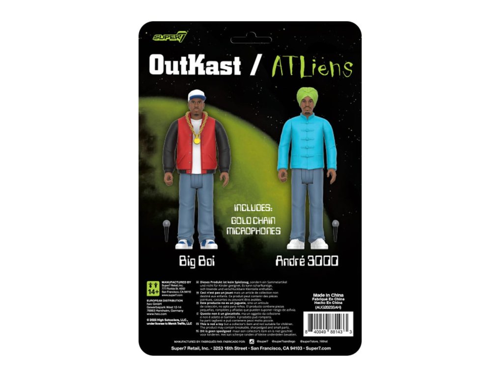 Vyhoďte ruky hore, pretože Southern Players sa pripájajú k našej sérii figúrok hudobných legiend - vítame OutKast v našej sérii figúrok ReAction! Tieto 3,75'' kĺbové figúrky OutKast ReAction predstavujú Big Boi a André 3000, sú inšpirované obálkou kultového druhého štúdiového albumu dua "ATLiens" a dodávajú sa v špeciálnom balení s dvojitou záložkou. Okrem toho, že každá figúrka sa dodáva s vlastným mikrofónom, Big Boi dostane aj odnímateľnú zlatú retiazku. Budete vyvrheľ, ak si necháte ujsť možnosť pridať do svojej zbierky toto dvojité balenie figúrok OutKast ReAction! - Inšpirované obálkou druhého štúdiového albumu skupiny OutKast "ATLiens" - Figúrky majú veľkosť 3,75'' a päť bodov artikulácie - Súčasťou je odnímateľná zlatá reťaz a dva mikrofóny - Ideálny darček pre každého fanúšika skupiny OutKast, zozbierajte celú sériu figúrok hip-hopových legiend od Super7!Dodatočné parametre