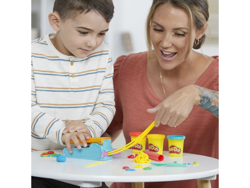 So sadou Play-Doh Starters Fun Fábrica sa dá vytvoriť toľko hravých diel z modelovacej hmoty! Táto stimulujúca hračka podporuje deti v zábavných zmyslových aktivitách a je skvelým nápadom na voľnú hru. S Fábricou Fun si môžete vybrať z 10 rôznych tvarov na vytláčanie, použiť zaujímavé formičky a tiež šablónové dráhy, ktoré sú uložené na hornej strane hračky. Súprava obsahuje 3 kelímky modelovacej hmoty Play-Doh v základných farbách (3x56 g). Play-Doh Starters Fun Fábrica je súčasťou radu Starters, ktorý ponúka kreatívnu zábavu pre malé deti od 3 rokov.