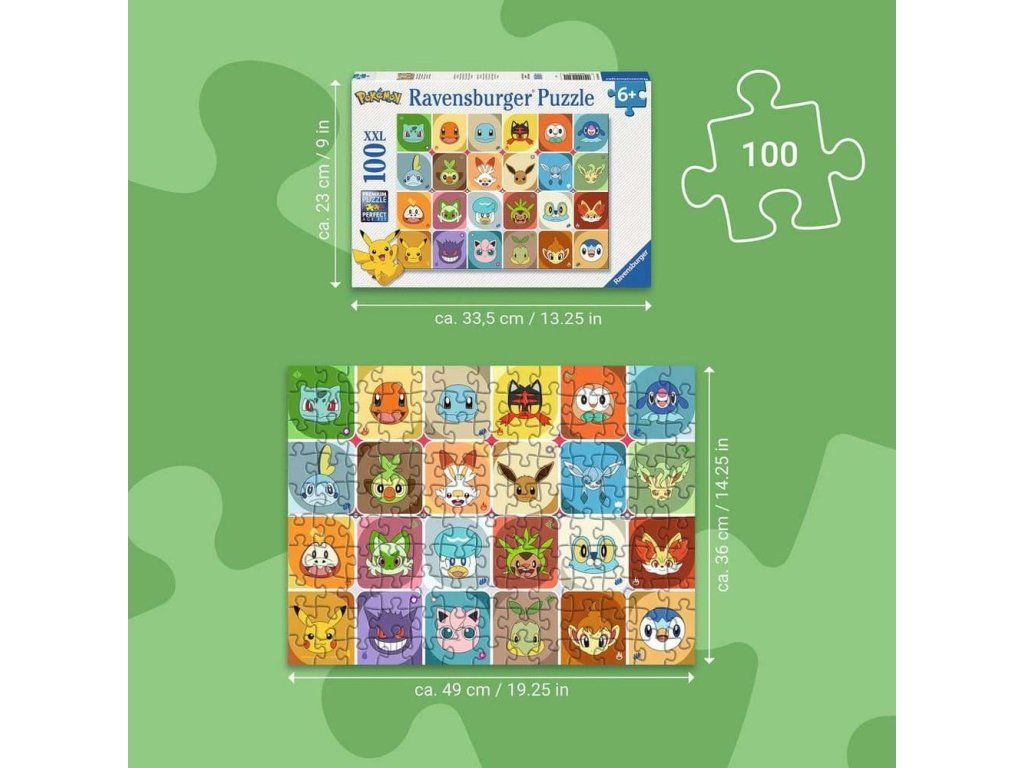 Toto puzzle od spoločnosti Ravensburger zobrazuje rôzne tváre Pokémonov. Skladá sa zo 100 dielikov vo formáte XXL. Hotové puzzle má rozmery 49 x 36 cm.Dodatočné parametre