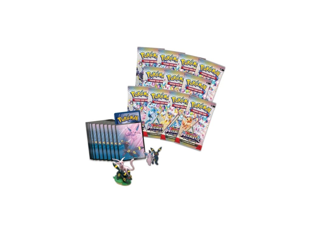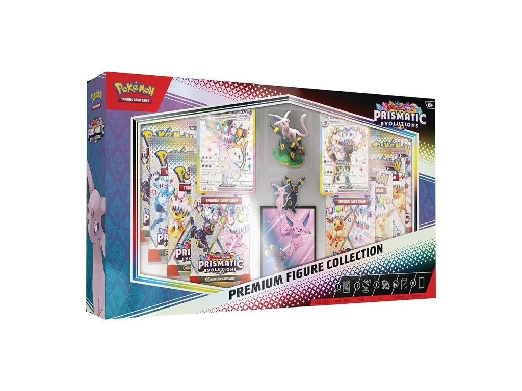 Vydaj sa na cestu Prismatic Evolutions s exkluzívnou verziou Premium Figure Collection! Táto zberateľská krabica obsahuje úchvatné promo karty Espeon ex a Umbreon ex v Prismatic, štýlovú figúrku Espeon a Umbreon, dizajnový špendlík, elegantné balenie a 11 boostrov z radu Prismatic Evolutions. Všetko je doplnené kartou s kódom na hranie online. Ideálna voľba pre fanúšikov Eevee evolutions a tých, ktorí hľadajú niečo špeciálne do svojej zbierky.