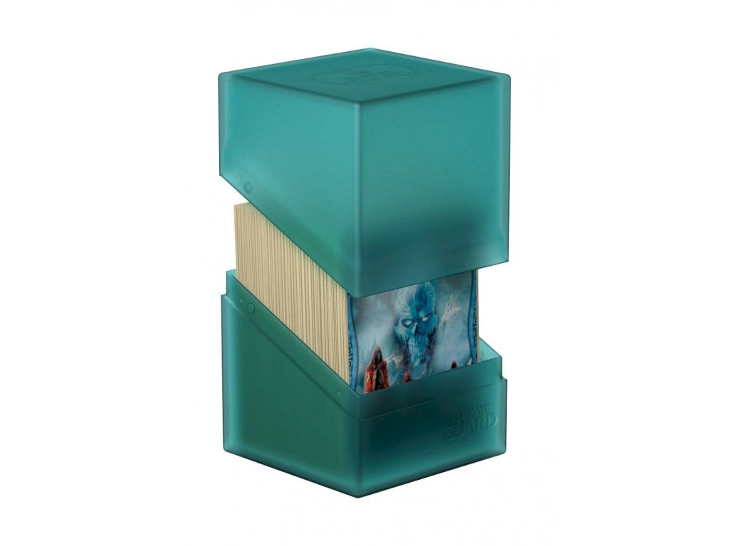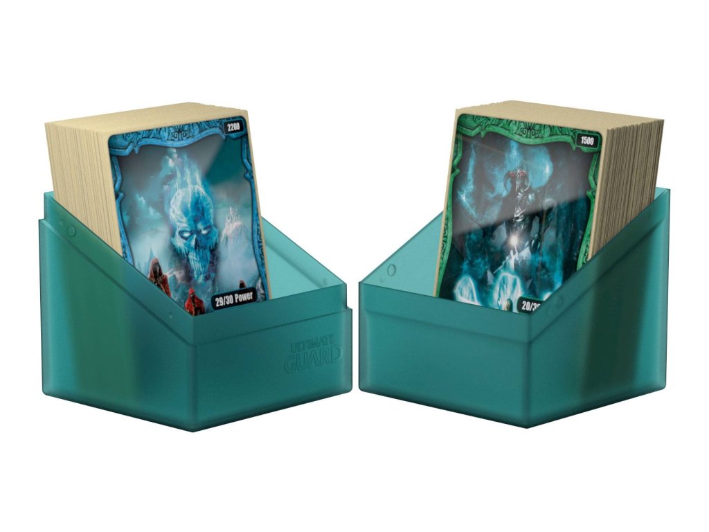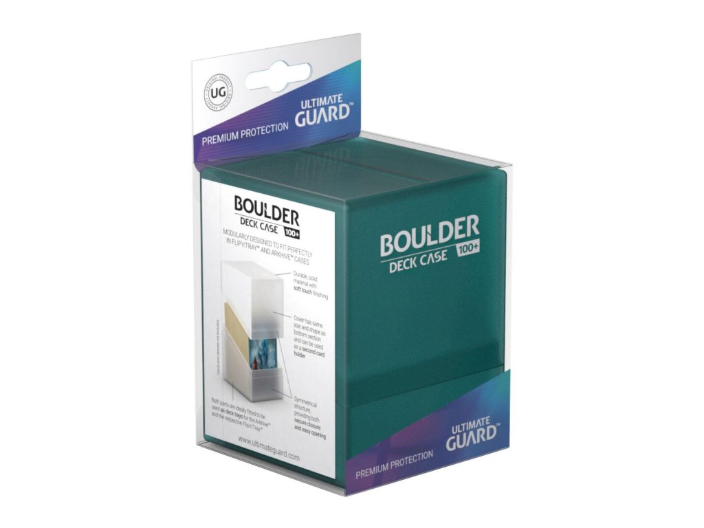 Vysokokvalitná a pevná ochranná škatuľa až na 100 kariet v dvojitých baleniach (alebo 120 kariet v jednotlivých baleniach Ultimate Guard*). Boulder je navrhnutý tak, aby pasoval na iné príslušenstvo Ultimate Guard (SuperHive, ArkHive alebo Flip 'n' Tray), a má bezpečné uzatváranie s pevným uzáverom. Farba "Malachit".