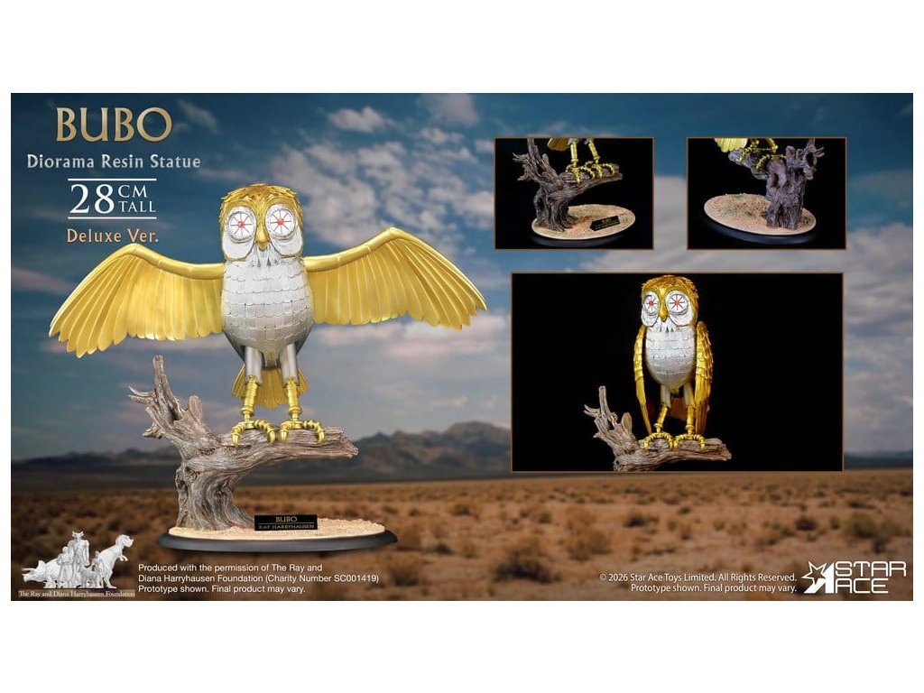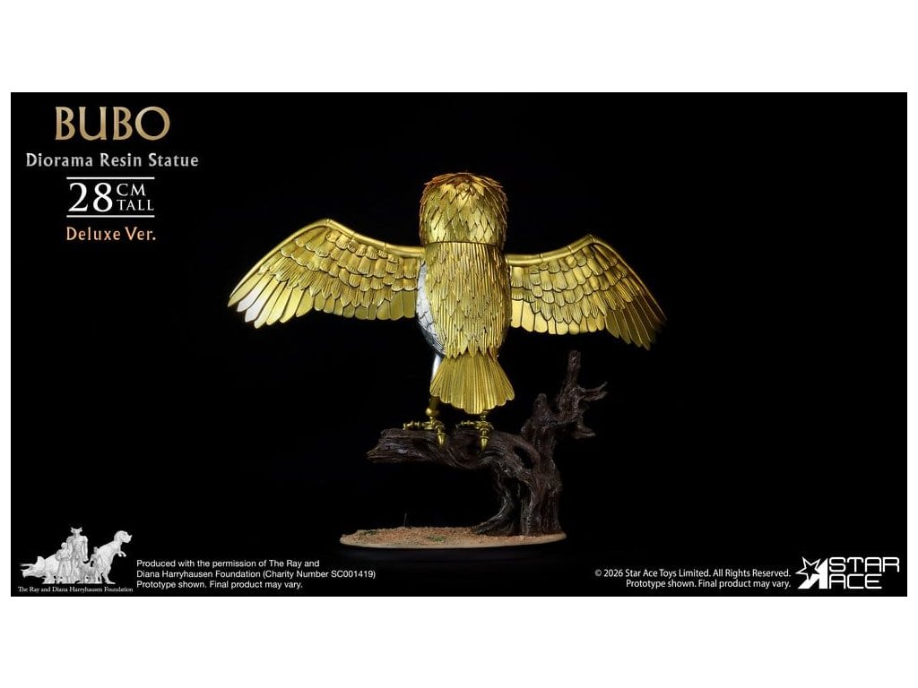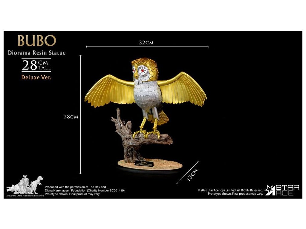 Hviezdne eso predstavuje novú verziu klasického tvora Raya Harryhausena, mechanickú sovu Bubo. Bubo, zlatá sova verná klasike Súboj Titánov z roku 1981, pevne sediaca na ošarpanej a ošarpanej vetve z posvätného hája na hore Olymp, je pripravená na novú výzvu. Táto vysoko detailná, ručne maľovaná polyresinová soška od Star Ace Toys dokonale zachytáva všetky legendárne detaily tohto kultového automatu. Bubo sa dodáva s vymeniteľnými krídlami pre rôzne možnosti vystavenia. Vyberte si pokojný vzhľad so zloženými krídlami alebo ich vymeňte, aby ste ho odhalili s majestátne roztiahnutými krídlami, vždy pripraveného na hrdinskú výpravu. Socha je vysoká 28 cm, táto nádherne vymodelovaná dioráma je pre zberateľov mimoriadne dôležitým kúskom, ktorý zachytáva jedinečné kúzlo a nekonečné dobrodružstvo klasického filmu. Prineste si domov hrdinovho najvernejšieho a najočakávanejšieho spoločníka.Dodatočné parametre