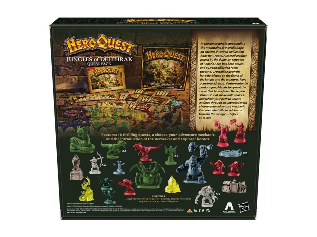 Dobrodružstvo pokračuje s balíkom úloh HeroQuest: Delthrak Jungle! V hustej džungli obklopujúcej hory na okraji sveta nachádza starobylá trpasličia civilizácia nové korene. Svätý artefakt, ktorý si cenili trpasličí utečenci z Kellarovej pevnosti, bol ukradnutý a nákaza zasiahla džungľu až po korene. Ako mocný Berserker alebo hrdinský Prieskumník prechádzajte džungľou a objavte, aké zlovestné tajomstvá sa skrývajú pod ich korunami - skôr, než bude všetko stratené! Vydajte sa po ceste, ktorá vedie k jedinečným záverom vďaka mechanike Choose Your Own Adventure. Obsahuje knihu úloh so 16 úlohami, 36 ilustrovaných herných kariet, 29 detailných figúrok a 39 obojstranných kartónových dielikov. (Na hranie je potrebný herný systém HeroQuest. Predáva sa samostatne. Dostupnosť môže byť obmedzená.) Táto hra ponúka neobmedzenú znovuhrateľnosť a umožňuje vytvárať vlastné úlohy a príbehy. Zhromaždite svojich priateľov a užite si napínavý večer pri hraní stolovej hry v boji dobra proti zlu. Pre 2-5 hráčov od 14 rokov.Dodatočné parametre