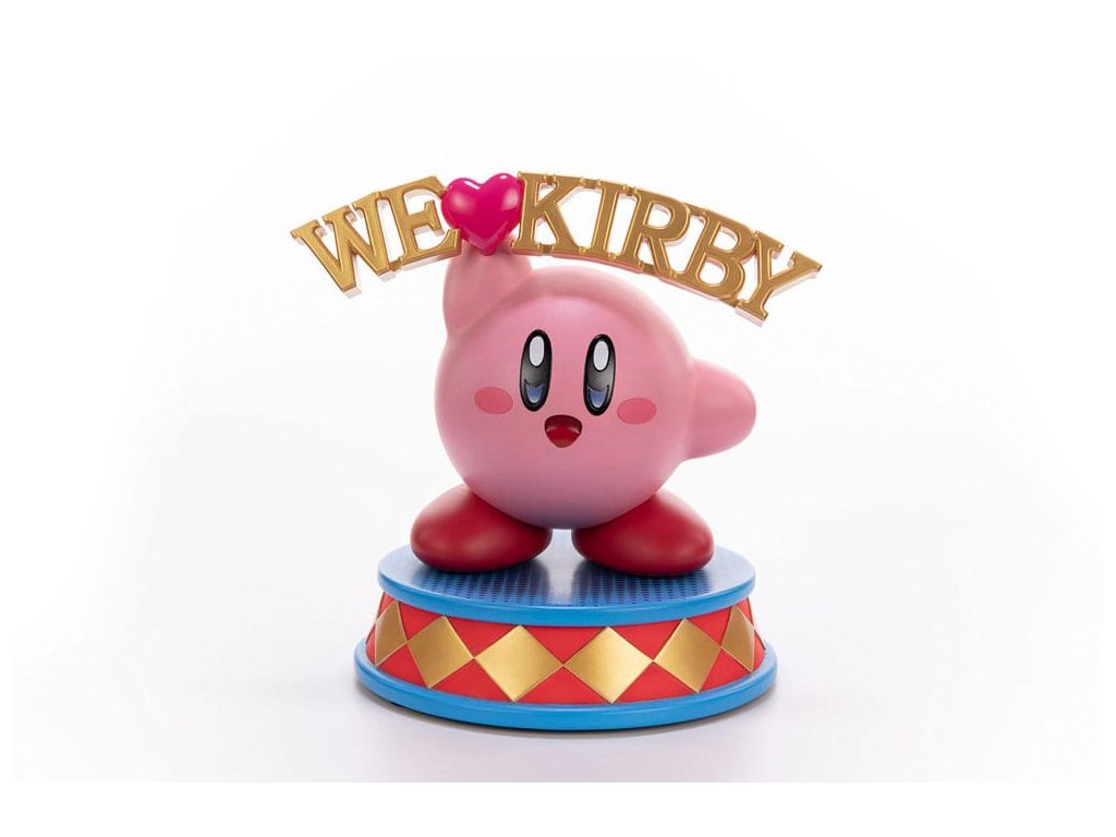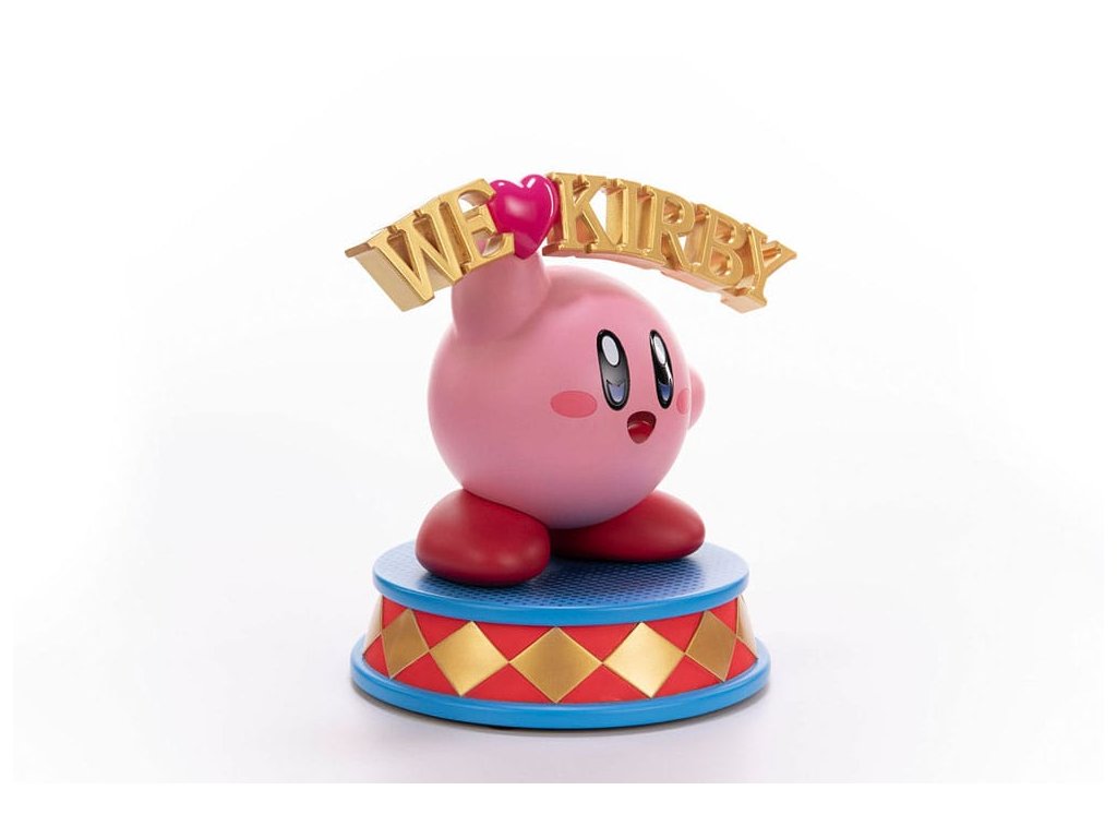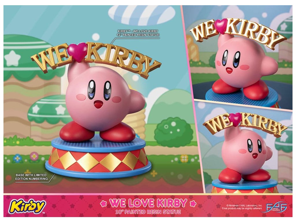 Socha je inšpirovaná nápisom "We Heart Kirby", ktorý sa objaví na zemi na konci hry. Socha "We Love Kirby" je nádherne zreplikovaná a drží sa pôvodného dizajnu. Nápis "We Heart Kirby" je vyobrazený zlatou farbou a srdce je výraznej metalickej ružovej farby. Lesklý lak v Kirbyho dúhovke s gradientom dodáva soche výraznejší vzhľad. Jeho telo a nohy majú matný povrch, čo kontrastuje so vzhľadom Kirbyho, ktorý drží samotný nápis. Na zvýšenie dynamického vzhľadu sochy má jej podstavec po stranách trojuholníky. Bol pokrytý červenými a zlatými odtieňmi, čo dodáva konštrukcii dynamiku. Zlaté pokovovanie má reflexný povrch, vďaka čomu vyzerá lesklo a zdôrazňuje sférický aspekt Kirbyho!" Súčasťou živicovej sochy Kirby - We Love Kirby je:- 24 cm socha Kirby - We Love Kirby z lakovanej živice- Podstavec navrhnutý v štýle Kirbyho umenia- Limitovaná číslovaná edícia- Certifikát pravosti.Dodatočné parametre