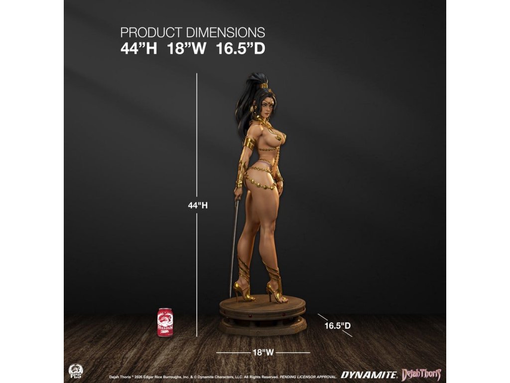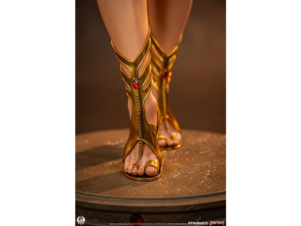 Štúdio Premium Collectibles s hrdosťou predstavuje úplne novú podobizeň ohrozenej princeznej Marsu, Dejah Thoris! Táto plne sochársky spracovaná socha v mierke 1:2 meria takmer 44" a zobrazuje hrdú vládkyňu, ako sebavedomo kráča s mečom v ruke. Verná marťanským zvykom Dejah ignoruje tradičné oblečenie a radšej sa zdobí radom nápadných zlatých šperkov. Aj dizajn jej šperkov pôsobí nadpozemským dojmom, ich organické špirály a krivky ladne priliehajú k Dejahinej postave. Žiarivé červené drahokamy dopĺňajú princeznin odev, od diadému až po sandále, a umocňujú jej kráľovský vzhľad. Úžasné remeselné spracovanie je viditeľné na celom tomto diele, od neuveriteľne realistickej farby na Dejahinej pokožke až po ohromujúci realizmus jej pohyblivých sklenených očí - táto socha polovičnej veľkosti sa nedrží späť. Nenechajte svoju princeznú zaháľať v nejakej marťanskej cele, zaobstarajte si sošku Dejah Thoris v mierke 1:2 od spoločnosti PCS ešte dnes! Rozmery výrobku: 111,8 x 45,7 x 41,9 cm (44 "V x 18 "Š x 16,5 "H)Dodatočné parametre