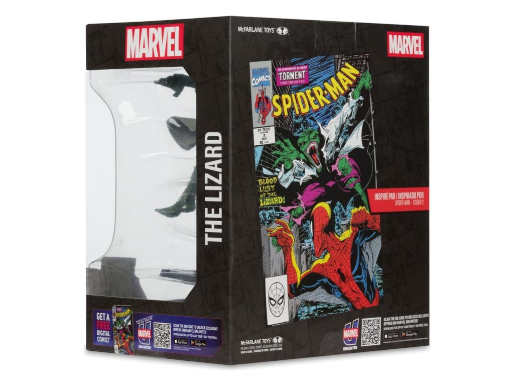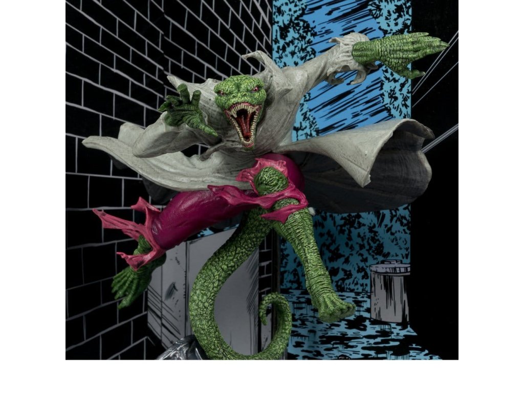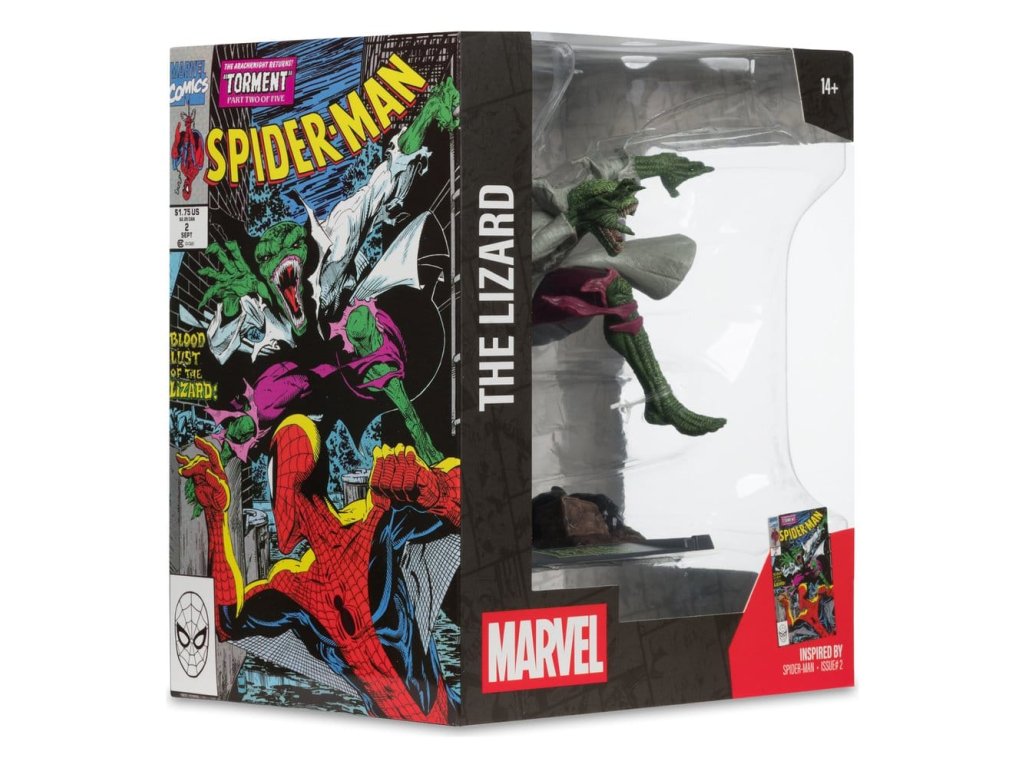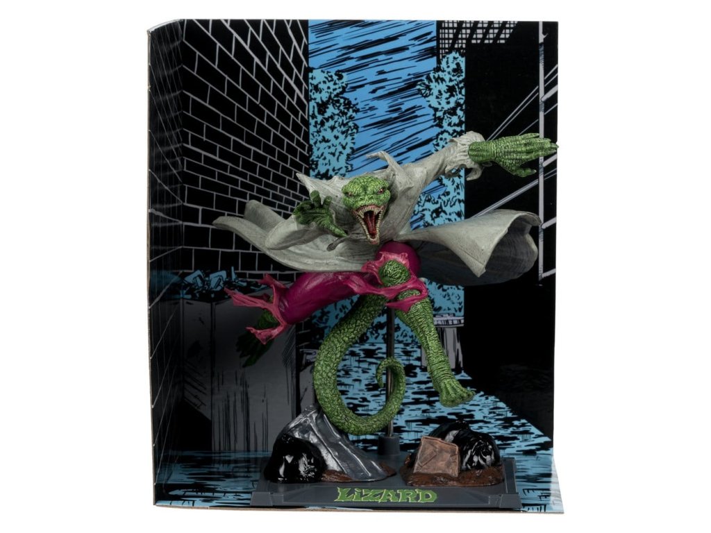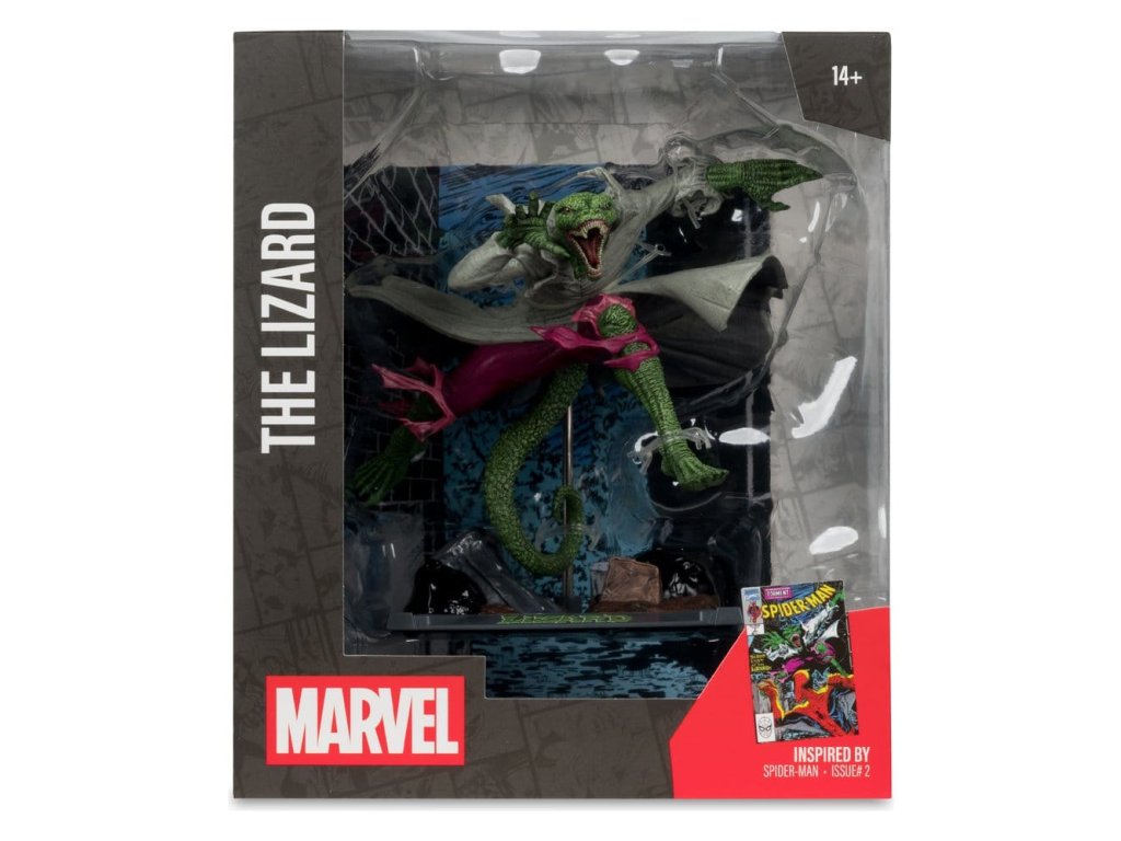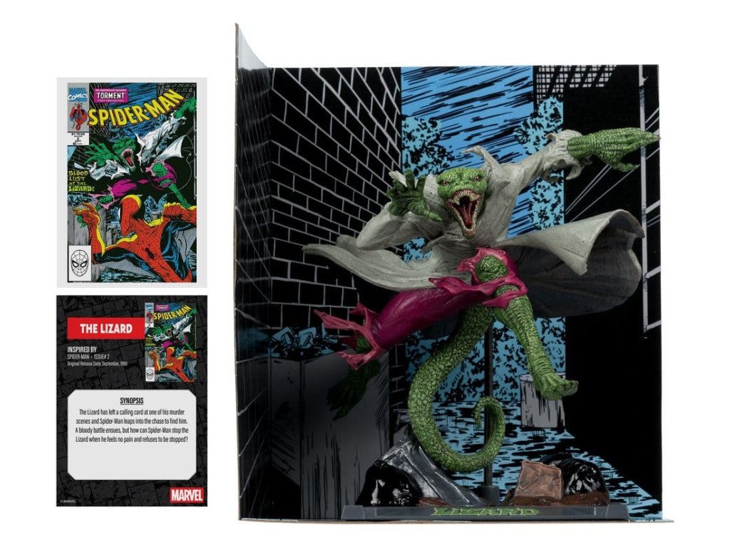Lizard nechal na jednom z miest činu svoju vizitku a Spider-Man sa ho vydal hľadať. Nastane neľútostný boj, ale ako môže Spider-Man zastaviť Lizarda, keď necíti bolesť a odmieta sa nechať zastaviť? Inšpirované vydaním komiksu Spider-Man #2- Zberateľská figúrka v mierke 1:10 s prostredím a scénou v pozadí- Súčasťou balenia je ilustrovaná karta s portrétom postavy od výtvarníka na prednej strane a zhrnutím deja komiksu- Zbierajte všetky hračky Marvel od McFarlane Toys. Približný dátum vydania: február 2026Dodatočné parametre