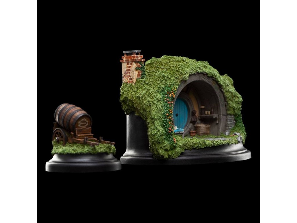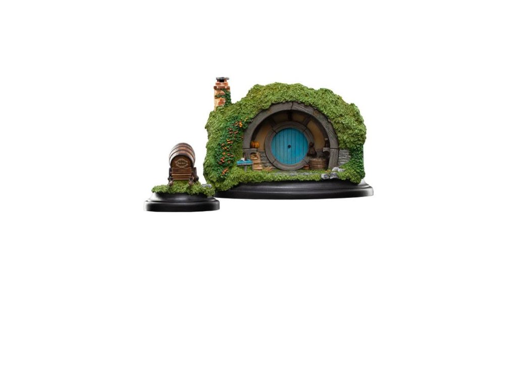 V diere v zemi žil hobit. Svetlé okrúhle dvere v letných farbách posialili svieže trávnaté kopce Hobitonu ako poľné kvety. Za každými dverami sa do zeme nepríjemne tiahnu nory: v každej žije hobit alebo rodina rumencov z Kráľovstva. Každá hobitia nora je jedinečná a vyjadruje osobnosť svojich obyvateľov prostredníctvom farieb, záhrad, nábytku a vidieckeho detritu každodenného života. Pod honosnými úsmevmi Bagshot Row a rozľahlého sídla Bag End sa okolo záhybov nižších svahov kopca vinie Hill Lane, kde sa nachádzajú niektoré zo skromnejších hobitích obydlí v Hobitone. Číslo 2A s nádhernými tyrkysovými dverami je jednou z týchto menších, ale napriek tomu rozkošných dier. Hovorí sa, že za teplého letného večera možno vidieť hobita, ktorý tu býva, ako si vychutnáva zaslúženú pintu Southfarthingu. Každý hobití príbytok je individuálny, čo priamo nabáda na kreatívne umiestnenie do vašej skrine. Vďaka plochej zadnej časti a malej hĺbke len 55 mm ich možno umiestniť na krby, kozuby, police a do okien. Toto rozkošné malé obydlie je presnou miniatúrnou kópiou filmovej scény, ktorú môžete navštíviť v Hobitíne Matamata na Novom Zélande. Navrhli ju tí istí umelci a remeselníci, ktorí pracovali na filme. Rozmery: 11,5 x 5 x 7 cm.Dodatočné parametre