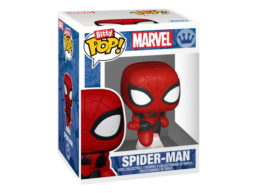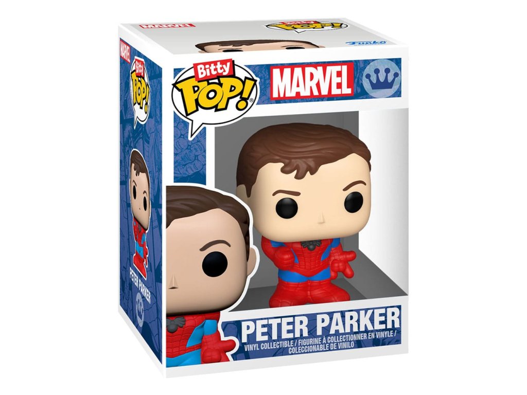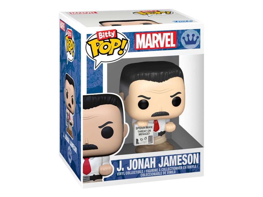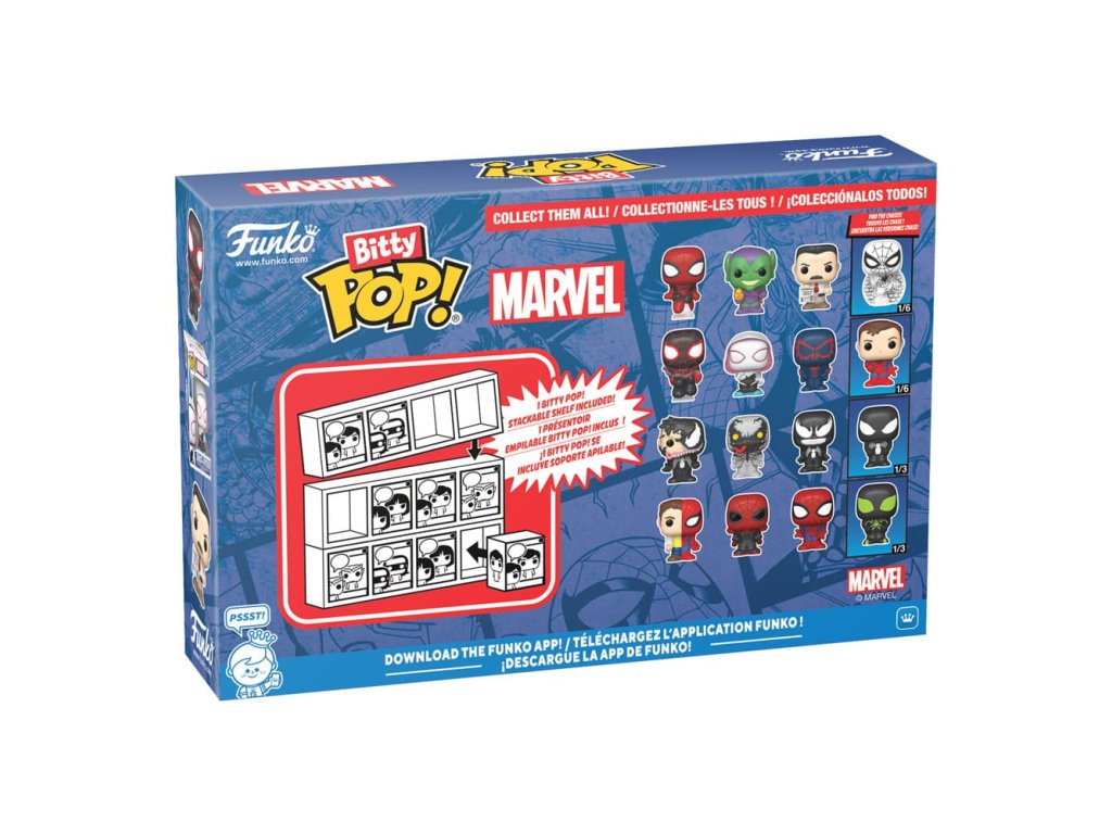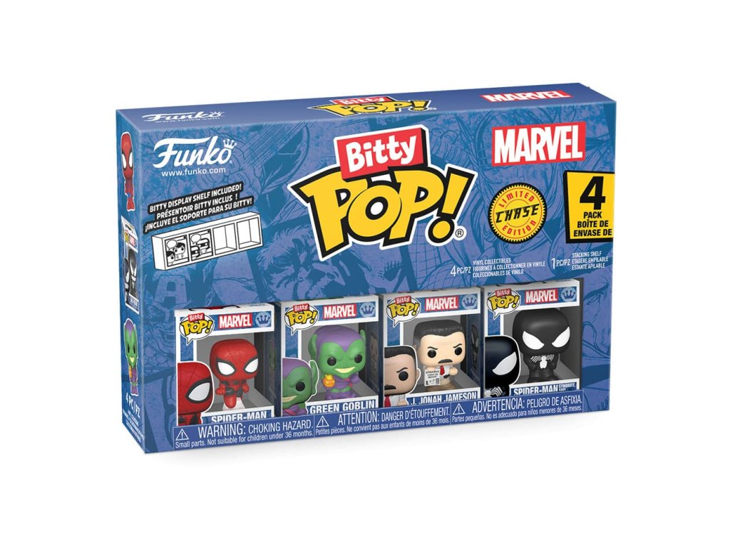 Zo série "Bitty POP!" od spoločnosti Funko prichádza toto balenie štyroch minifigúrok POP! z vinylu. Každá z nich je vysoká približne 2 cm a je zabalená v akrylovom obale s typickým dizajnom POP! Súčasťou balenia je aj prestaviteľný stojan, ktorý pojme všetky štyri figúrky. Balenie obsahuje: - Spider-Man - Green Goblin - J. Jonah Jameson - Chase Figúrka Zloženie sa môže líšiť od obrázkov kvôli figúrke Chase. Možné figúrky Chase sú: - Rare (1/3) Spider-Man - Stealth Suit - Rare (1/3) Spider-Man - Symbiote Suit - Hyper Rare (1/6) Peter Parker - Hyper Rare (1/6) Spider-Man - Spotlight.Dodatočné parametre