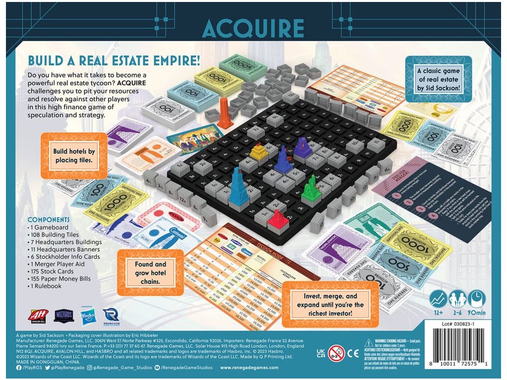 Ako mocný realitný magnát máš na svete len sedem hotelových sietí, ktoré stoja za tvoju pozornosť. Musíte využívať len svoje bohatstvo a dôvtip, aby ste mohli súťažiť s ostatnými obchodnými magnátmi a manipulovať s výstavbou a profitovať zo zlúčení - kupovať, predávať a obchodovať s akciami, aby ste dosiahli čo najvyššiu návratnosť svojich investícií. Acquire vás vyzve, aby ste v tejto hre plnej vysokých financií, špekulácií a stratégií postavili svoje zdroje a odhodlanie proti ostatným hráčom. Skutočne klasická strategická hra od majstra herného dizajnu Sida Sacksona. vlastnosti: - Plastová hracia doska, dieliky budov a centrála! Aktualizovaná veľkosť hracej dosky, mriežka 9x12 políčok s označením priestoru vytlačeným na hracej doske.- Nový font na dielikoch pre lepšiu čitateľnosť.- Klasický režim alebo režim veľkého biznisu - hrajte s bonusom za spojenie tretieho akcionára alebo bez neho. Obsahuje:- 1 hraciu dosku- 108 dielikov budov- 7 budov sídla- 11 vlajok sídla- 6 informačných kariet akcionárov- 1 pomôcku na zlúčenie hráčov- 175 kariet akcií- 155 bankoviek- 1 zásobník bánk- 1 prehľad pravidiel- Počet hráčov: 2-6- Pre vekovú kategóriu: 12+- Doba hry: 90 minút- Typ hry: Rodinná stratégiaDodatočné parametre