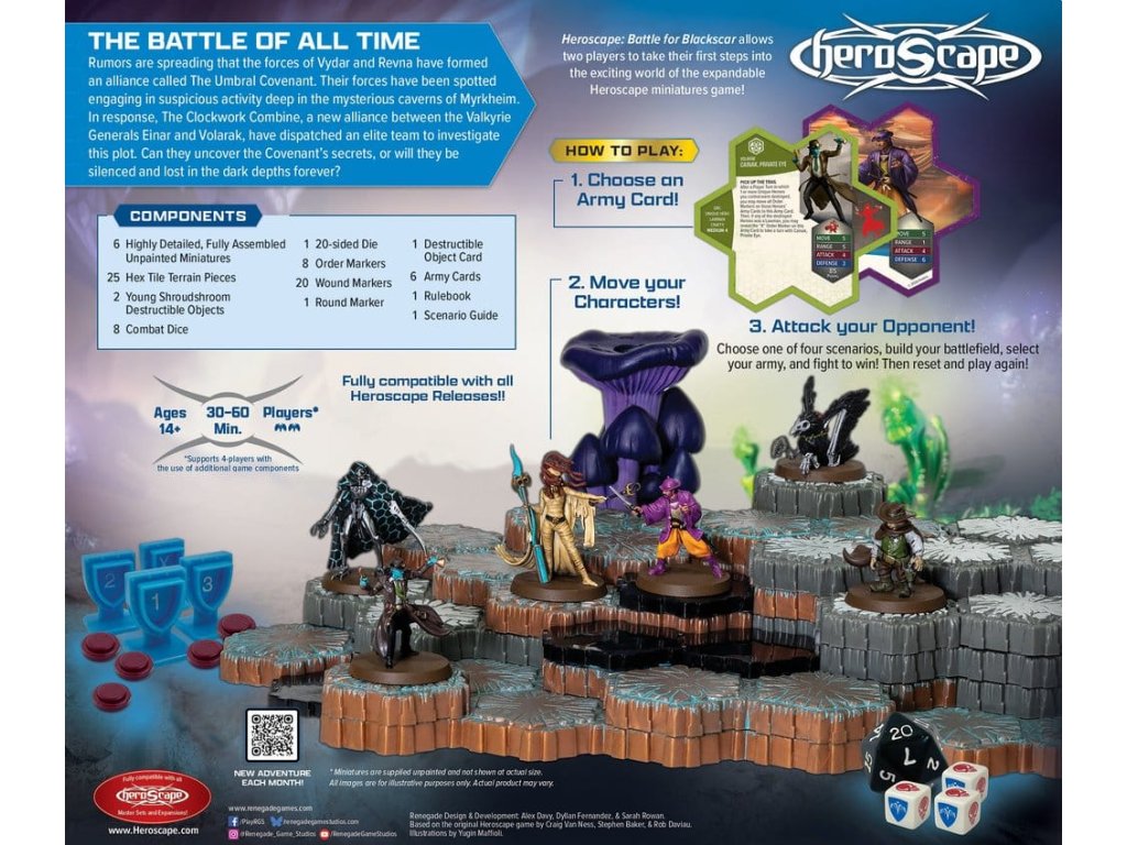 Vstúpte do tieňmi zahalenej divočiny Blackscar, kde sa o vládu bijú zabijaci, nemŕtve kráľovstvá, leteckí prieskumníci, neochvejní muži zákona a disciplinovaní samuraji. Tento bojový box predstavuje šesť úplne nových hrdinov a živú hubovú hrozbu, ktorá odvážnym, filmovým spôsobom nanovo zobrazuje bojisko. Vďaka dynamickým schopnostiam, sympatiám prechádzajúcim cez frakcie a dramatickým taktickým momentom ponúka Battle for Blackscar všetko, čo hráči milujú na hre Heroscape - obohatené o nové mechaniky a nezabudnuteľné postavy. Táto hra obsahuje viac ako 30 plastových miniatúr a klasickú hrateľnosť Heroscape s moderným nádychom! Blackscarská divočina je bojiskom. Ste pripravení na bitku?Vlastnosti - bojová krabica pre 2 hráčov so všetkým, čo potrebujete na hranie Heroscape!- obsahuje 6 úplne nových, vysoko detailných, nenamaľovaných miniatúr!- modulárny terénny systém s hexovými dlaždicami pre nekonečnú hru.- Predstavuje nové mechaniky a nezabudnuteľné postavy.Obsah- 1 pravidlá- 1 scenár- 6 vysoko detailných miniatúr- 6 kariet armády- 25 dielikov terénu Hex Tile- 2 zničiteľné objekty Young Shroudshroom- 8 bojových kociek D6- 1 20-stranná kocka- 8 značiek rozkazu- 20 značiek zranenia- 1 sledovač koliesPohľad- Pre vek: 14+- Typ hry: strategická hra- Hráči: 2Dodatočné parametre