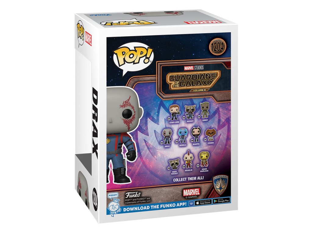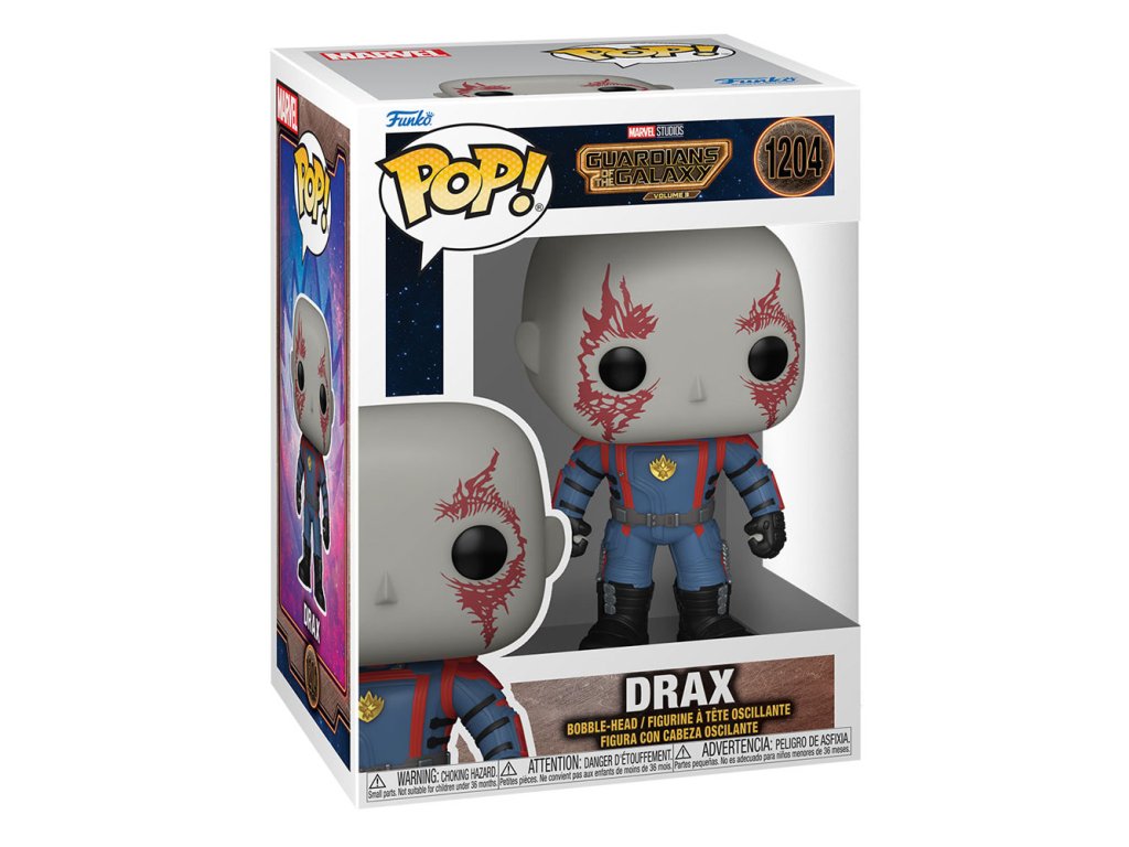 Čestný hrdina Drax je v uniforme Ravagerov. Vinylová "bobblehead" figúrka je vysoká približne 9,9 cm.