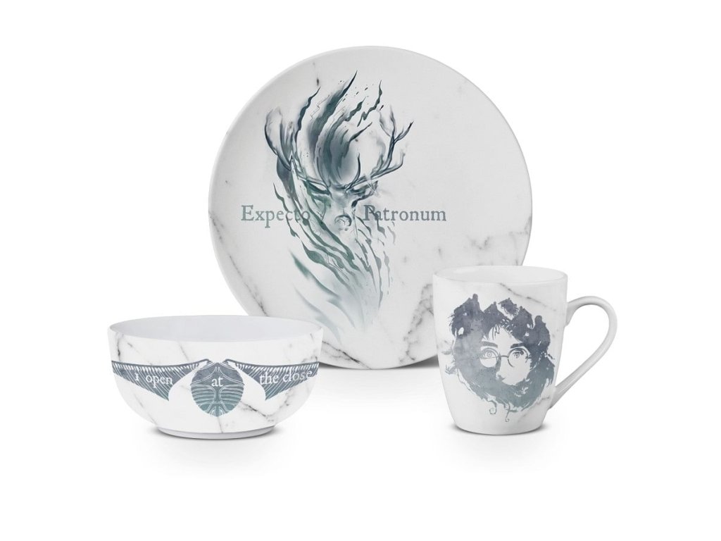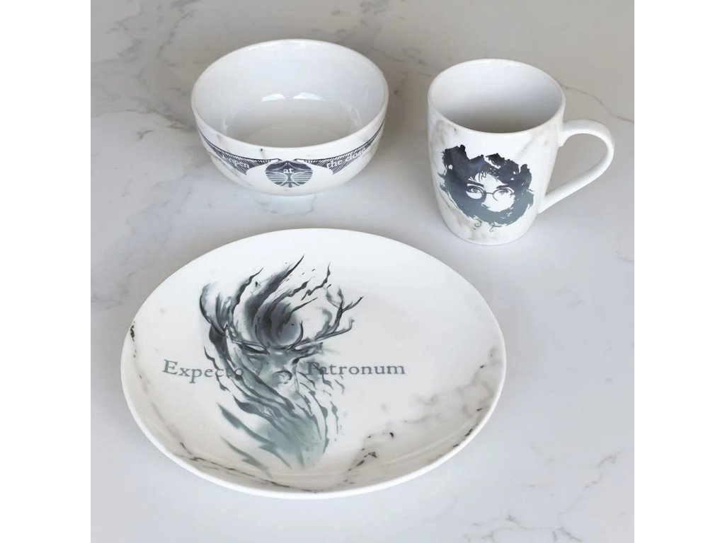 Luxusná darčeková súprava pre fanúšikov Harryho Pottera obsahuje hrnček, misku so zlatou palicou a tanier s grafikou kúzla Expecto Patronum. Darujte sebe alebo priateľom krásny darček a praktické vybavenie do domácnosti. Súprava je vhodná do umývačky riadu a mikrovlnnej rúry!Dodatočné parametre