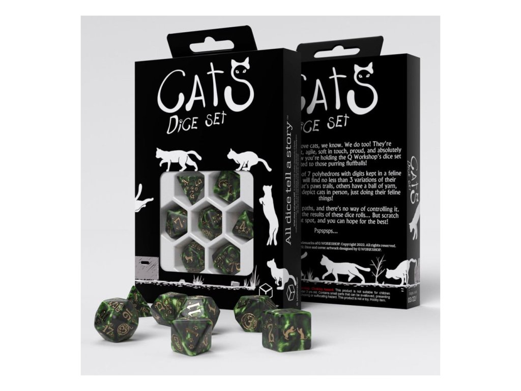 Tu je váš najcennejší poklad! QWORKSHOP predstavuje absolútny darček: sadu kociek CATS: Pixel. Tento obľúbený dizajn zobrazuje na vrchnej strane hravé mačky, ich každodenné činnosti a rôzne mačacie pózy. Fľaškovo zelený materiál zvýrazňuje ich tajomnú povahu, zatiaľ čo zlaté rytiny sú ako neoceniteľná odmena za mačkinu pozornosť! Táto súprava sa skladá zo 7 polyedrických kociek: D4, D6, D8, D10, D12, D20 a DOO. Táto súprava kociek je vedená v ľúbivom zeleno-zlatom farebnom motíve. Čísla na týchto kockách majú mačacie uši a sprevádzajú ich klbká priadze, misky s mliekom a odtlačky mačacích labiek! Každá kocka predstavuje na svojej vrchnej strane iný typ mačacej siluety!Dodatočné parametre