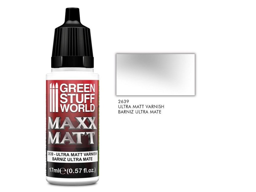 Green Stuff World: Maxx matný lak - Ultramate akrylový ultra matný lak chráni vaše modely a podstavce pred prachom, špinou, škrabancami a vlhkosťou. Odporúča sa nanášať v tenkých vrstvách. Objem fľaše 17 ml. Vhodný pre štetec a airbrush.Dodatočné parametre