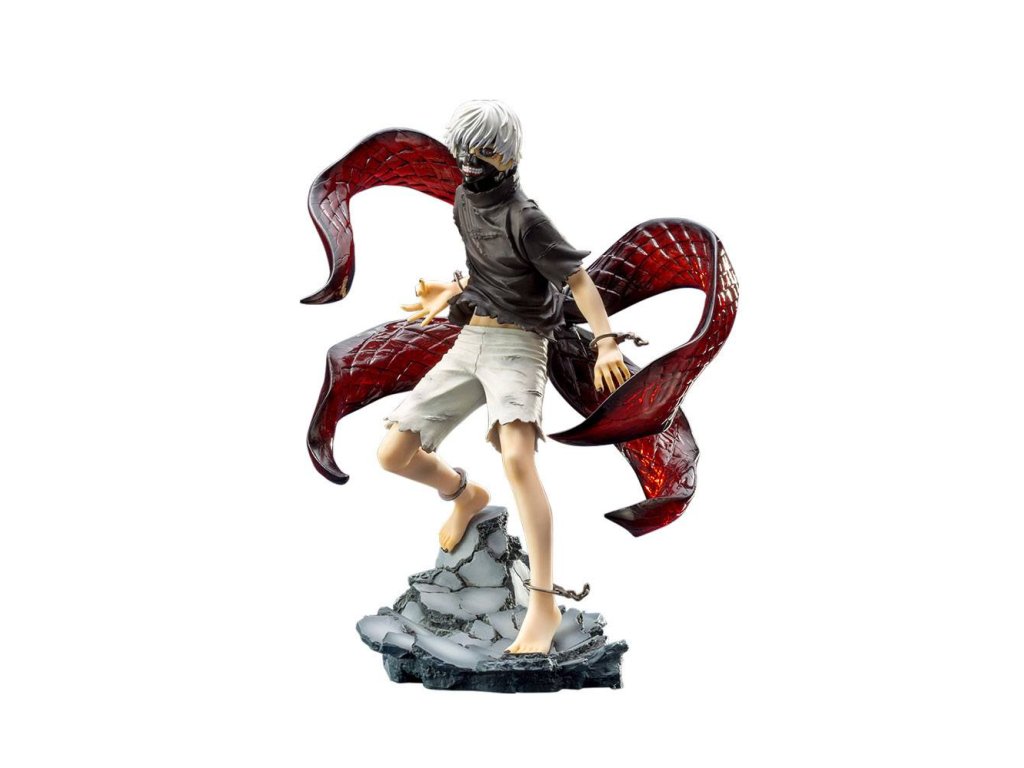 Najnovším prírastkom do radu Kotobukiya ARTFX J je premaľovaná verzia hlavnej postavy z filmu Tokyo Ghoul, ktorá ho zobrazuje v jeho plne nahovorenom stave polovičného ghúla, KEN KANEKI AWAKENED VER.! Ken bol kedysi normálny študent prvého ročníka univerzity, ale potom dostal transplantáciu ghúlskych orgánov, vďaka ktorej získal svoje schopnosti a alternatívnu podobu, ktorú tu predvádza. Polovičný ghúl stojí na zničenej základni z trosiek v uvoľnenej póze, pripravený zaútočiť. Ken má na sebe roztrhané sivé tričko a biele šortky... ale to sú len zvyšky jeho ľudského života. Po krku a tvári sa mu plazí hrôzostrašná ghúlovská maska, ktorá obsahuje očný štít, hoci je vidieť jeho úškrn a jedno úplne čierne oko. Samozrejme, prebudenie znamená, že sa uvoľní ghúlov "kagune"; Kenovo má podobu štyroch hrubých, jazyku podobných chápadiel, ktoré mu trčia z chrbta a vlnia sa okolo neho! Detailné prevedenie sochy a majstrovské použitie farby robia z tohto napoly človeka, napoly monštra skutočne pôsobivý exponát. Ken meria viac ako 23 cm (takmer 9 palcov) v 1/8 veľkosti.Dodatočné parametre