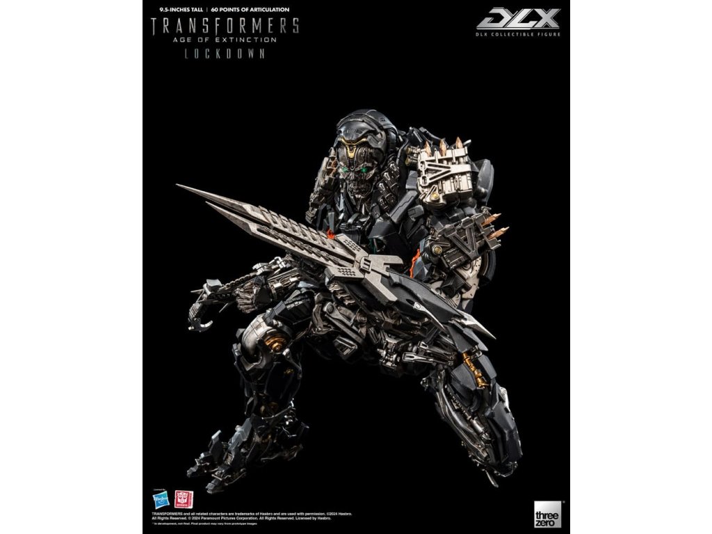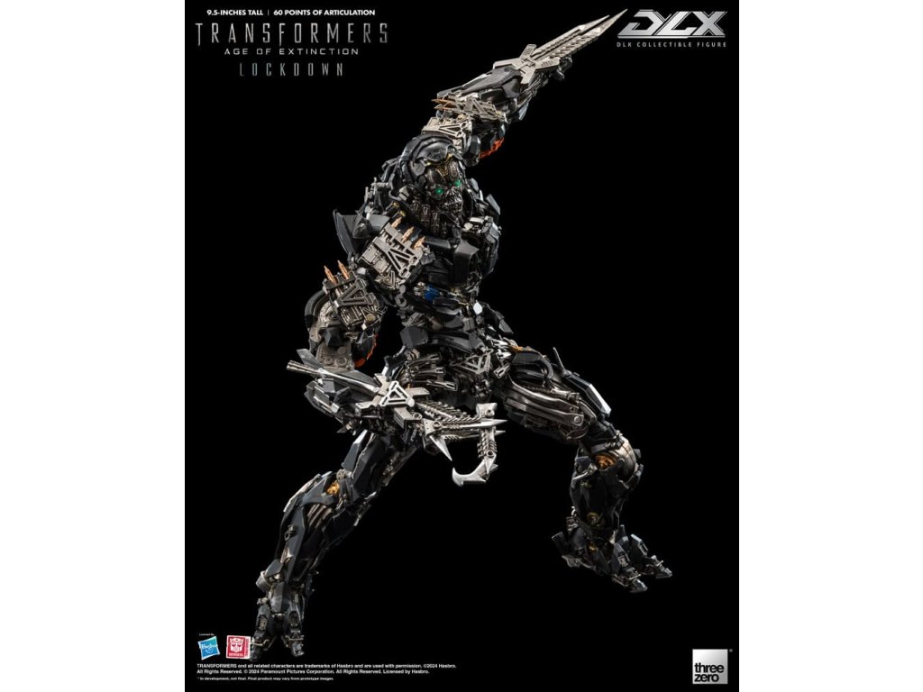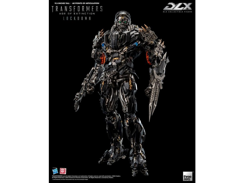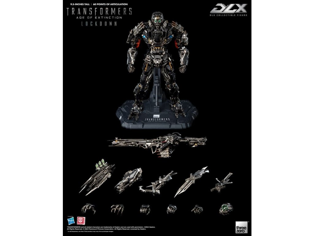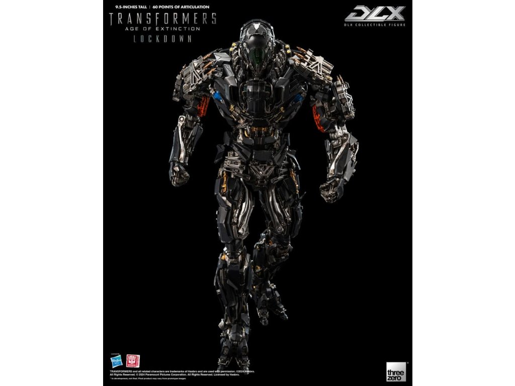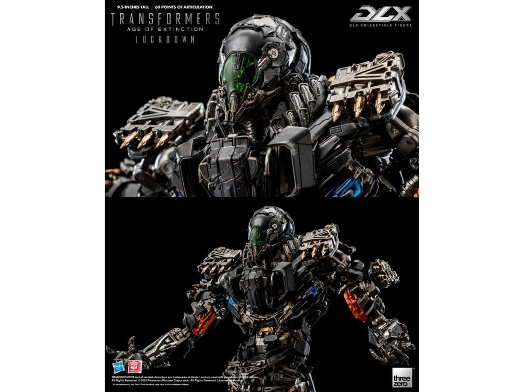 threezero hrdo predstavuje neslávne známeho lovca odmien a nájomného vraha z filmu Transformers: Age of Extinction, Lockdowna! DLX Lockdown z filmu Transformers: Age of Extinction je vysoký približne 24 cm a má približne 60 bodov ohybu. Figúrka má kovové diely odliate pod tlakom na konštrukcii z technického plastu, ktorá umožňuje dynamický rozsah pohybu, odolnosť a vynikajúcu stabilitu. DLX Lockdown sa vyznačuje mimoriadne detailným sochárskym spracovaním s charakteristickou zvetranou trojfarebnou farbou, ktorá kopíruje vzhľad, aký je vidieť vo filme, rôzne zbrane umožňujú rekonštrukciu rôznych bojových scén. DLX Lockdown sa vyznačuje ohromujúcim množstvom detailov. Jeho oči sú vybavené LED svetelnými efektmi (vyžadujú batérie AG13 x 2, batérie nie sú súčasťou balenia). Príslušenstvo zahŕňa bojovú masku s priehľadným dielom, tvárový kanón, vysávač iskier, blatník, hák, ručnú čepeľ a nôž. Bojovú masku možno magneticky pripevniť k hlave figúrky, tvárové delo a blatník sú vybavené LED svetelnými efektmi (každý z nich vyžaduje batérie AG3 x 2, batérie nie sú súčasťou balenia). V spojení so 4 sadami vymeniteľných rúk (jeden pár pästí, jedna ruka ukazujúca doľava, jeden pár akčných rúk a jeden pár rúk držiacich zbrane) a akčným stojanom DLX je výsledkom pôsobivá prezentácia. **Tento produkt má aj exkluzívnu výstavnú edíciu [3Z0881], ktorá obsahuje dodatočnú časť tváre s termokamerou a časť energetického jadra, ktoré obnovujú scénu z filmu, keď Lockdown loví Autobotov! VLASTNOSTI - oficiálne licencované spoločnosťou Hasbro - výška približne 9,5 palcov (24 cm) - Približne 60 bodov artikulácie - Kovový rám s prepracovanou artikuláciou - Detailný a zvetraný náter - LED svietiace oči* a zbrane* - Magnetická hlava diel#. Bojová maska s priehľadnou časťou# PRÍSLUŠENSTVO - 1 x bojová maska - 1 x tvárový kanón* - 1 x vysávač iskier - 1 x blatník* - 1 x hák - 1 x ručná čepeľ - 1 x nôž - 1 x vymeniteľné súpravy rúk: Jeden (1) pár pästí, jedna (1) ľavá ukazujúca ruka, jeden (1) pár akčných rúk a jeden (1) pár rúk držiacich zbraň - 1 x DLX LED akčný stojan VLASTNOSTI - Oči - Tvárové delo - Výstrely* Oči vyžadujú batérie AG13 x 2, batérie nie sú súčasťou balenia* Obe zbrane vyžadujú batérie AG3 x 2 (spolu 4), batérie nie sú súčasťou balenia.Dodatočné parametre