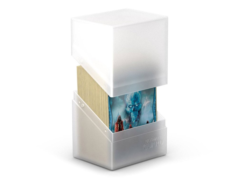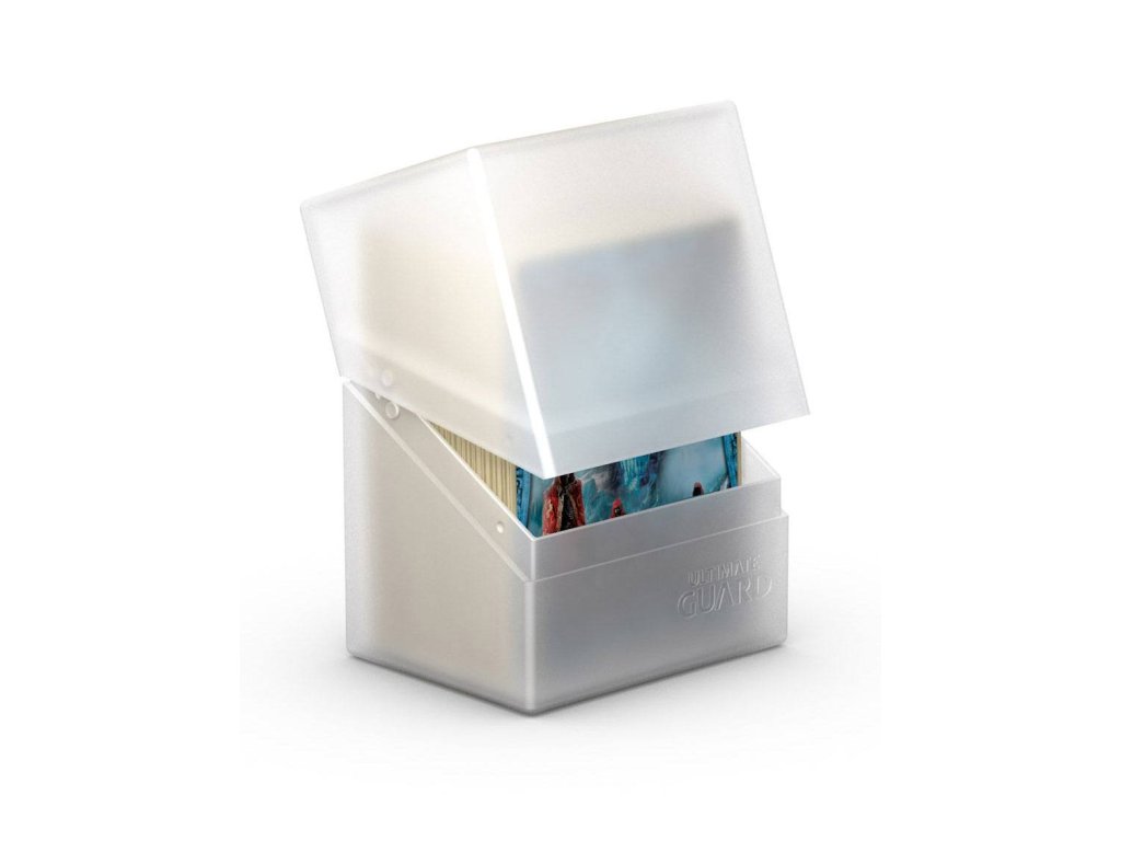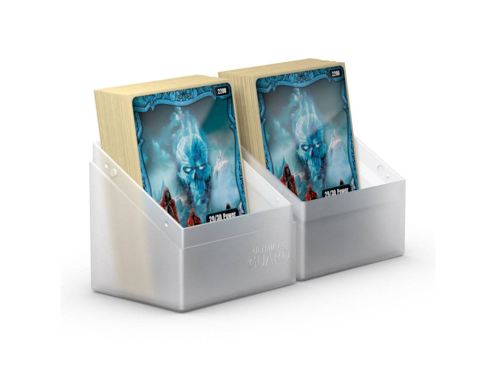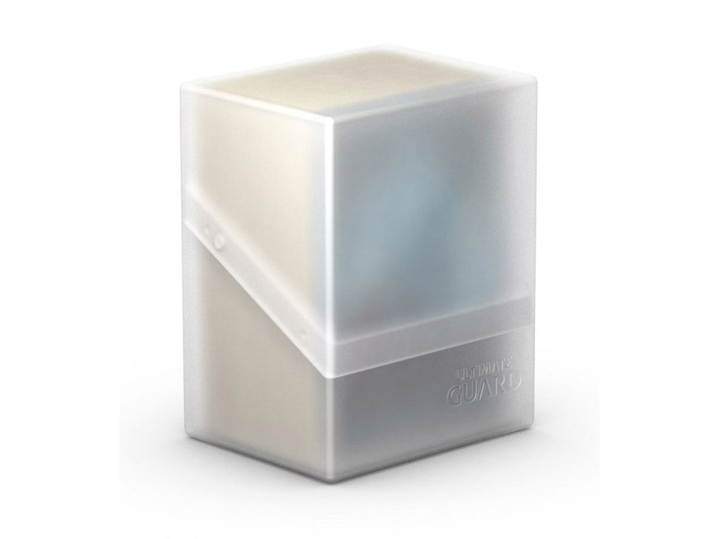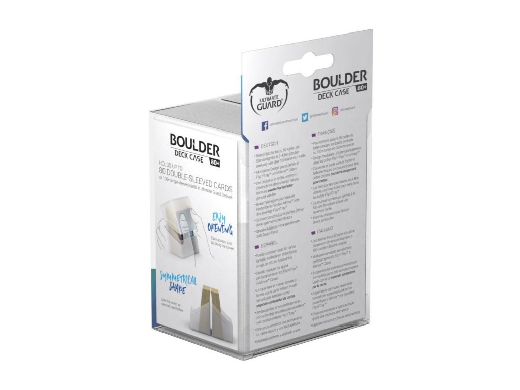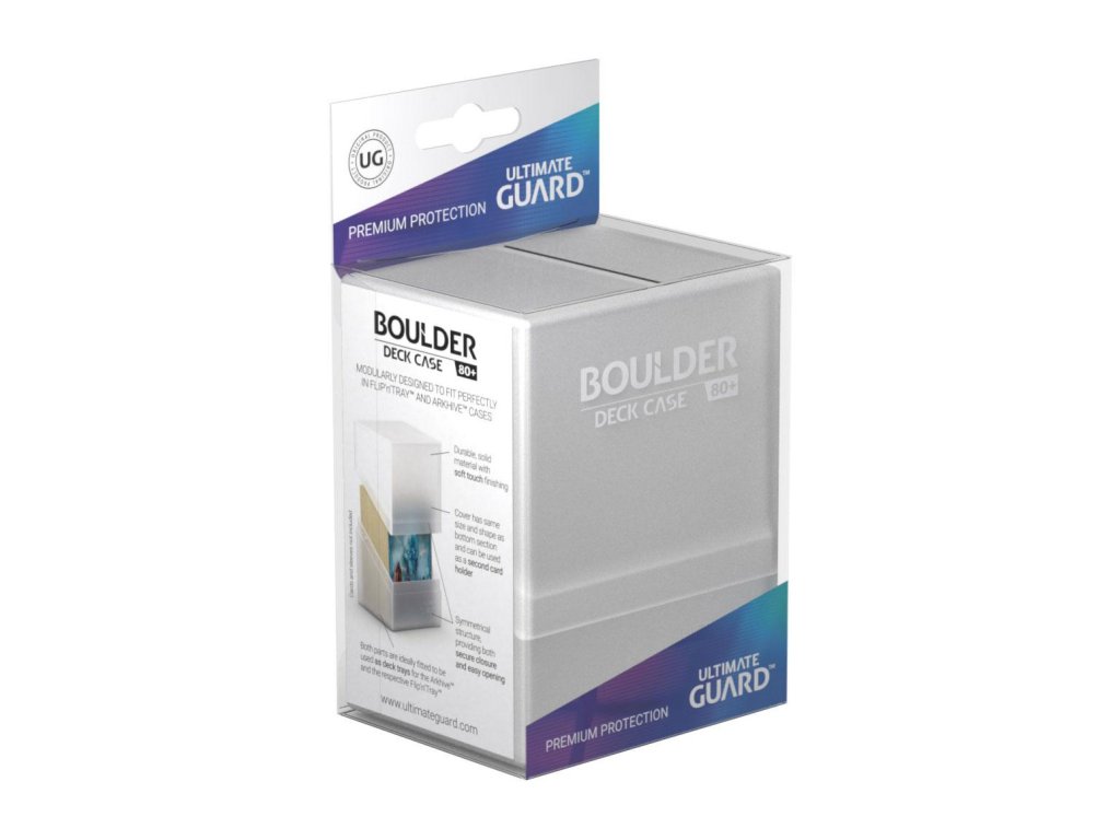 Vysokokvalitná a pevná ochranná škatuľa až na 80 kariet v dvojitých baleniach (alebo 100 kariet v jednotlivých baleniach Ultimate Guard*). Boulder je navrhnutý tak, aby pasoval na iné príslušenstvo Ultimate Guard (SuperHive, ArkHive alebo Flip 'n' Tray), a má bezpečné uzatváranie s pevným uzáverom. Farba "Frosted".