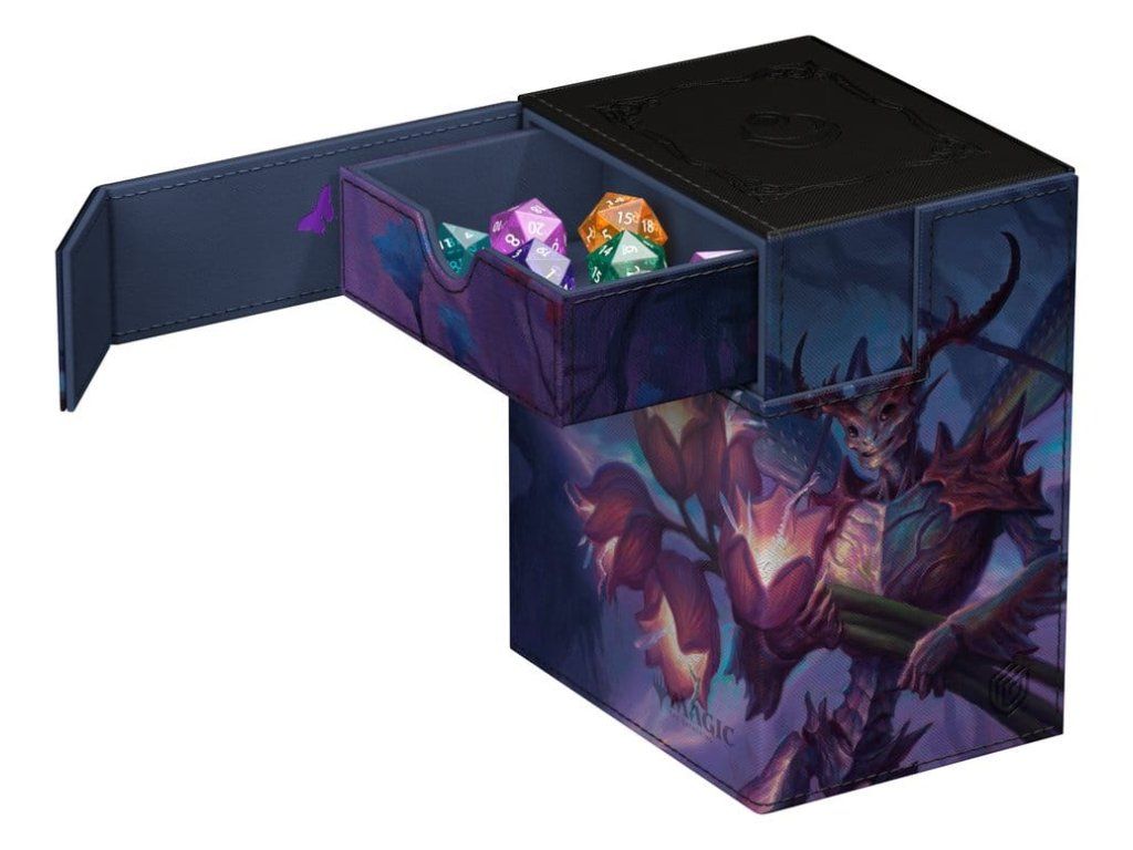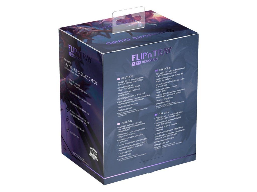 Flip'n'Tray 100+ Xenoskin od Ultimate Guard je prémiová krabička na karty MTG pre všetky formáty Magic (Commander/EDH, Modern, Standard atď.) s dvoma nezávisle prístupnými priehradkami - jednou na 100 kariet Ultimate Guard* v dvojitom puzdre a druhou na kocky a príslušenstvo. Flip'n'Tray 100+ s potlačou s oficiálne licencovanou grafikou zo sady Magic: The Gathering "Lorwyn Eclipsed" má odolný materiál Xenoskin, vnútornú podšívku z mikrovlákna a silné magnetické uzávery, ktoré zaručujú výnimočnú ochranu kariet. Táto krabička na karty je navrhnutá tak, aby sa dala kombinovať s ostatnými produktmi Ultimate Guard, a po vybratí zásobníka na karty sa do nej zmestí Boulder 100+.
