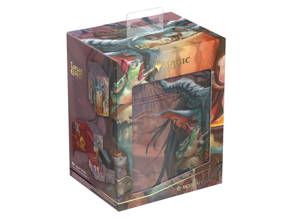 Ultimate Guard Flip'n'Tray 100+ Xenoskin je prémiová kartová škatuľa MTG pre všetky formáty Magic (Commander/EDH, Modern, Standard atď.) s dvoma samostatne prístupnými zásobníkmi - jedným na 100 dvojbalených kariet vo fólii Ultimate Guard* a druhým na kocky a príslušenstvo. Flip'n'Tray 100+ s oficiálne licencovanou grafikou zo sady Magic: The Gathering "Lorwyn Eclipsed" ponúka odolný materiál Xenoskin, vnútornú podšívku z mikrovlákna a silné magnetické uzávery pre výnimočnú ochranu kariet. Táto krabička na karty je navrhnutá tak, aby sa dala kombinovať s ostatnými produktmi Ultimate Guard, a po vybratí zásobníka na karty v nej môžete uložiť Boulder 100+.