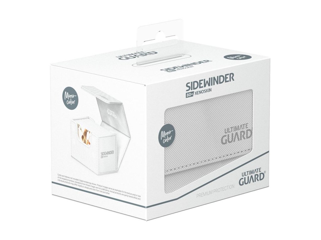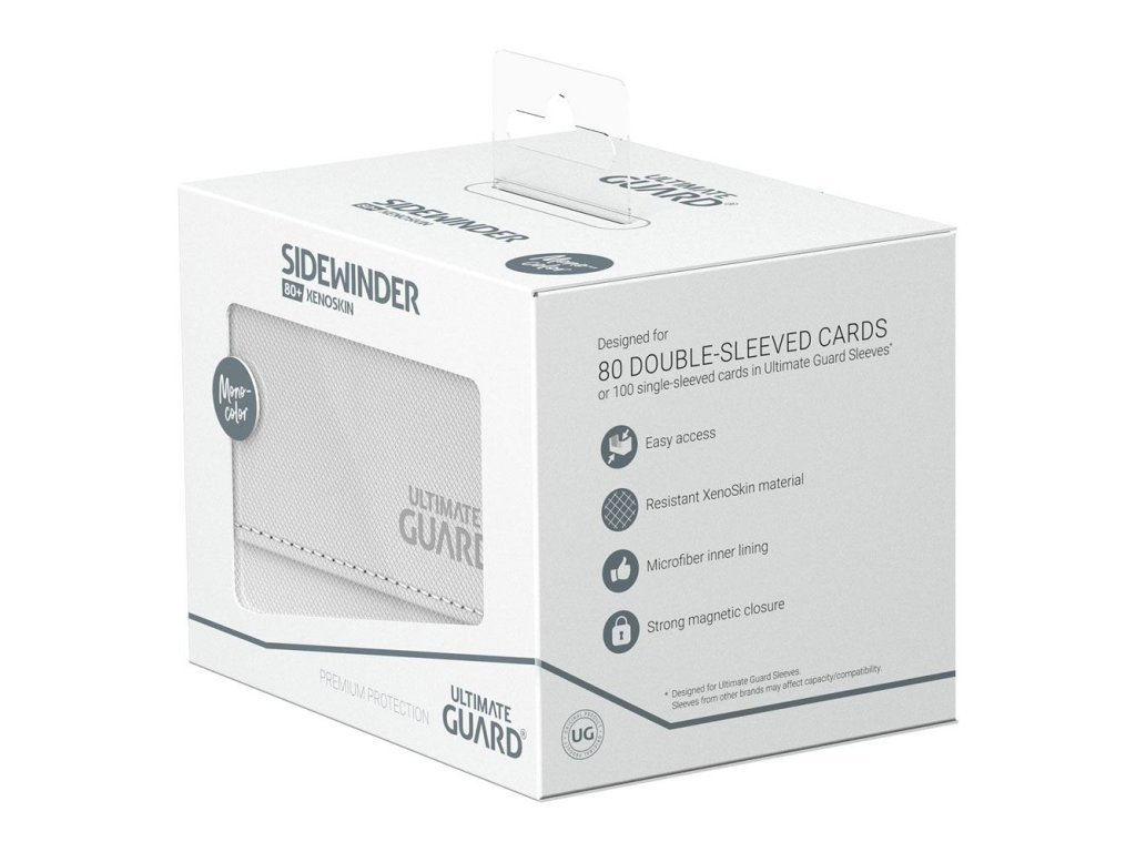 Náš praktický box na karty Sidewinder 80+ ponúka jednoduchý prístup k balíčku kariet z oboch strán. Krabička je optimalizovaná na 80 dvojbalených alebo 100 jednobalených štandardných kariet v obaloch Ultimate Guard. Žiarivý a elegantný jednofarebný dizajn vám umožní ukázať svoje farby zvnútra. Vďaka svojej modulárnej konštrukcii je Sidewinder dokonalým príslušenstvom pre Superhive 550+. Chráňte svoje karty so štýlom! - Navrhnutý na 80 dvojbalených alebo 100 jednobalených štandardných kariet v obaloch Ultimate Guard* - Modulárny dizajn na kombinovanie s produktovým radom Ultimate Guard - Jednoduchý prístup - Odolný materiál XenoSkin - Jednofarebný dizajn s kvalitnou vnútornou podšívkou z mikrovlákna - Silný magnetický uzáver *Navrhnutý pre obaly Ultimate Guard. Obaly iných značiek môžu ovplyvniť kapacitu/kompatibilitu. Približne 104 x 77 x 78 mm hrubé rozmery. Vnútorné rozmery približne: 94 x 59 x 69 mm.Dodatočné parametre