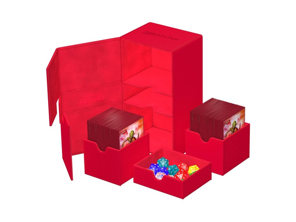 Jeden box, dva balíčky kariet a extra priehradka na príslušenstvo: náš Twin Flip'n'Tray 200+ ponúka všetky funkcie, ktoré skvelý box na karty potrebuje. Tento box je dvakrát väčší ako náš klasický Flip'n'Tray 100+ a je vhodný pre tých, ktorí hľadajú väčšiu možnosť. Do boxu Twin Flip'n'Tray 200+ sa zmestí 200 kariet s dvojitým puzdrom alebo 240 kariet s jednoduchým puzdrom v štandardnej veľkosti*.- Navrhnutý tak, aby pojal 200 kariet s dvojitým puzdrom alebo 240 kariet s jedným puzdrom štandardnej veľkosti v obale Ultimate Guard*- Modulárny dizajn na kombináciu s produktovým radom Ultimate Guard- Odnímateľné priehradky na karty a príslušenstvo- Nezávislý prístup k jednotlivým priehradkám- Odolný materiál Xenoskin- Jednofarebné vyhotovenie s vysokokvalitnou vnútornou výplňou z mikrovlákna- Silné magnetické uzatváranieRozmery cca.114 x 203 x 90 mmPriehradka na karty (2x) (vnútorné rozmery) cca: 100 x 77 x 81 mmPriehradka na karty (2x) (vnútorné rozmery) cca: 68 x 59 x 70 mmPriehradka na kocky (vnútorné rozmery) cca: 100 x 34 x 81 mmPriehradka na kocky (vnútorné rozmery) cca: 91 x 27 x 70 mm* Určené pre obaly Ultimate Guard. Obaly iných značiek môžu ovplyvniť kapacitu/kompatibilitu.Dodatočné parametre